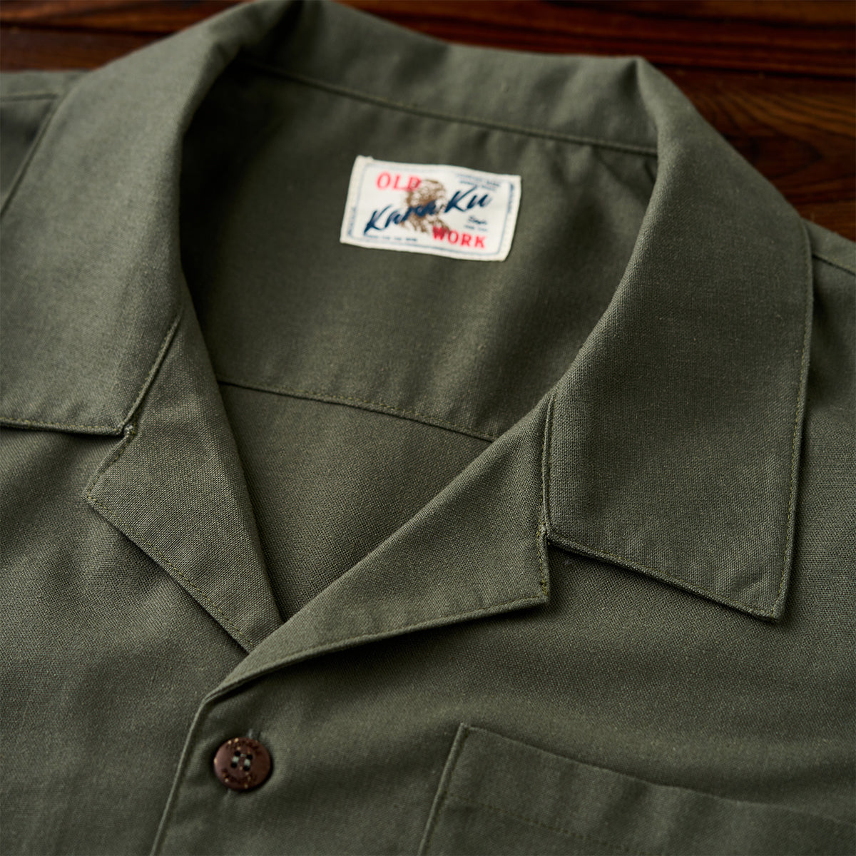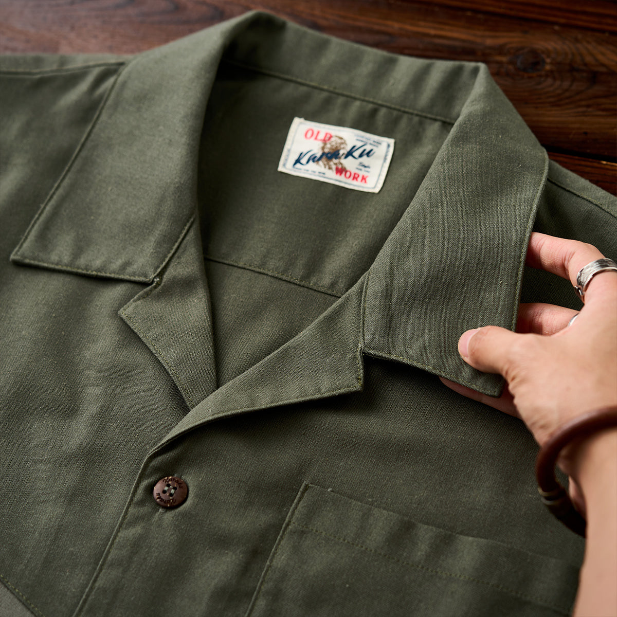 「KaraKu」ロゴ刺繍 ターコイズ風ボタン付き半袖シャツ