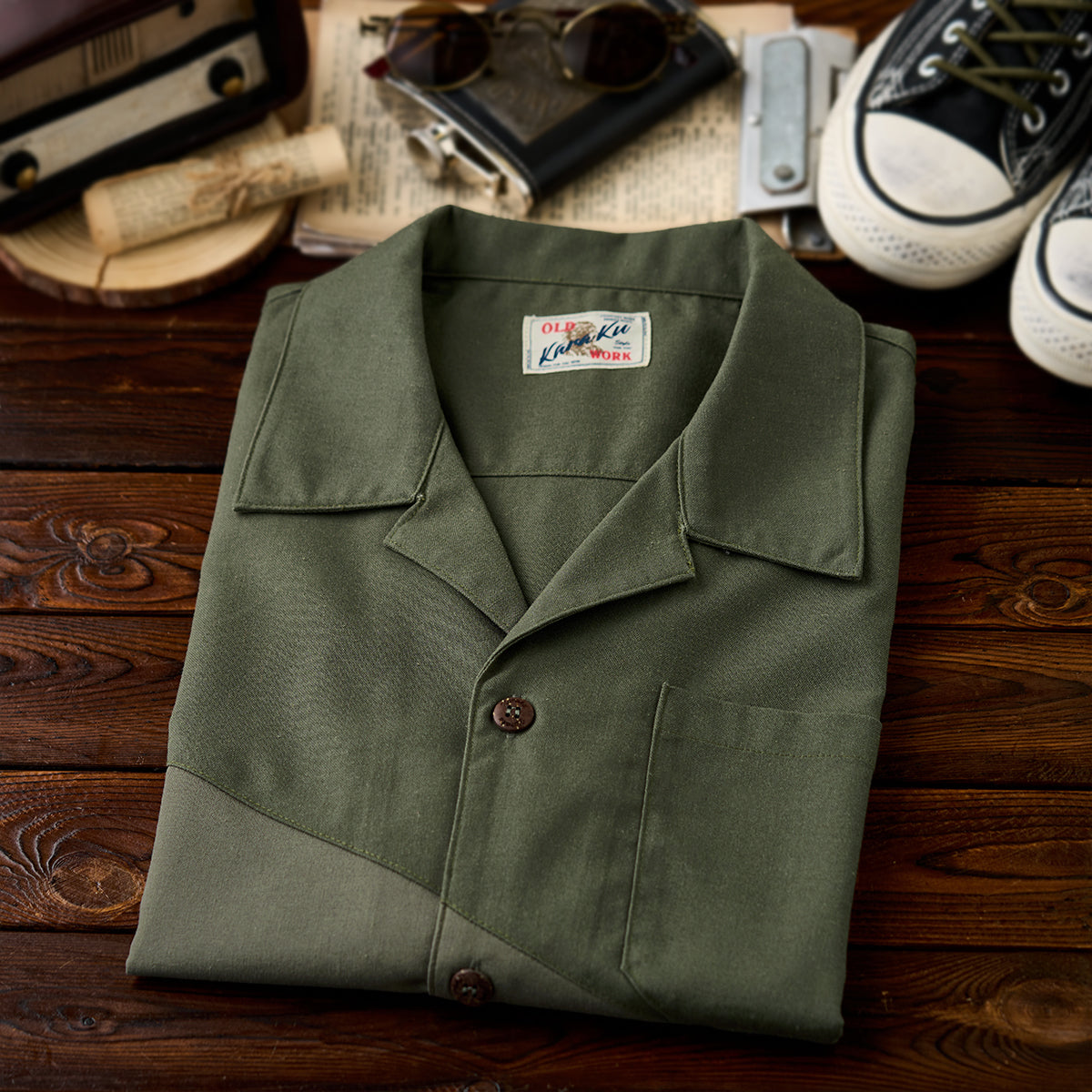 シンメトリーサンダーバード刺繍入り ワントーンキューバカラーシャツ