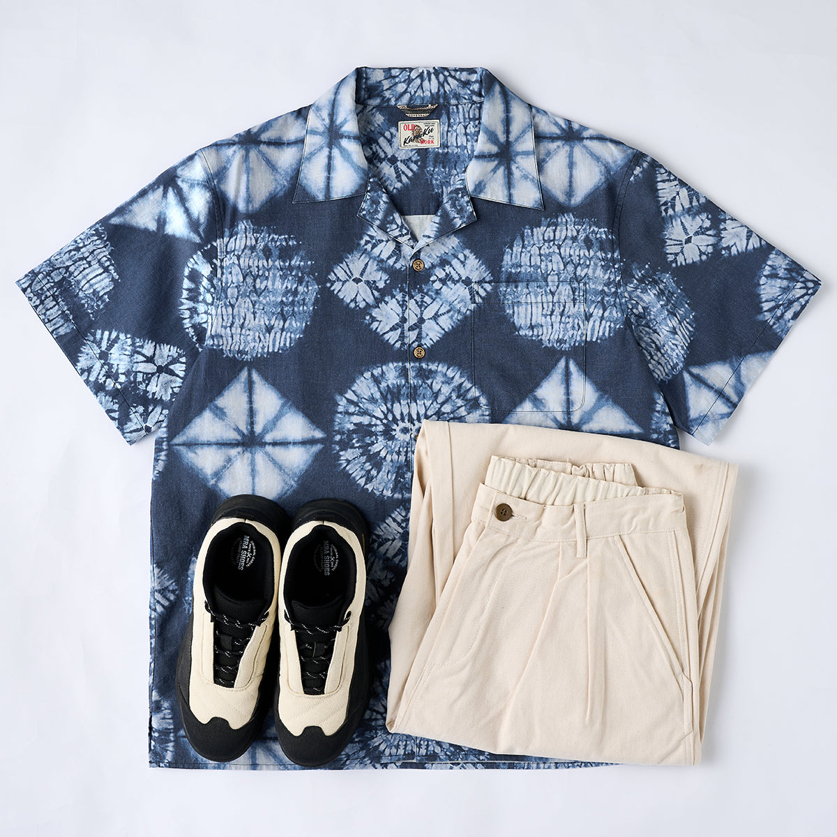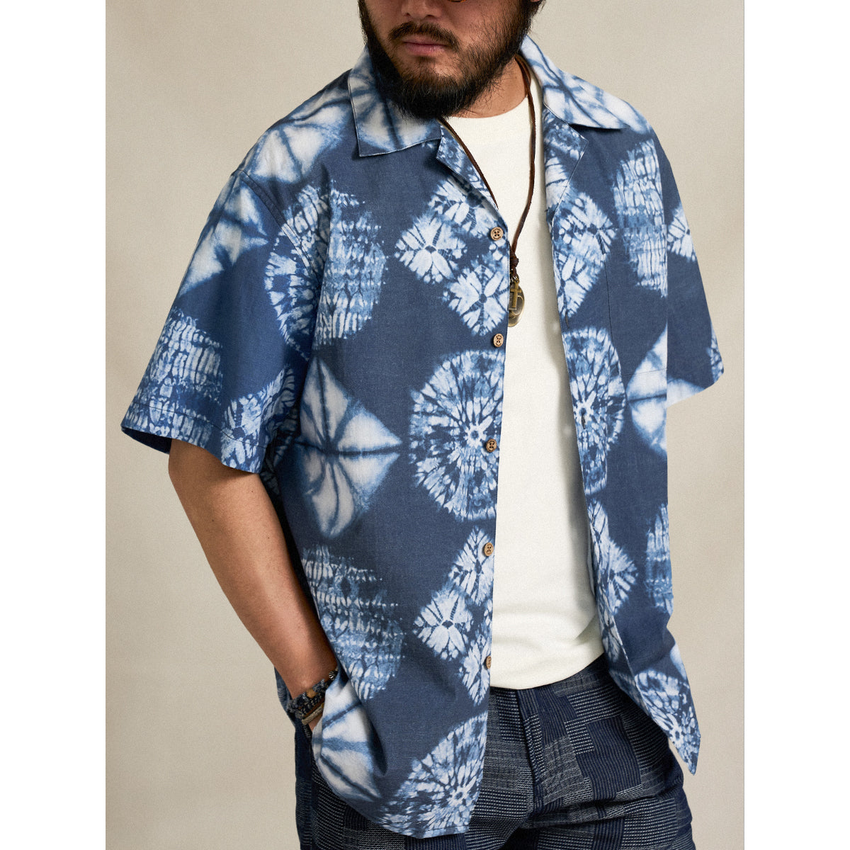 デニムやショートパンツ、サンダルと合わせることで、リラックスしたカジュアルスタイルが完成します。無地のホワイトやベージュのパンツと合わせ、シャツの柄を際立たせます。