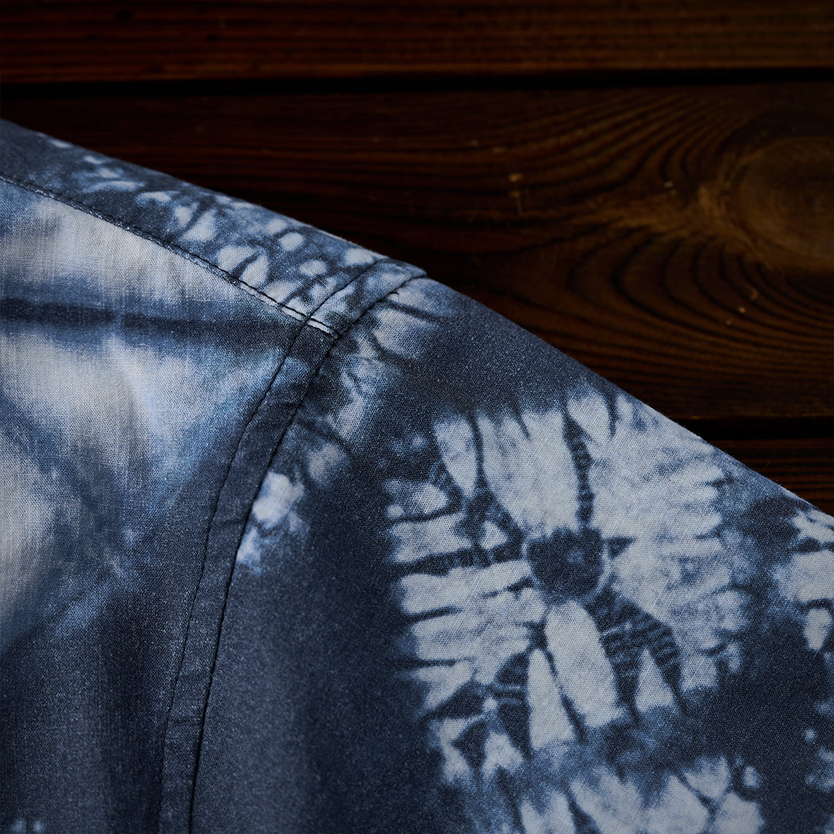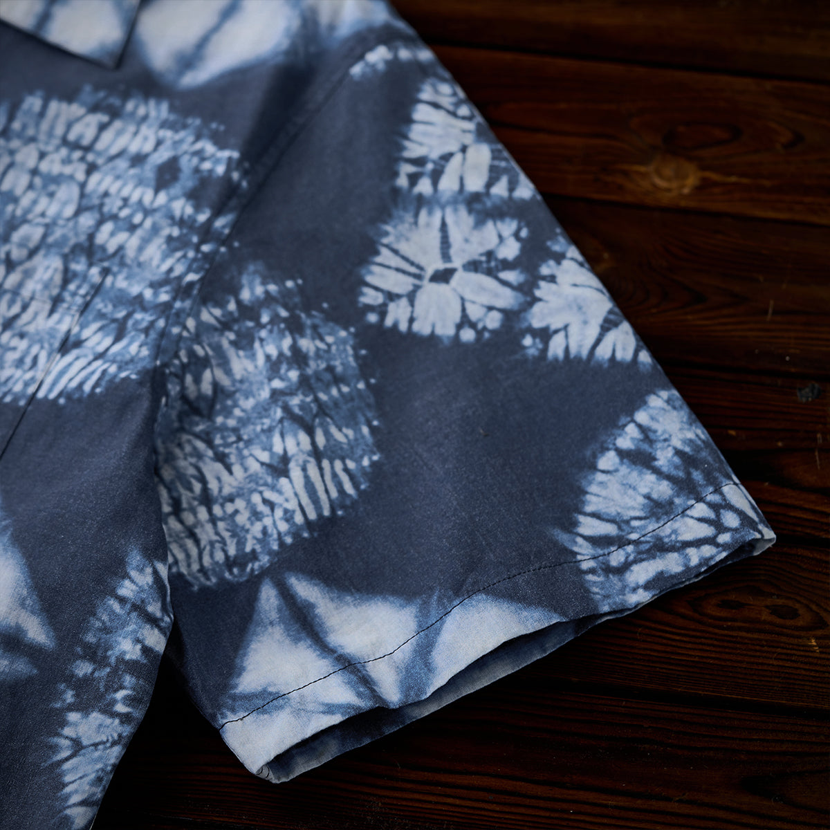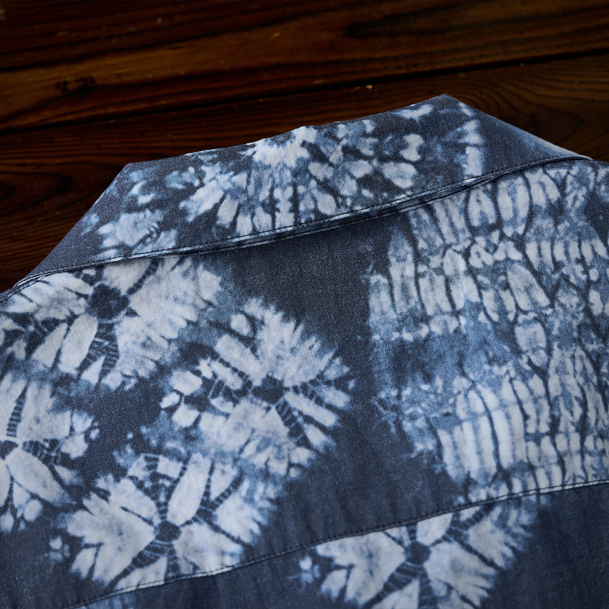 このシャツの模様は伝統的な絞り染め技法の一つである「板締め絞り」にインスパイアされています。実際の絞り染めでは不規則な線やムラが特徴ですが、このシャツではプリント技法を用いてその不規則さを均一に再現しています。