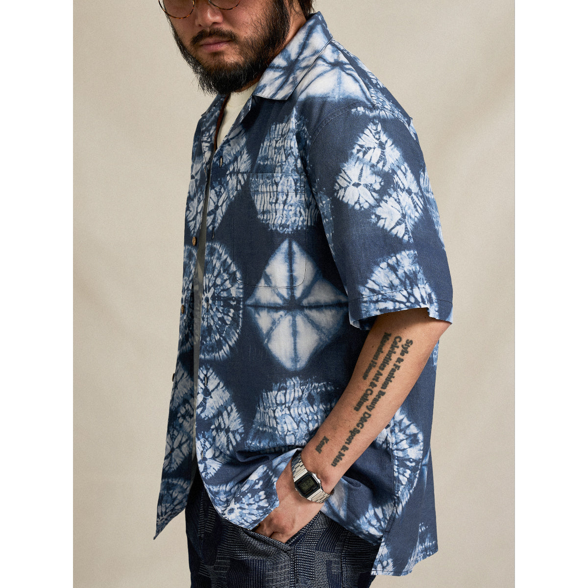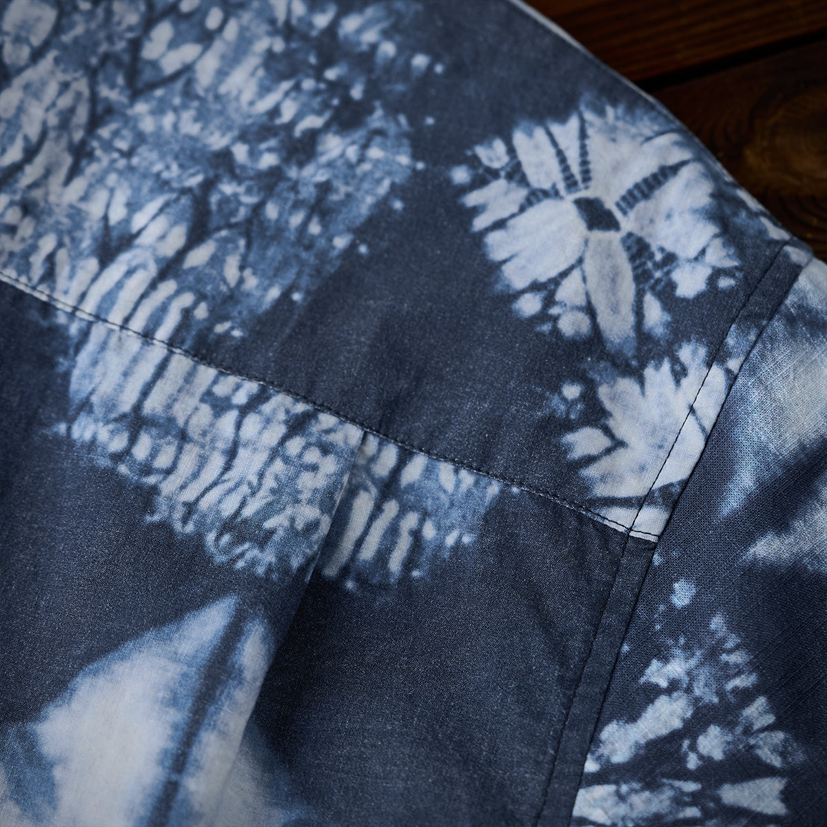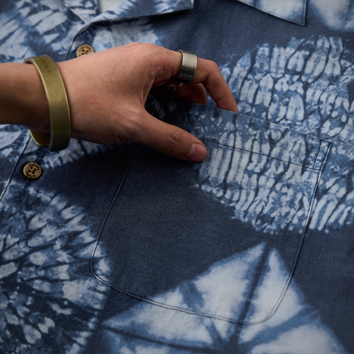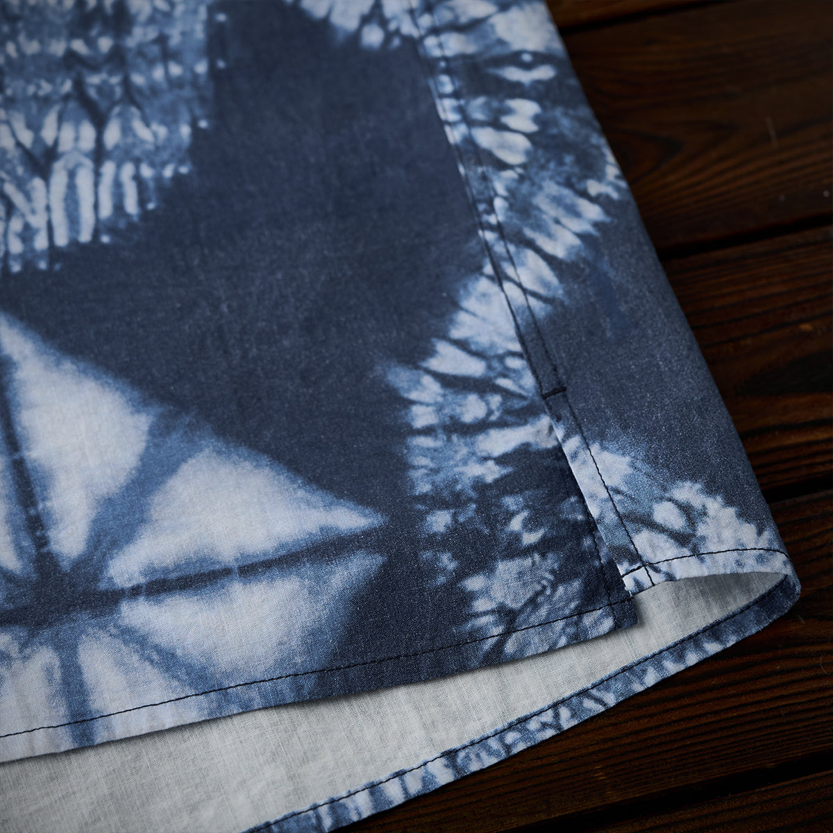 このシャツの模様は伝統的な絞り染め技法の一つである「板締め絞り」にインスパイアされています。実際の絞り染めでは不規則な線やムラが特徴ですが、このシャツではプリント技法を用いてその不規則さを均一に再現しています。