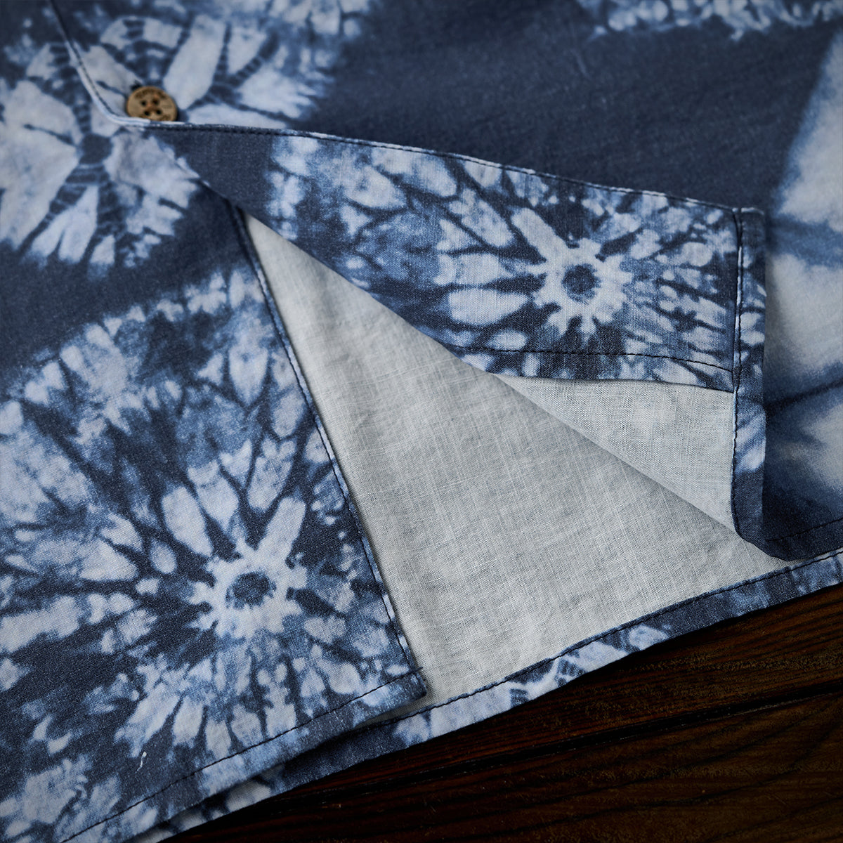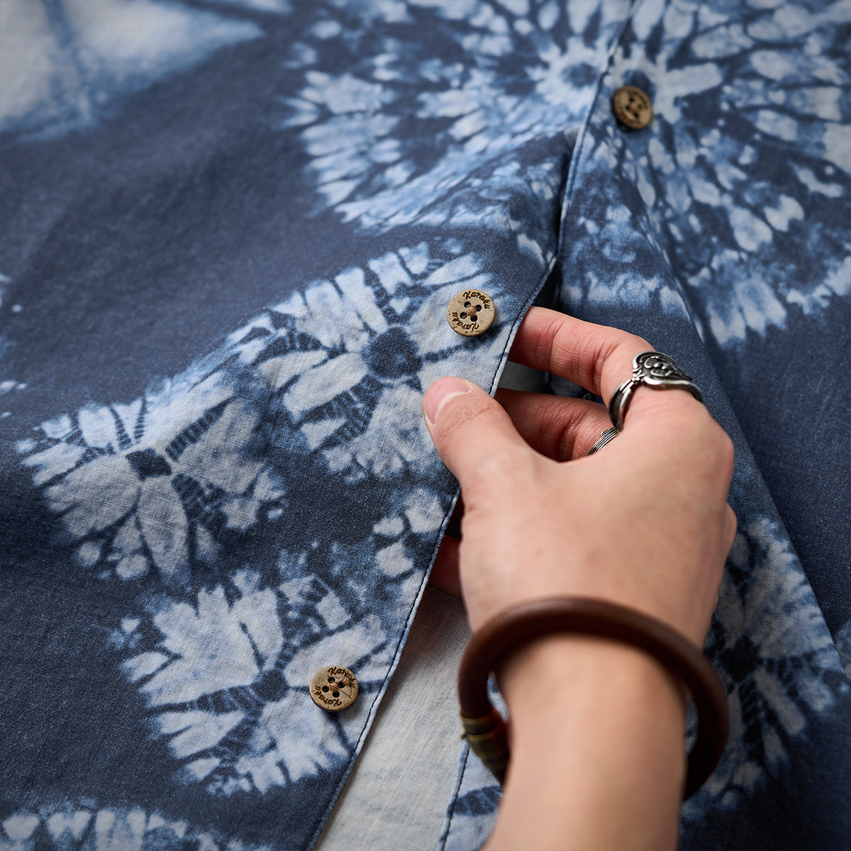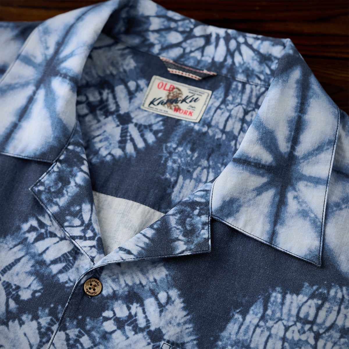 伝統的なアロハに見られるオープンカラースタイルを採用し、リラックス感を演出しています。自然素材の風合いを持つウッドボタンが使用されており、全体のナチュラルな印象を補強しています。