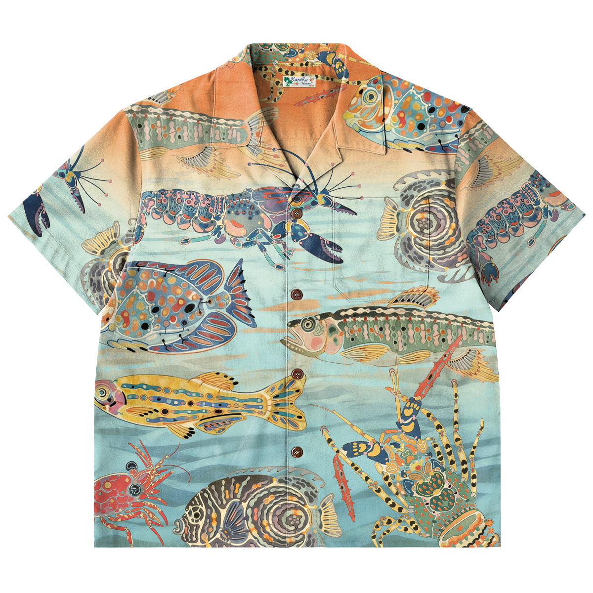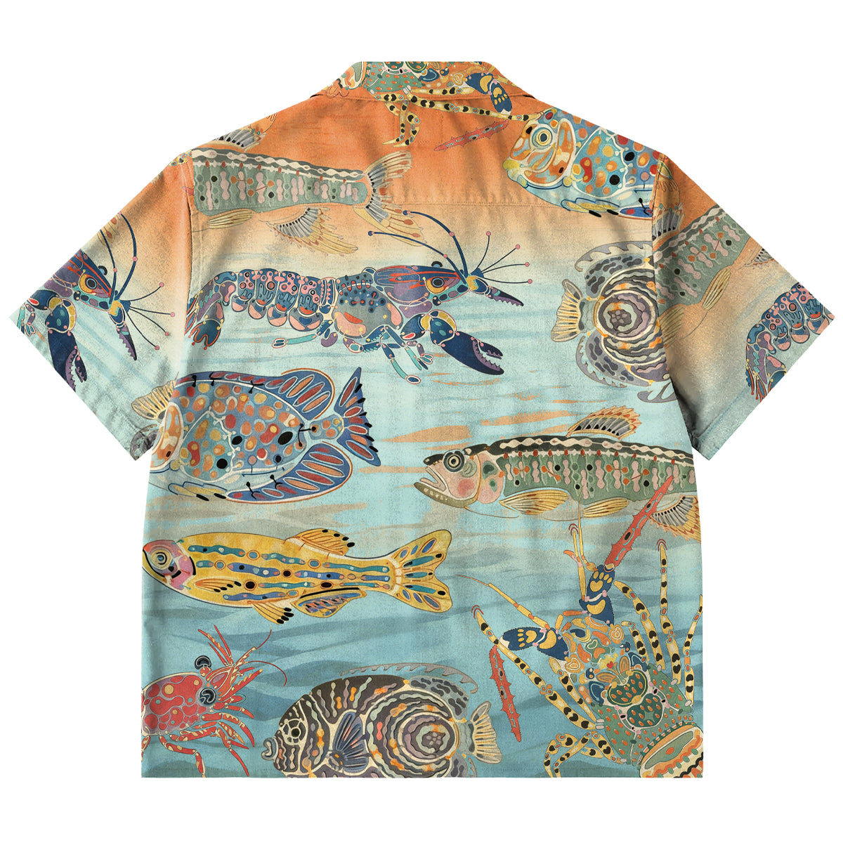 夕陽に染まる幻想的な海底世界を、鮮やかな水彩タッチで描いた総柄アロハシャツ。水中をゆったりと泳ぐ魚やエビたちが、画面いっぱいに広がり、見ているだけで海の静けさと夕暮れの温かみを感じさせます。柔らかな生地感で肌触りがよく、軽やかな着心地を実現。リラックス感のあるシルエットとオープンカラー仕様で、肩の力を抜いた夏の装いを演出します。デニムやショートパンツと合わせるだけで、コーディネートの主役になる存在感あふれる一枚。水彩ならではの色彩のグラデーションが、日常のスタイルに幻想的なアクセントを添えます。