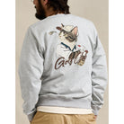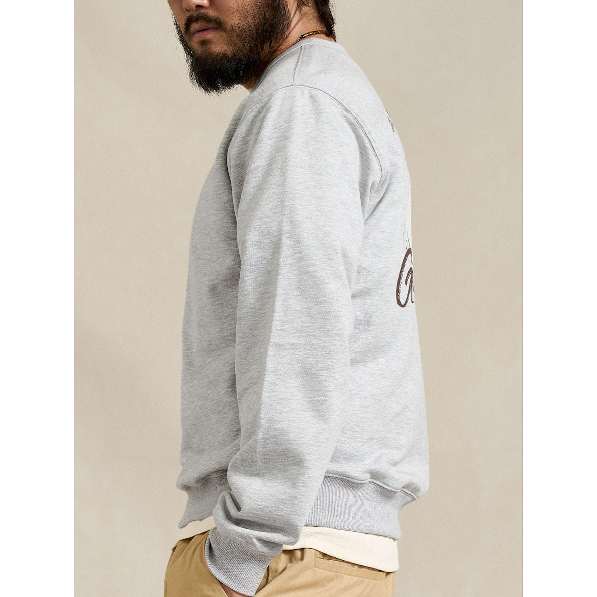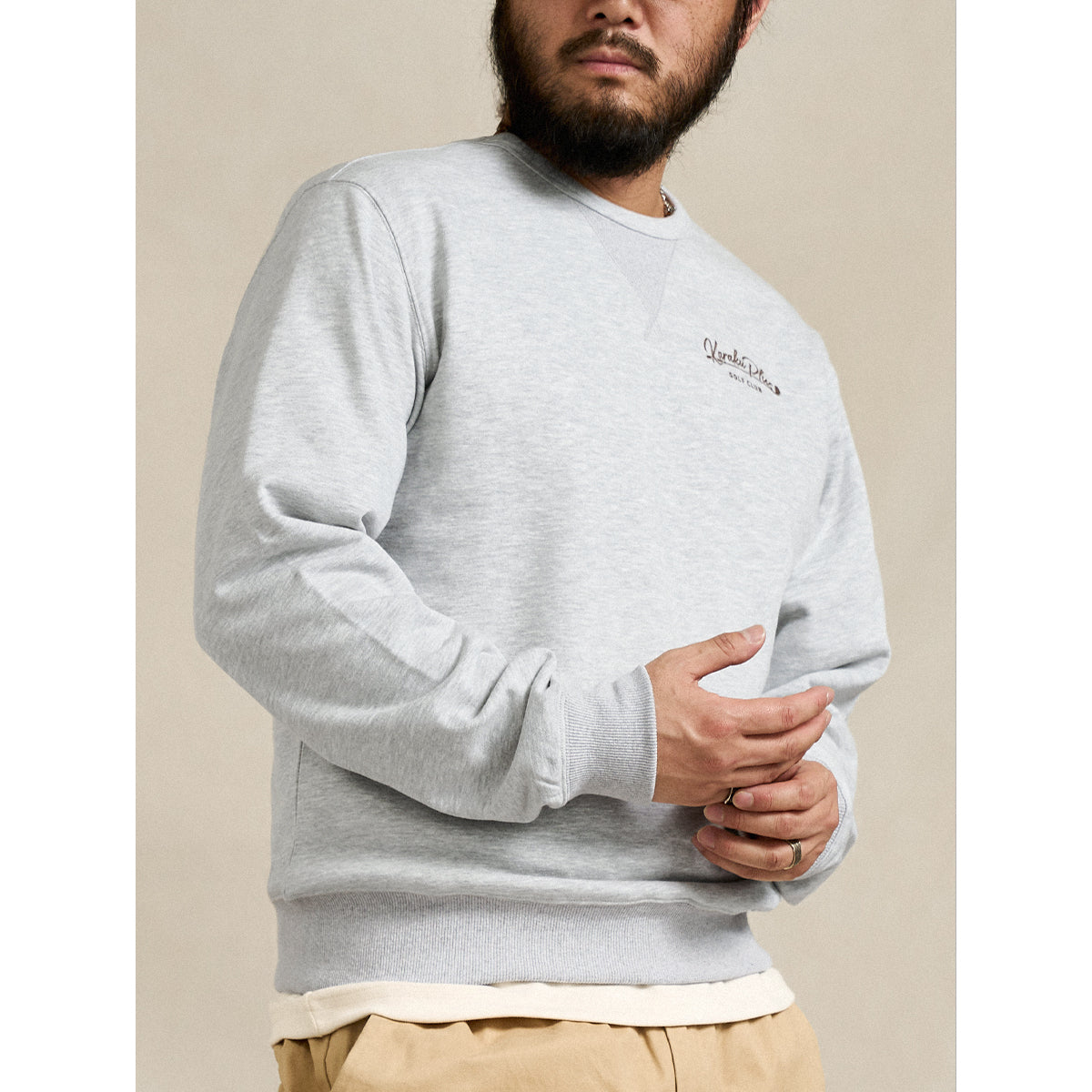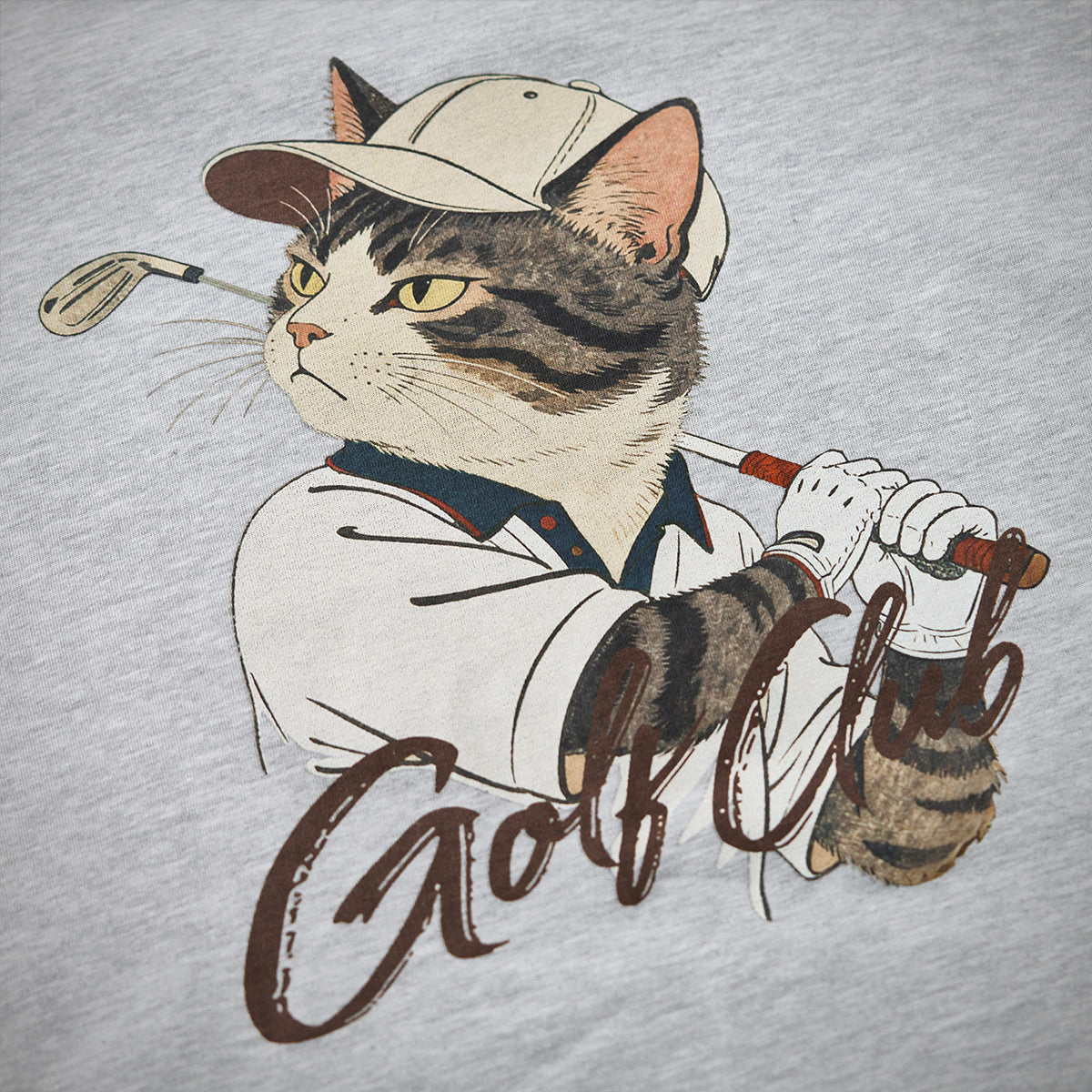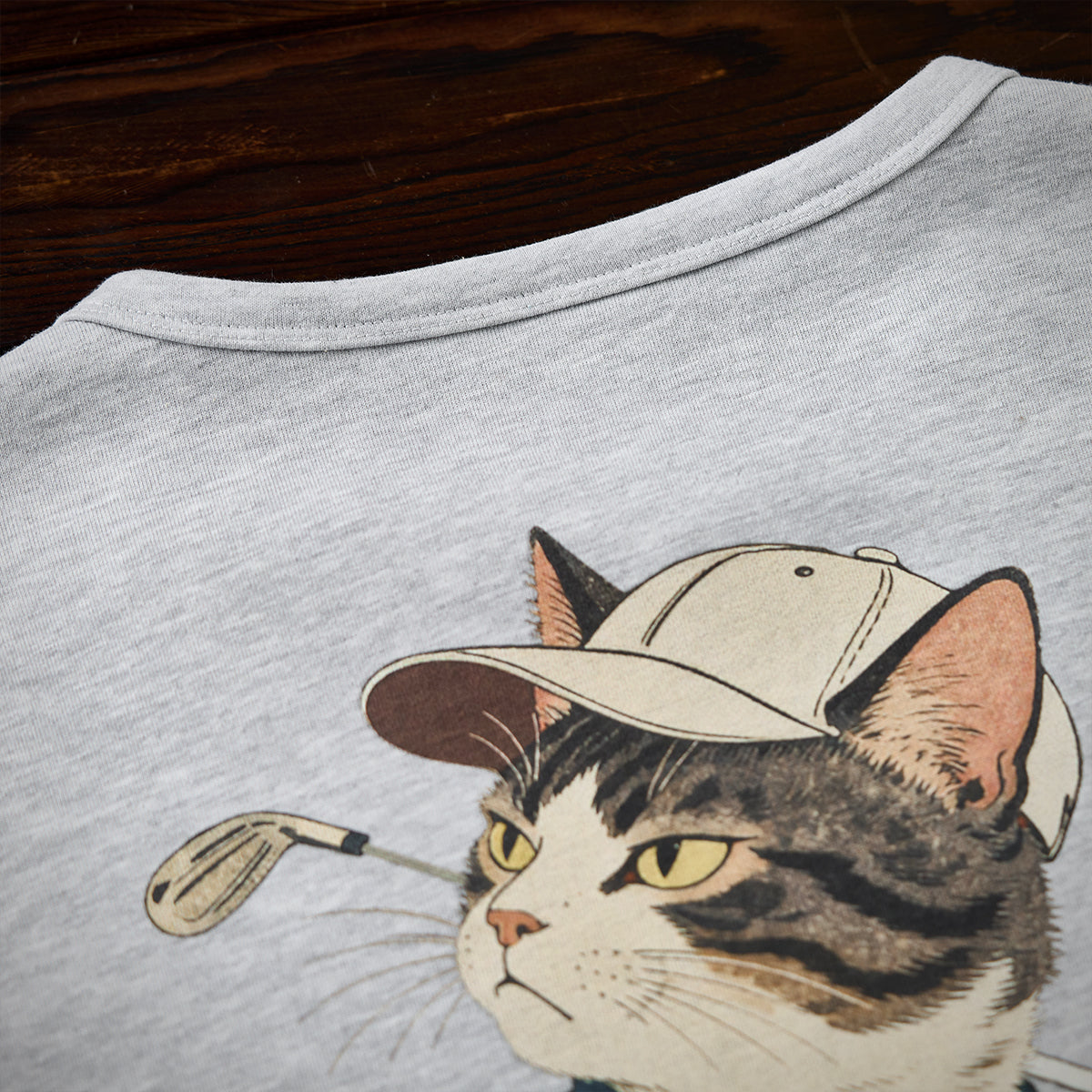 フロントにはシンプルなロゴプリントを配し、すっきりとした印象に。襟元の「Vガゼット」デザインは、クラシックなスウェットシャツの伝統的なディテールを取り入れ、デザイン性と機能性を両立させています。バックスタイルには、帽子を被った猫がゴルフスイングの瞬間に振り向く、躍動感あふれるグラフィックを大胆にプリント。ユーモアとストーリー性を感じさせる一枚に仕上げました。ベーシックなシルエットで、一枚着はもちろん、アウターのインナーとしても存在感を発揮。カジュアルスタイルにさりげない遊び心をプラスしたい方におすすめのスウェットです。