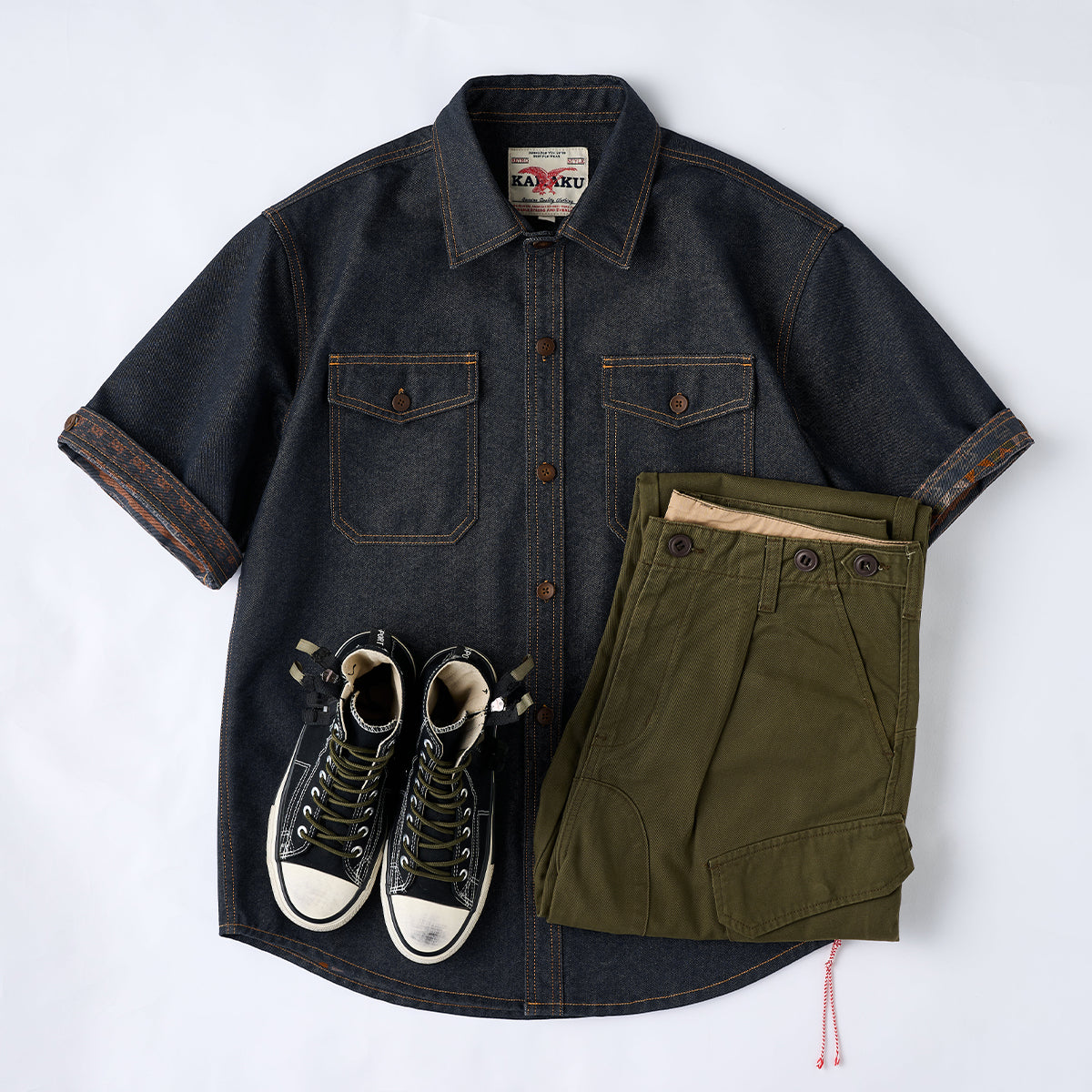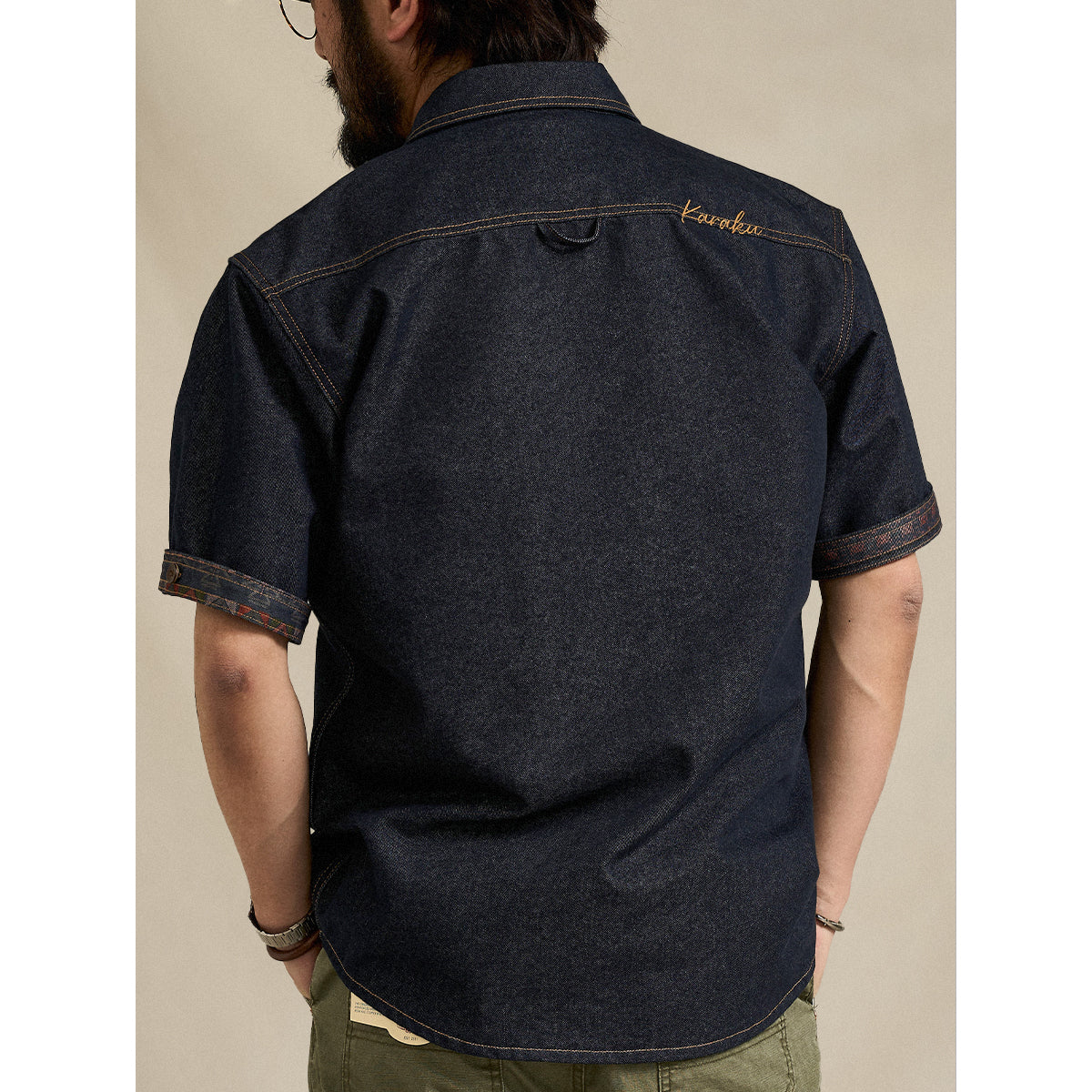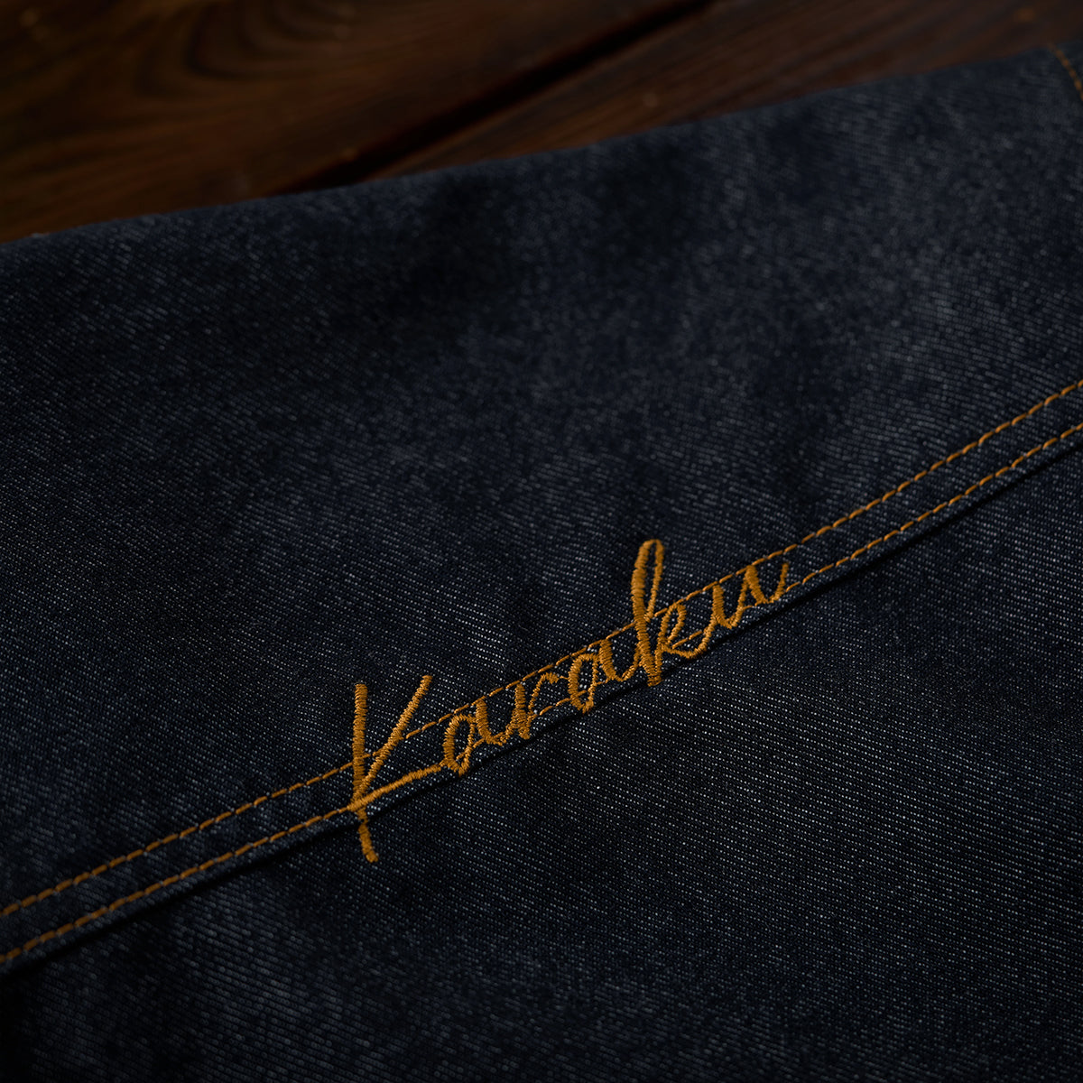 ダブルステッチやフロントポケットの配置など、ワークウェアの機能的なデザインが特徴です。右肩部分に「KaraKu」の刺繍があり、控えめながらもブランドのアイデンティティを感じさせるポイントです。