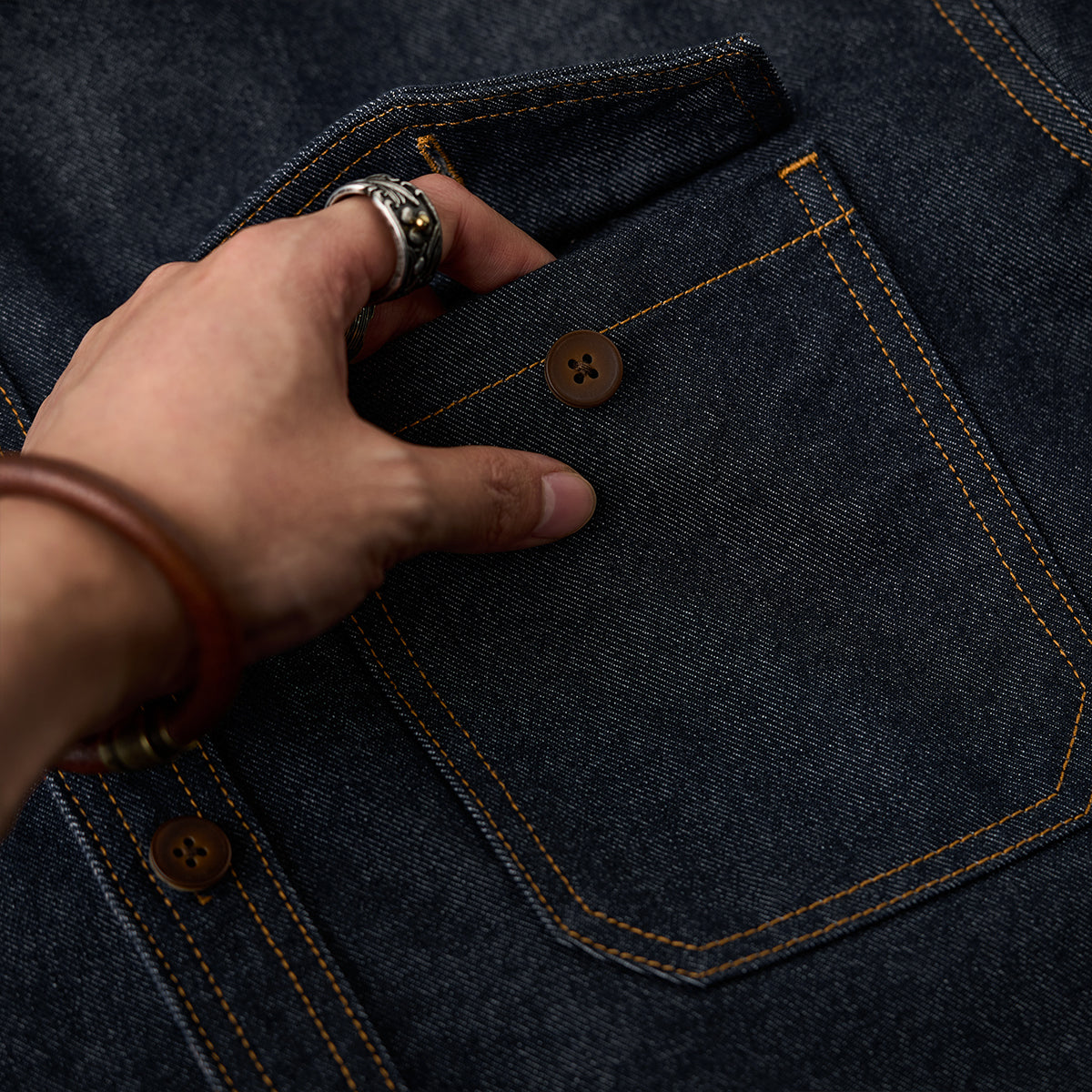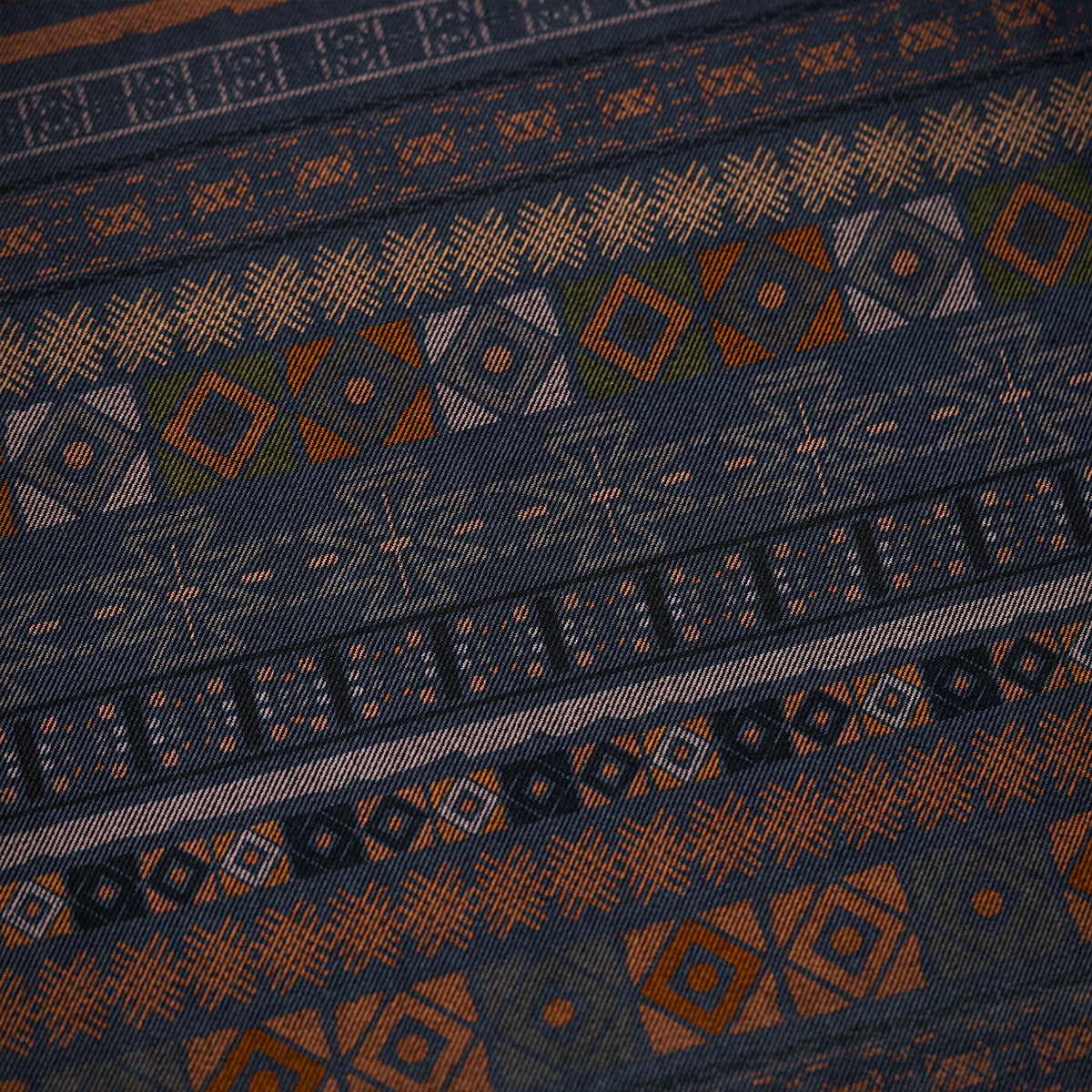 表面は濃紺のデニム生地で仕立てられ、クラシックなワークシャツスタイルを基調としています。裏地にエスニック調のパターンが使用されています。幾何学模様が繊細に配置され、伝統的な手織り布を思わせるデザインです。