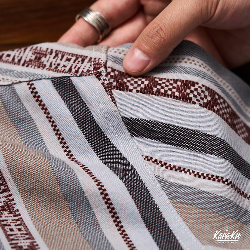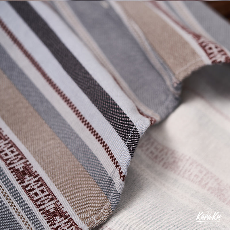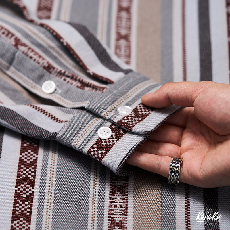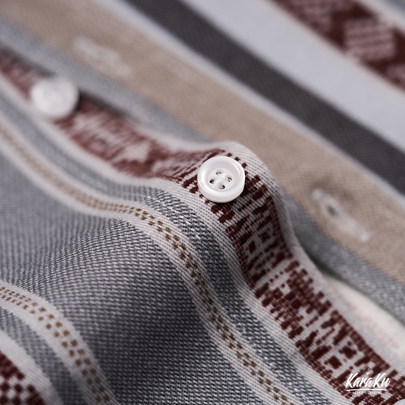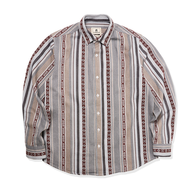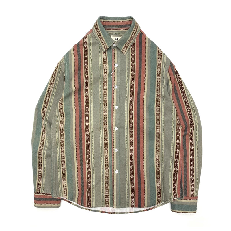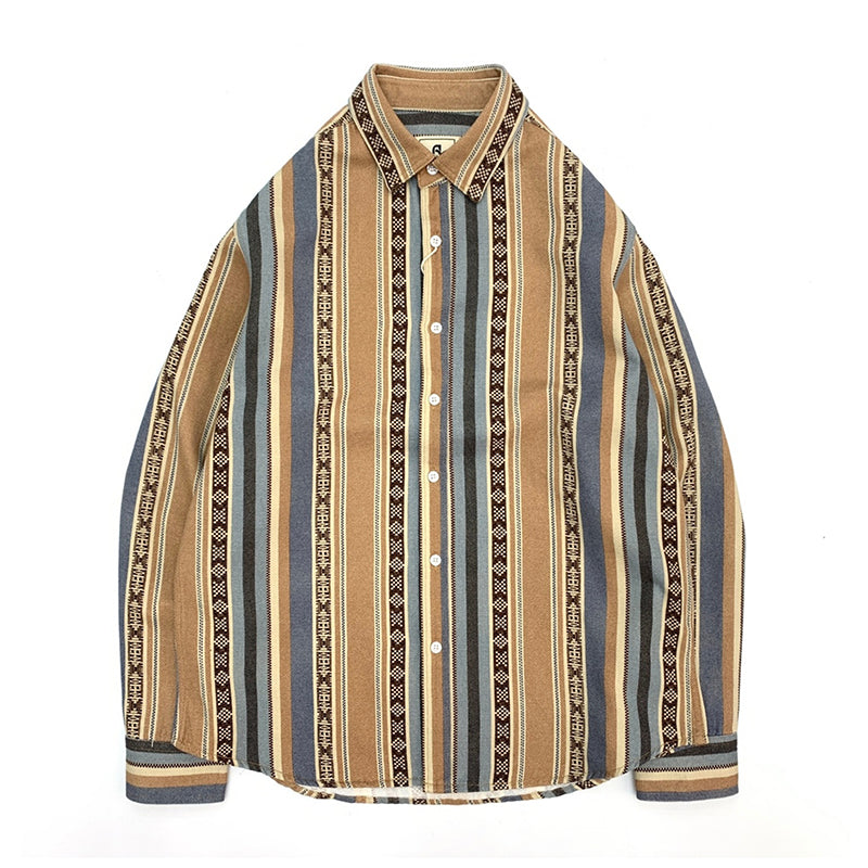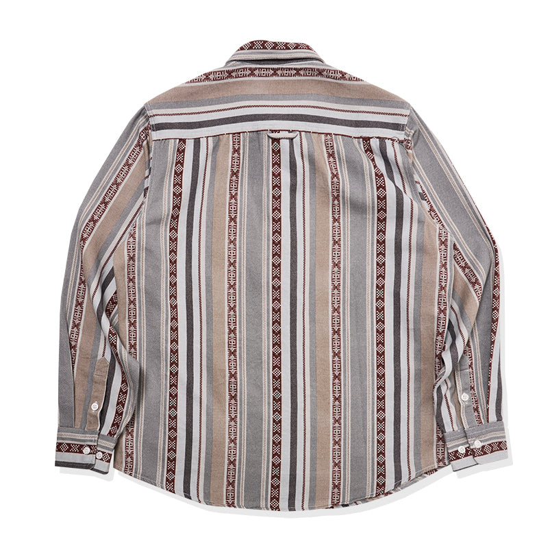 独特なファッションのイメージを持っているエスニックなテイストのマルチストライプ長袖シャツが登場!単にストライプのプリントではなく織り感があるマルチストライプ柄がに仕上げたことで、カジュアルさの中にも高級感のある佇まいを演出。トーテムのような模様をモチーフにした民族調柄を敷き詰めるデザインが存在感抜群。フロントのポケットが、ストリートさを演出し、アクセントの効いた一枚に仕上がりました。センス抜群のデザインなので着るだけで雰囲気が作れ、エスニックがお好きな方にはもちろん、全てのスタイルにもおすすめ。