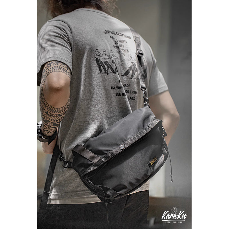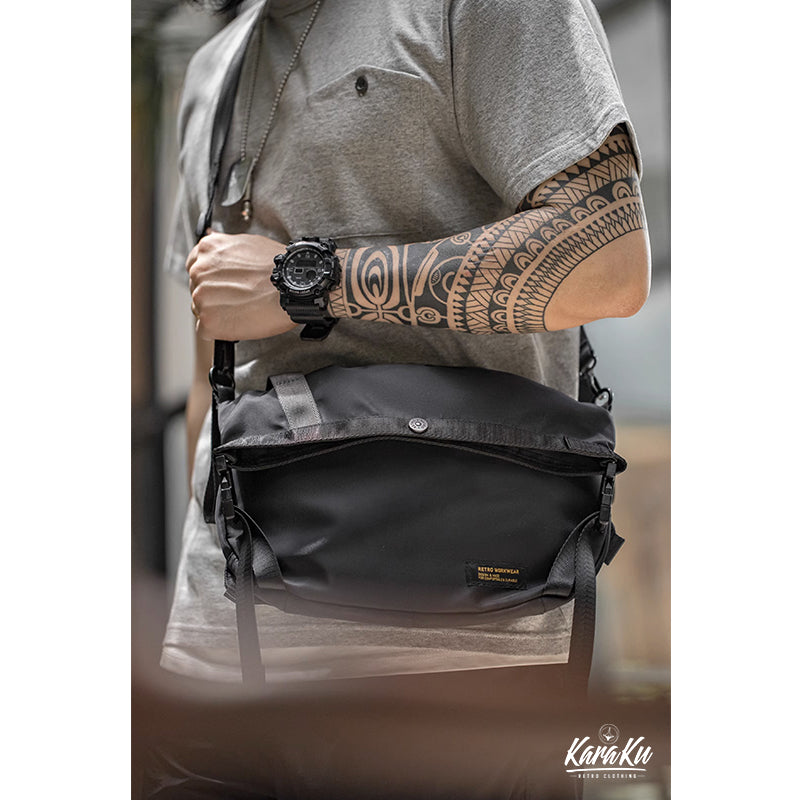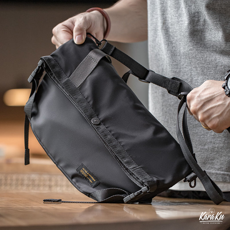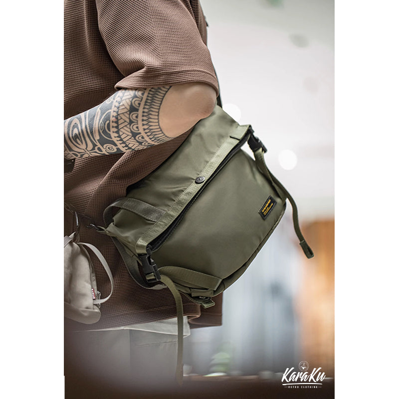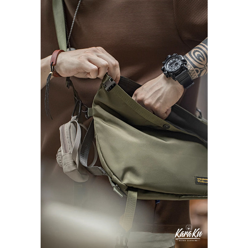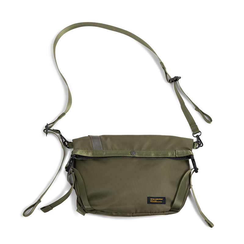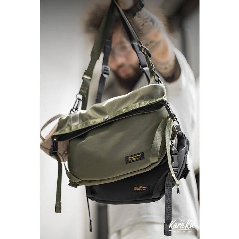 荷物が多い時は、とことん軽いバッグが欲しい!という声にお応えした自信作のマウンテンサイクリングバッグが登場!ラフな印象でガシガシ使え、ポリエステル素材で防水性も高くいので少しの雨なら濡れても問題ありません。開閉部はスナップボタンで簡単に開閉できます。カジュアル × マウンテンファッションを軸に、ラフに着こなせるシルエット感が特徴的。男性が使用していますが女性が使っても似合うユニセックスなバッグです。