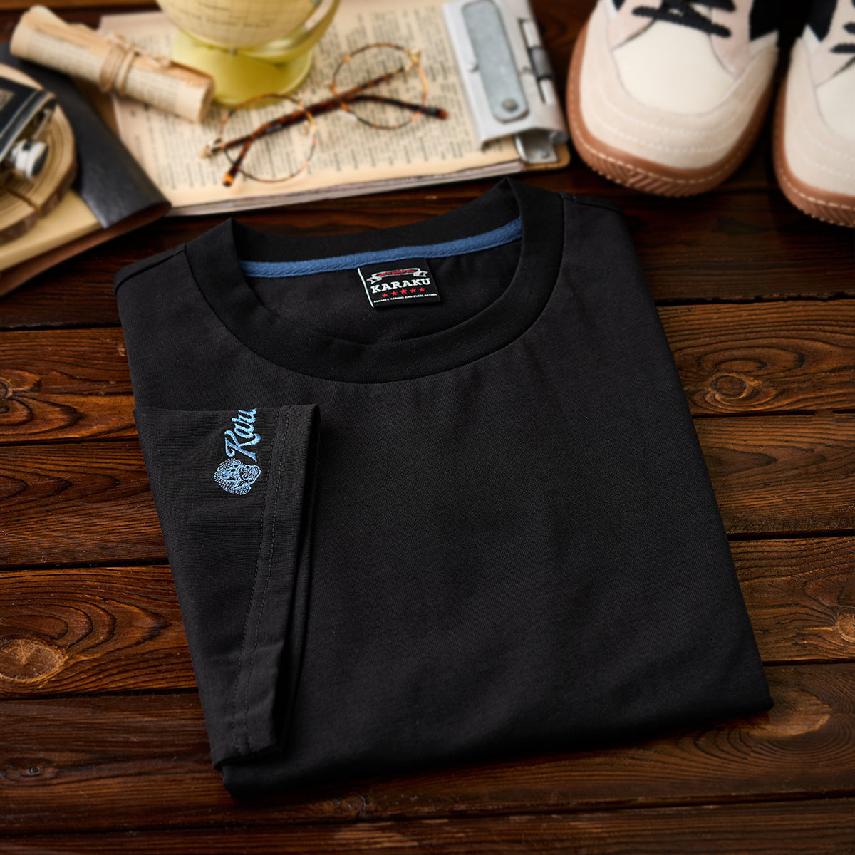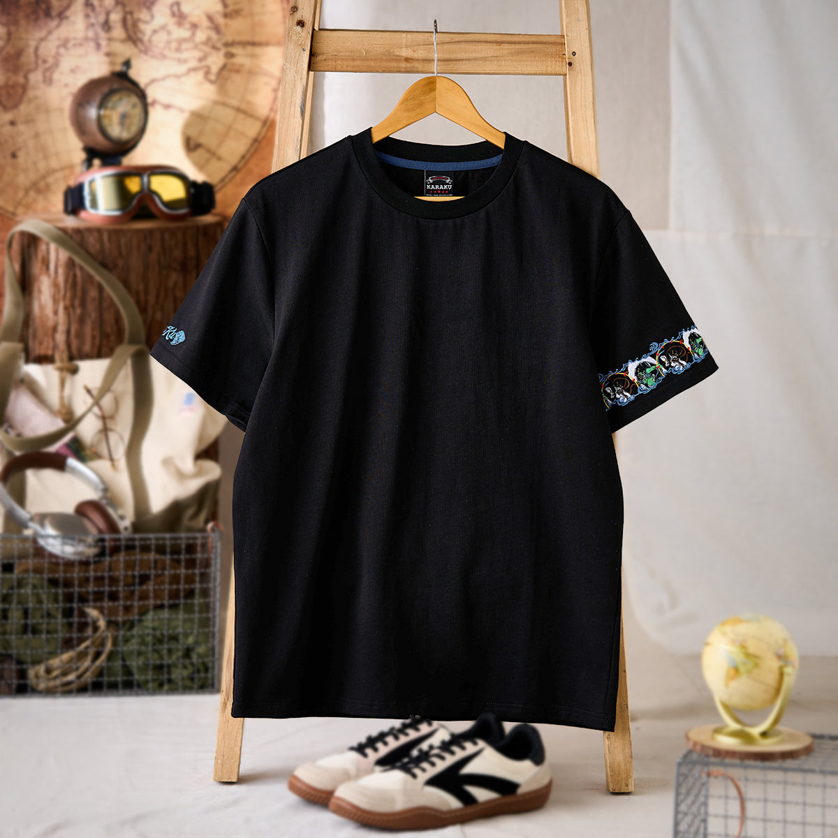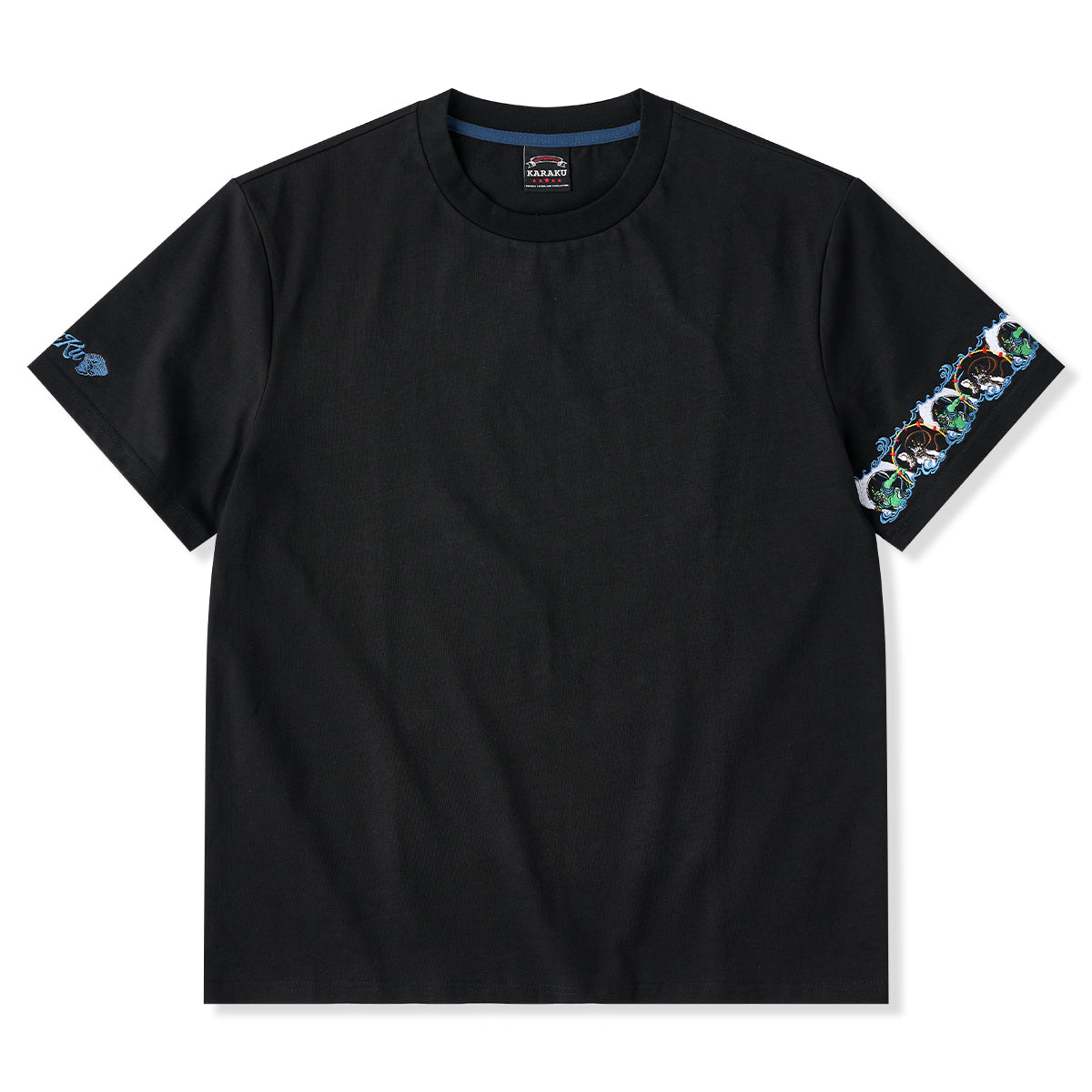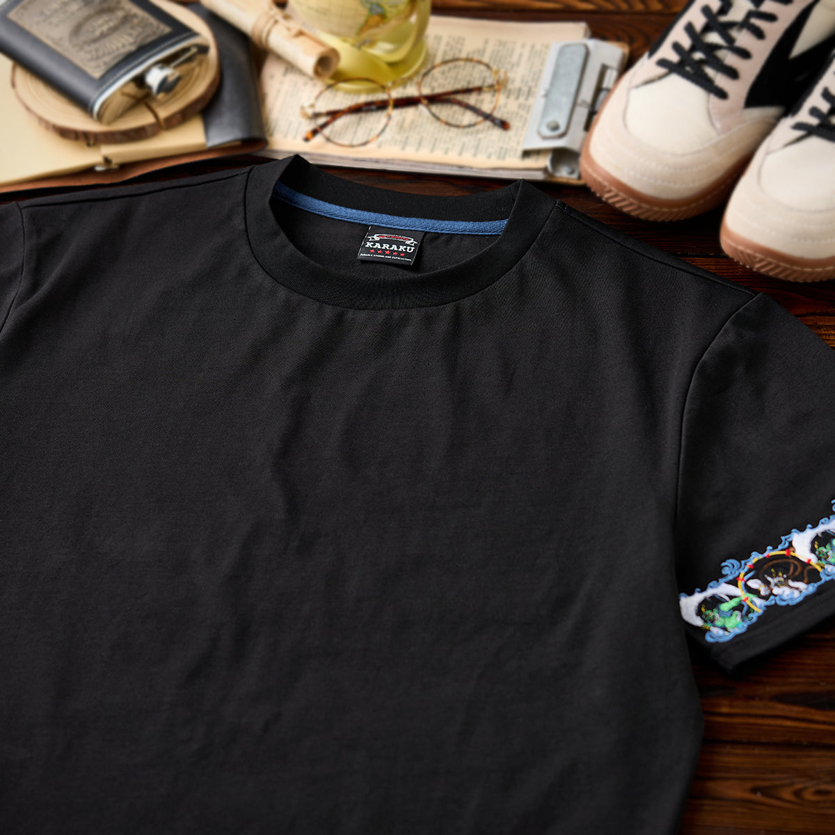 左袖には日本の伝統的なモチーフ「風神雷神」を大胆に刺繍で表現し、インパクトのある一着に仕上げました。右袖にはブランドロゴをさりげなく刺繍し、全体のバランスも絶妙。シンプルなボディに映える左右非対称の刺繍デザインが、個性を引き立てつつも派手すぎず、普段使いからイベントシーンまで幅広く活躍します。一枚で主役級の存在感を放つ、和とストリートが融合した粋な一着。