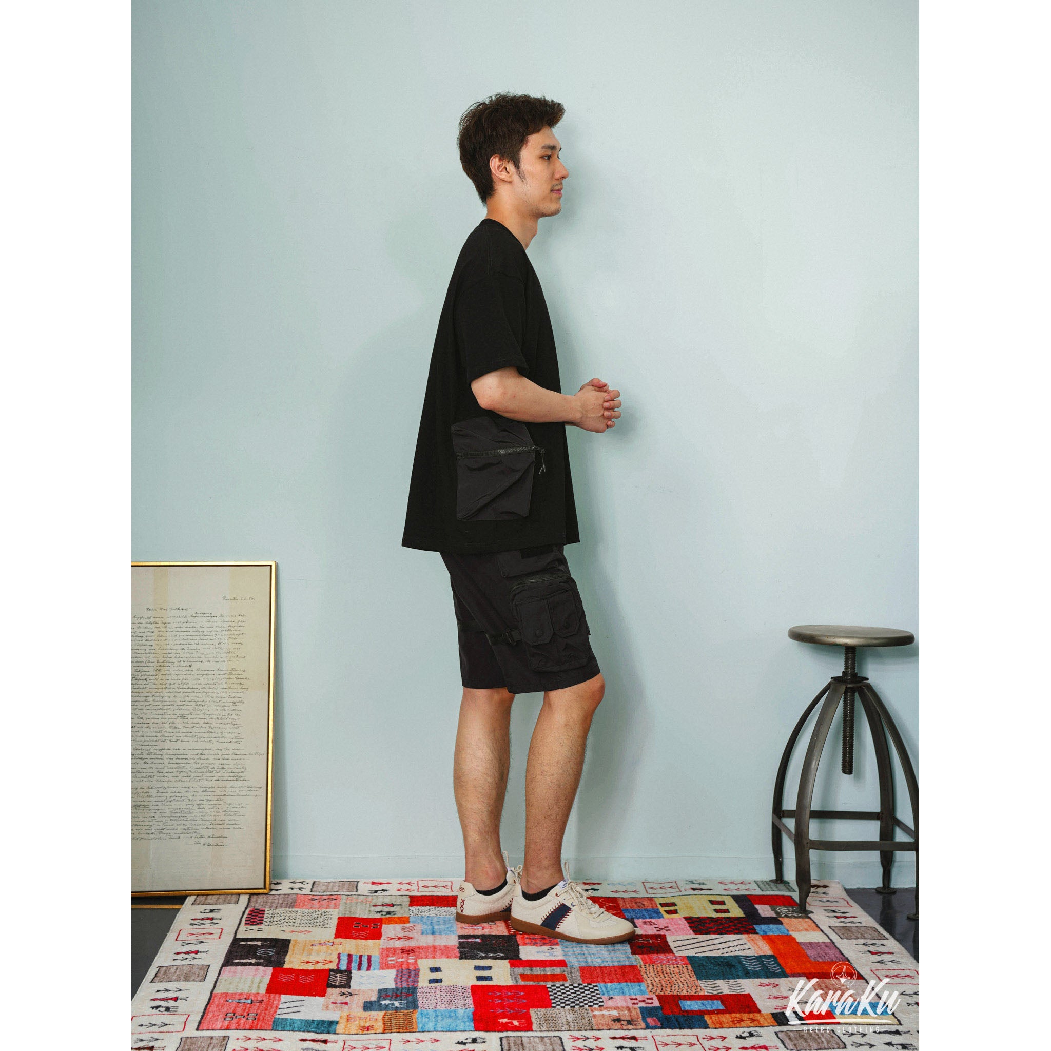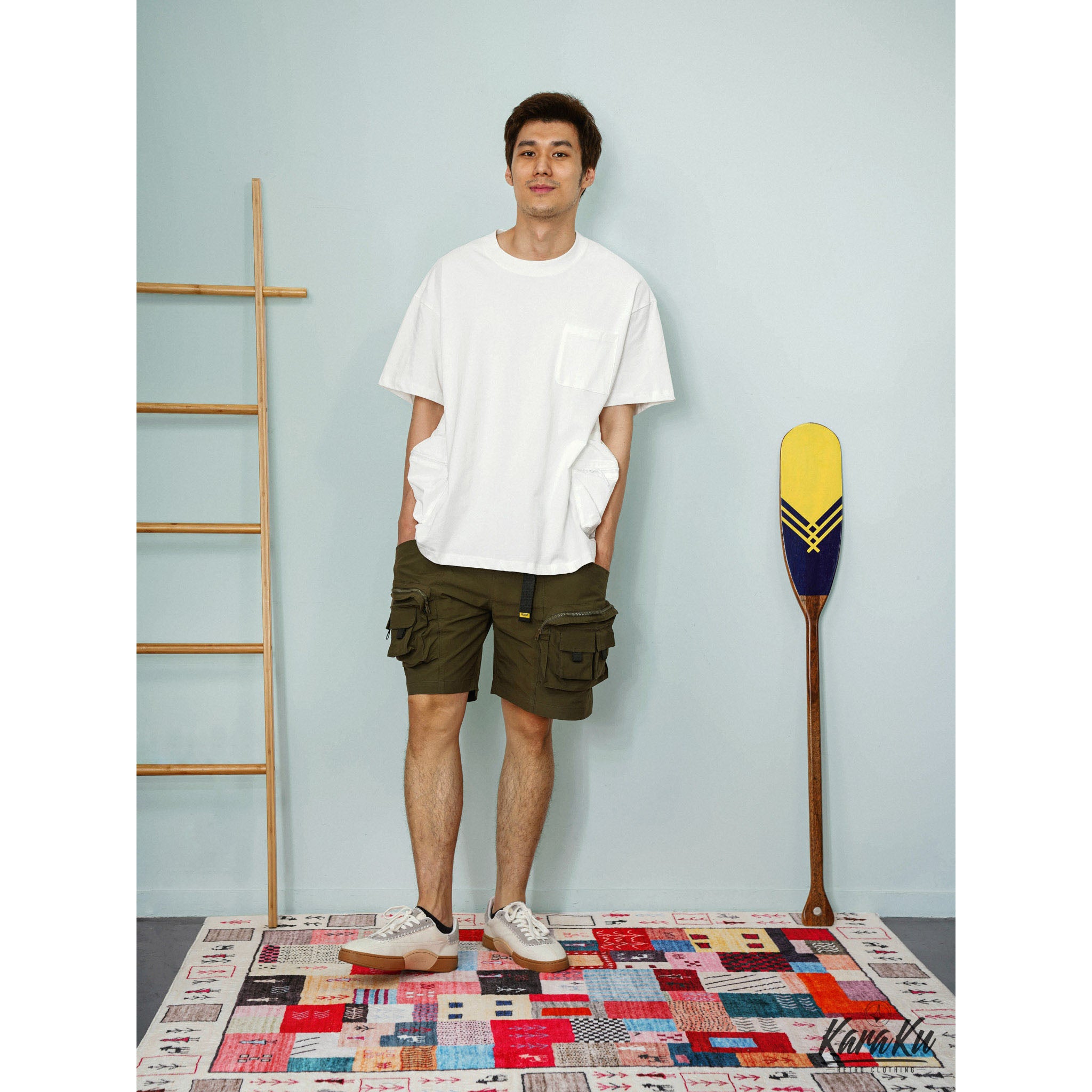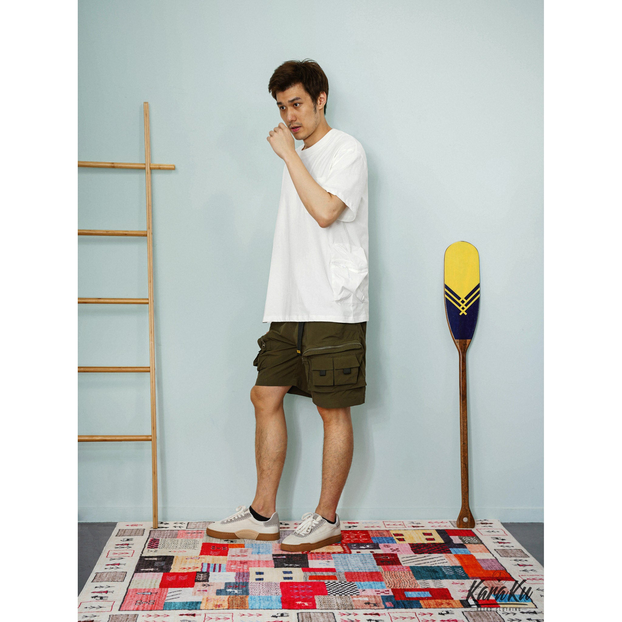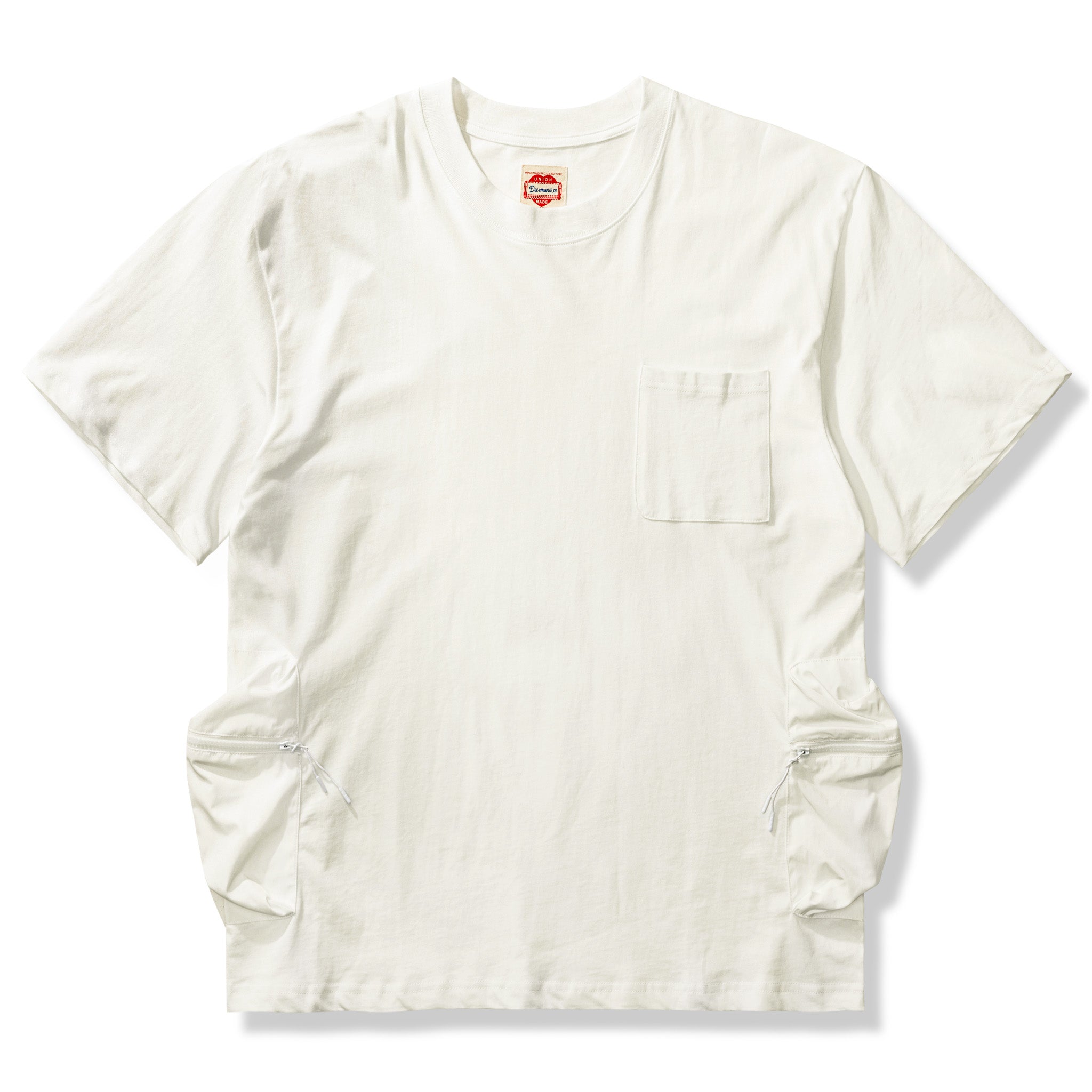 両サイドにジップ付き機能ポケットを二つあしらって、小物を落とさないように実用性が高い。左胸元にも小さめのポケット配置し、ワークテイストを味付け。