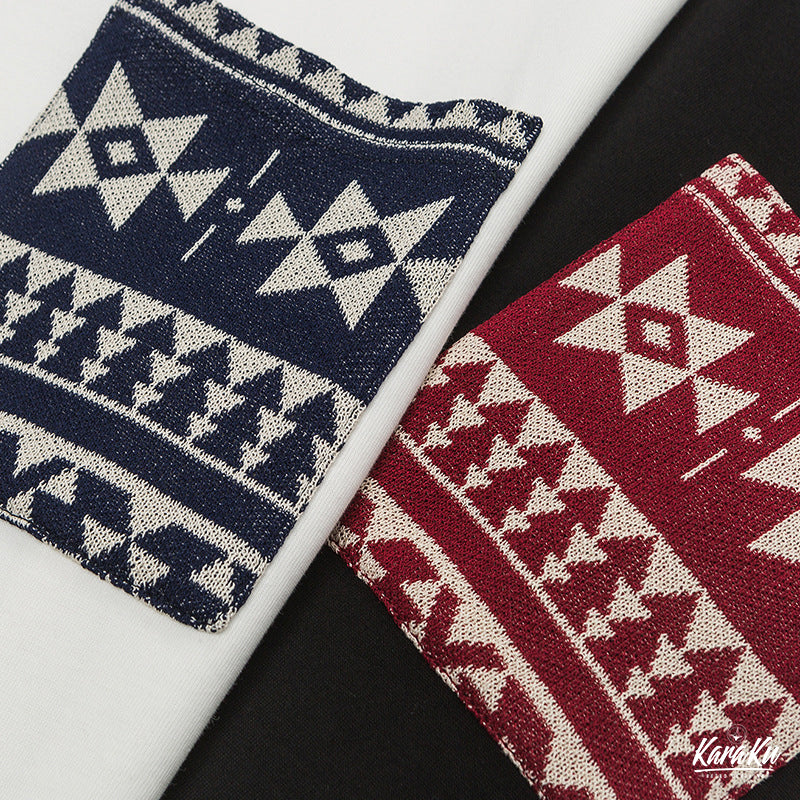 胸ポケットは独特なエスニック調幾何学柄ニットが施されて、複雑な幾何学的なデザインや文様を作り出す、ナバホの伝統的な美しさを引き立てる 、豊かな視覚的な魅力と独自性が与える。