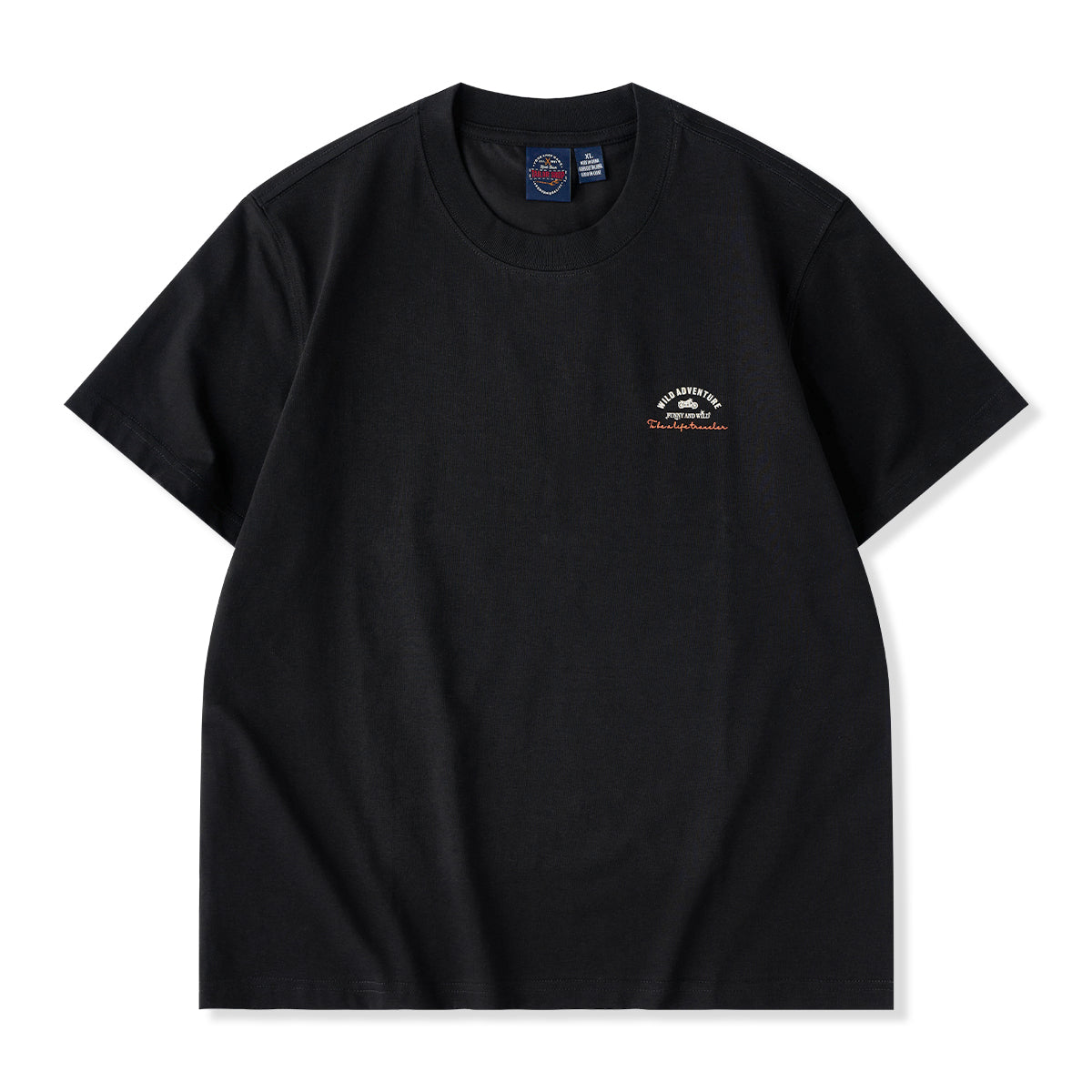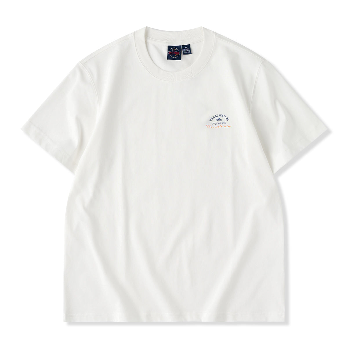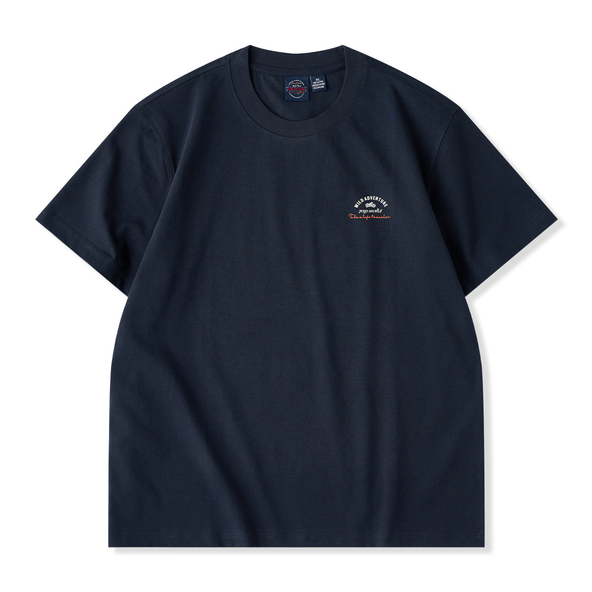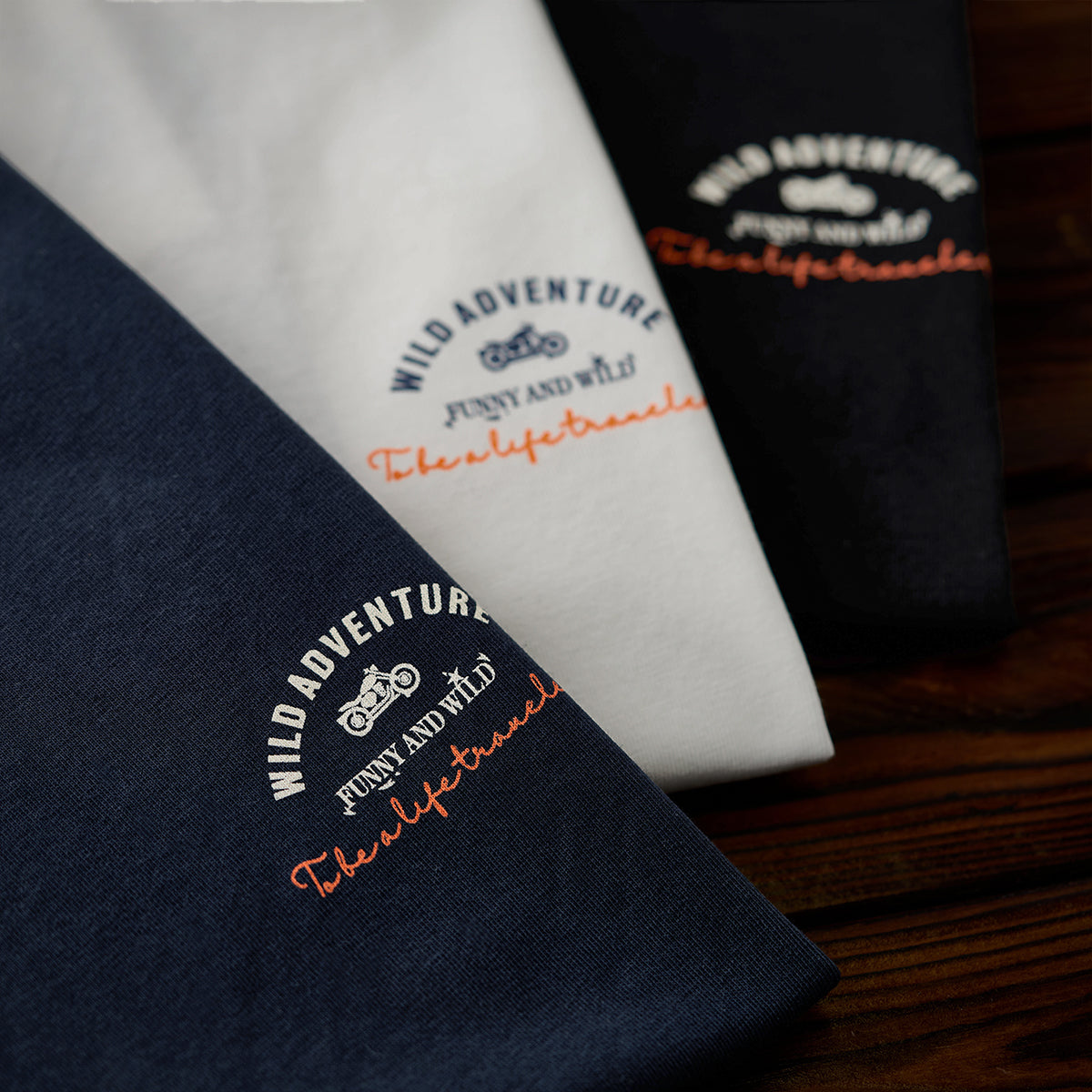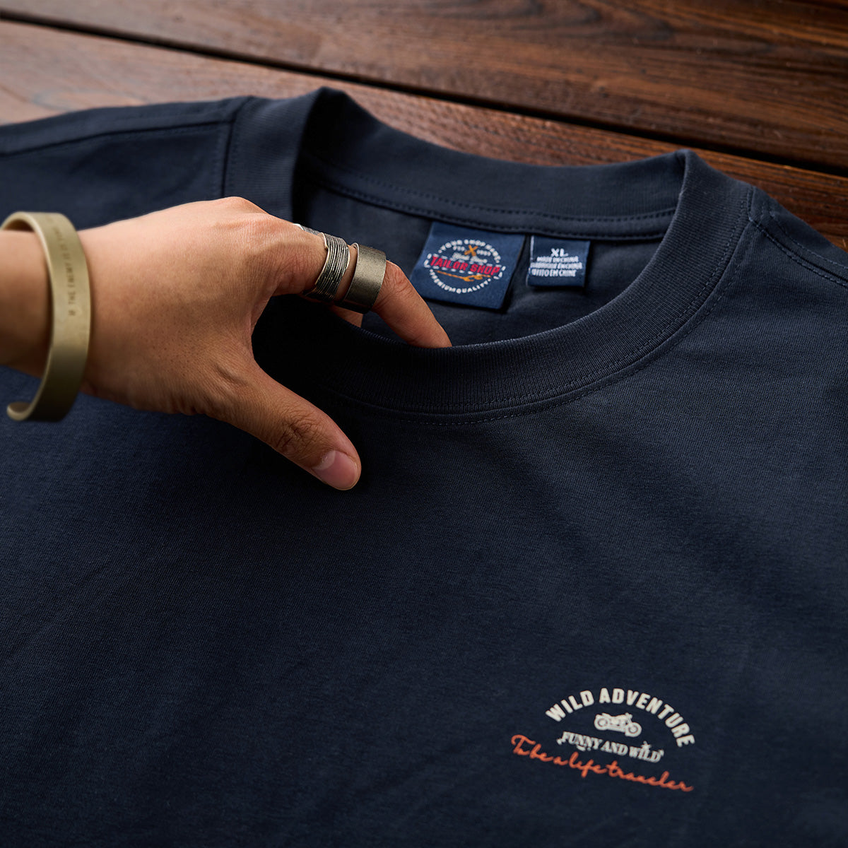 小さなオートバイプリントが胸の左側に配置されて、クラシックなイラストは、ヴィンテージ感と伝統を感じさせる。大きな「WILD ADVENTURE」「FUNNY AND WILD」というテキストが周囲に配置、モトクロス競技の興奮とスリルを強調。