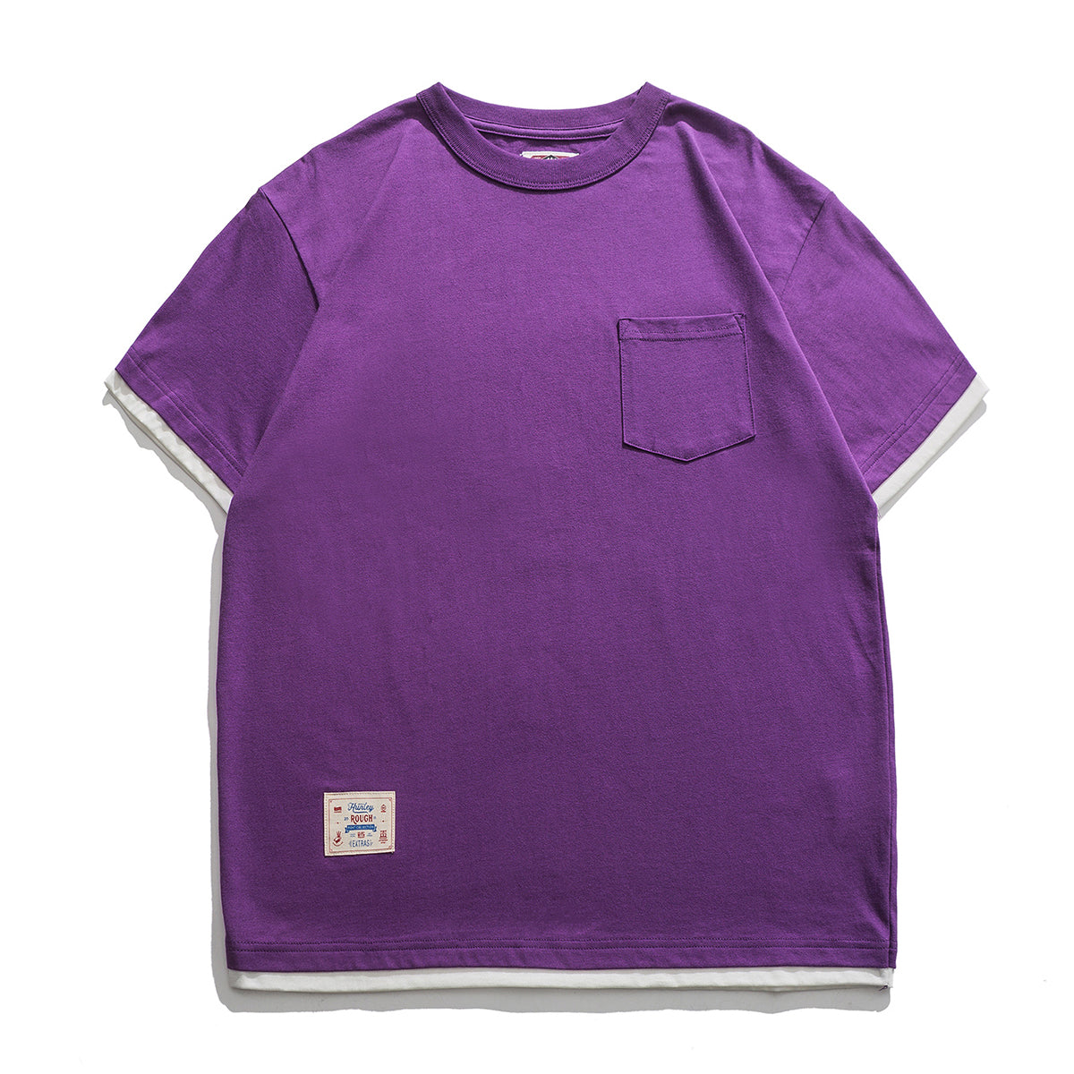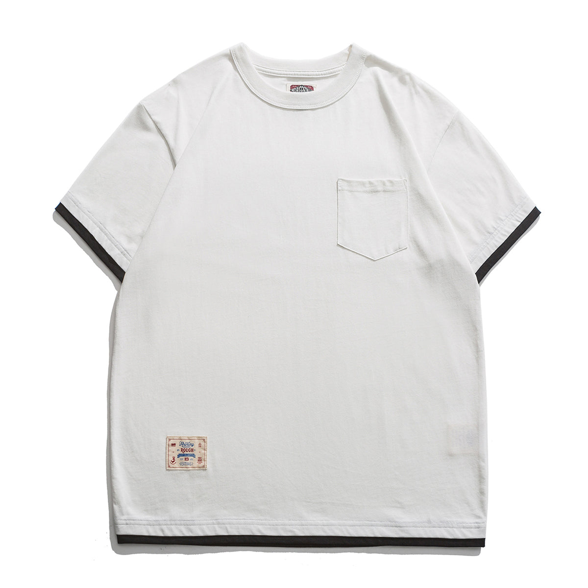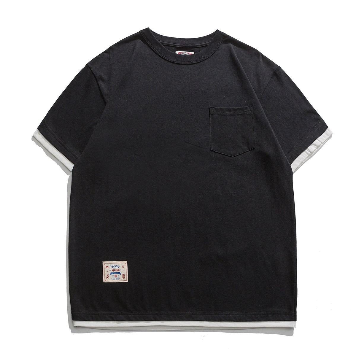 A short-sleeved T-shirt with a fake layered design that accentuates the color scheme of the sleeves and makes it stand out even though it is a plain item.