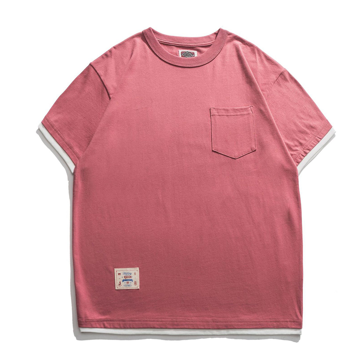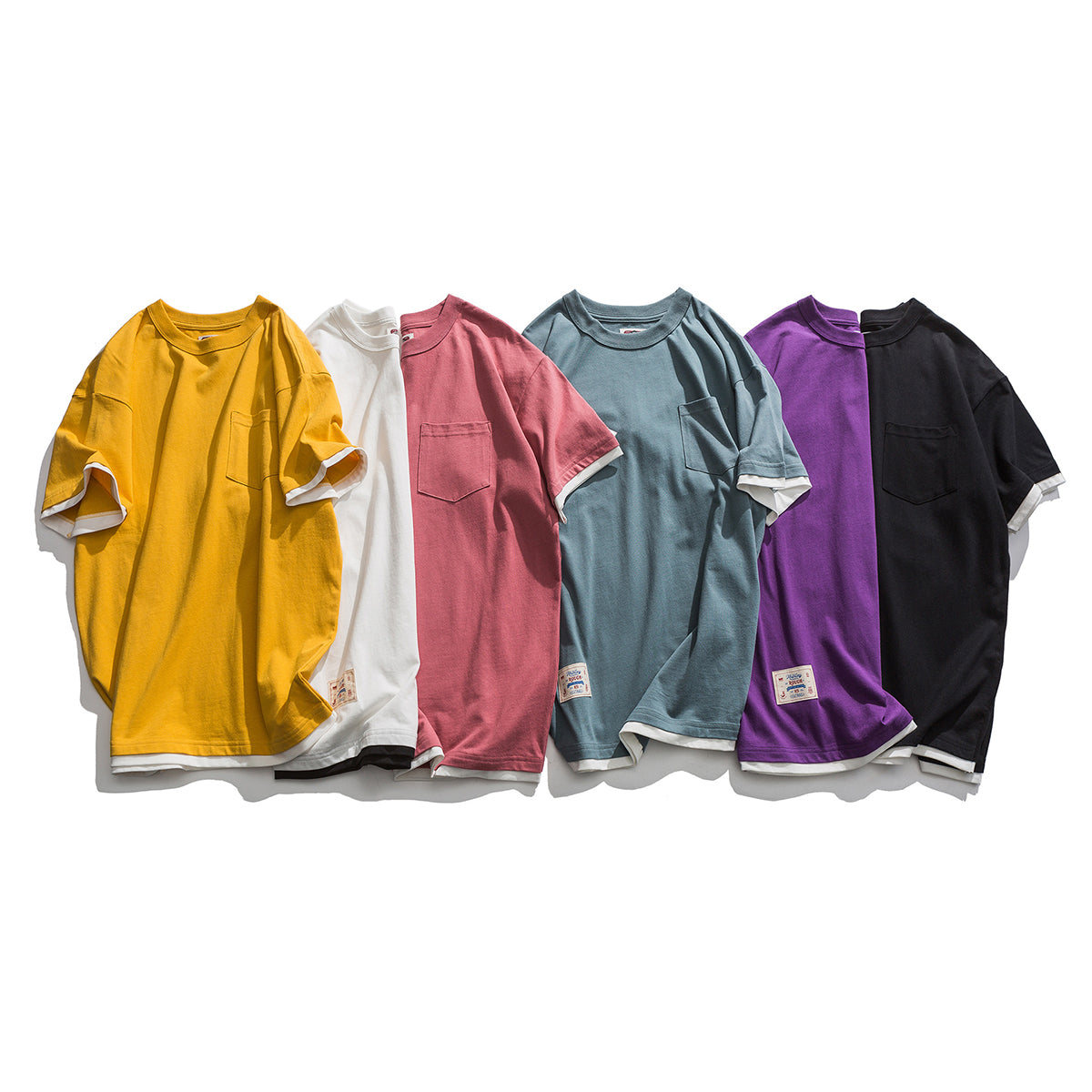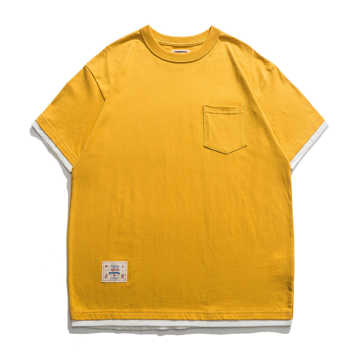 A short-sleeved T-shirt with a fake layered design that accentuates the color scheme of the sleeves and makes it stand out even though it is a plain item.
