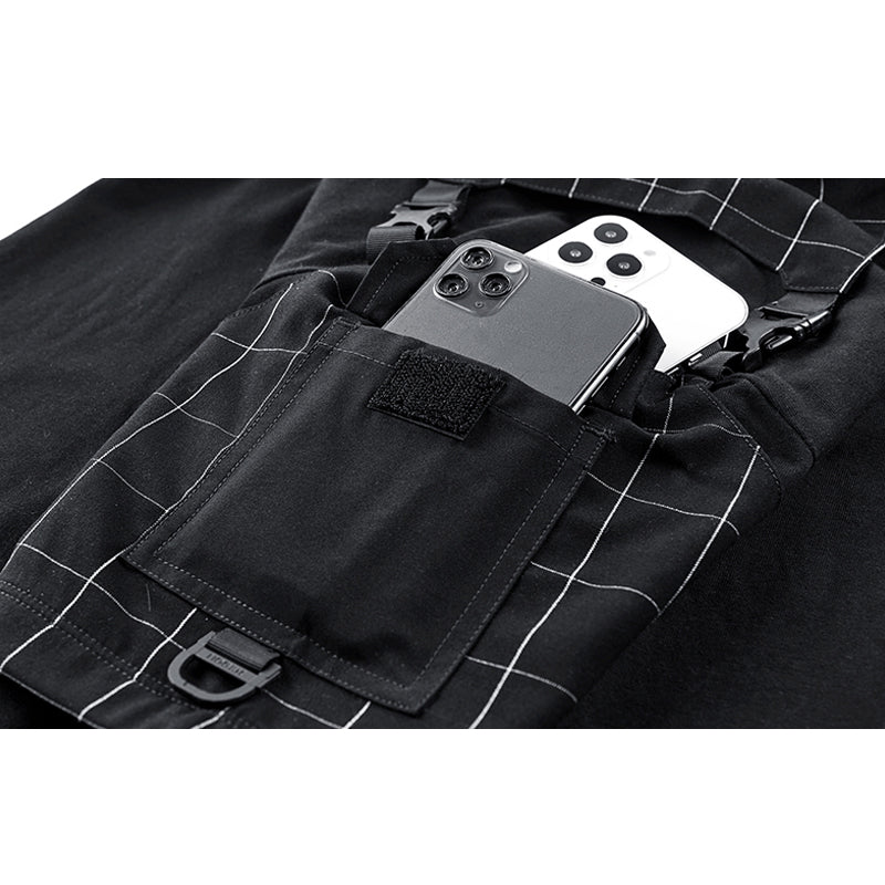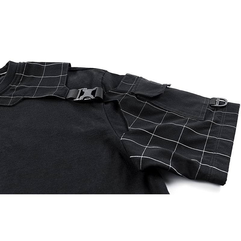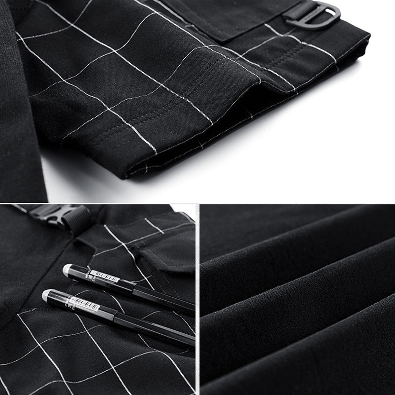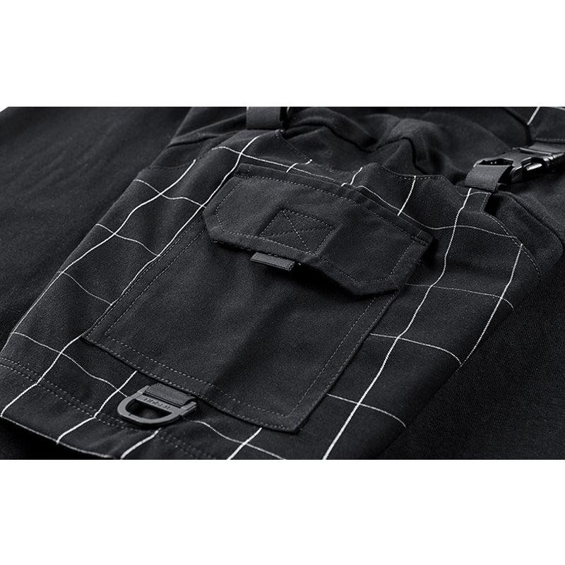 This item combines the function and design of Cyberpunk, and is mostly dressed in black. Graph check switching material is designed as a topping, adjustment buckles, badges, vests, and other small items that stand out are important to cyberpunk. The fake layered design is also a point, with a flap pocket and excellent functionality and design. Made of "polyester", a material that does not easily lose its shape and has excellent durability, and at the same time, it is equipped with viscose material, which has a silky luster, looks and feels good, and has a drape-like feel. It is lightweight, yet has excellent breathability and stretchability.