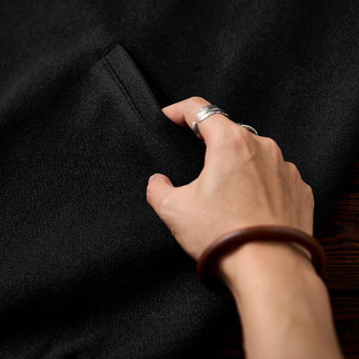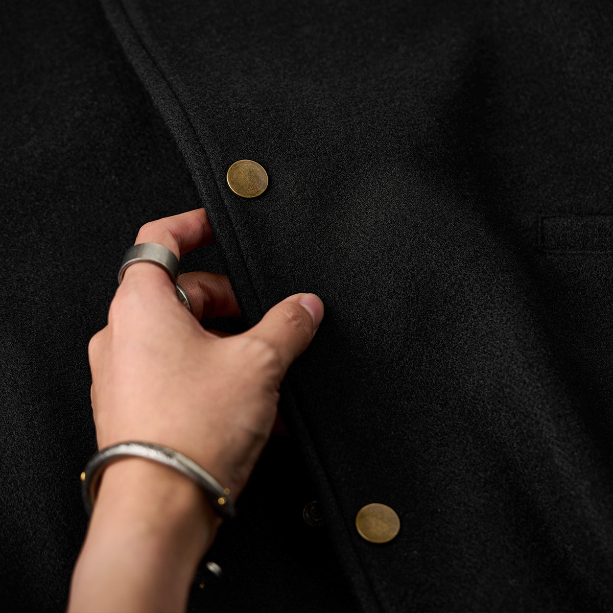 アメリカンカジュアルな爽やかな感覚をベースに、フロントに英文字を配したシンプルなデザインされています。ベースボールシャツの襟デザインは残しつつ、洗練されたクリーンな無地表情で、品があり高級感さえ伝わってきます。ミニマルなディテールでモダンな雰囲気があります。