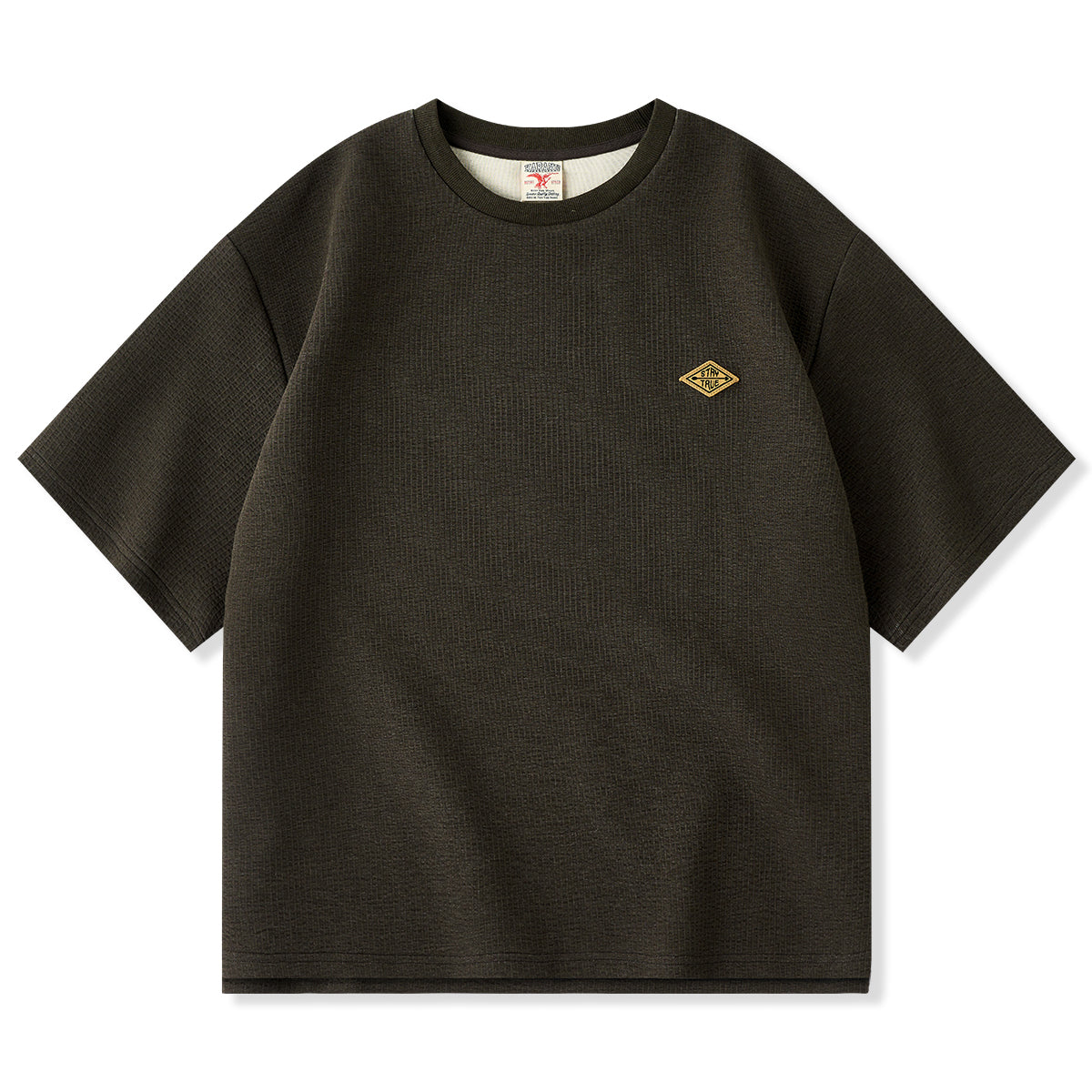 「STAY TRUE」の刺繍ワッペンが胸元にあしらわれた、