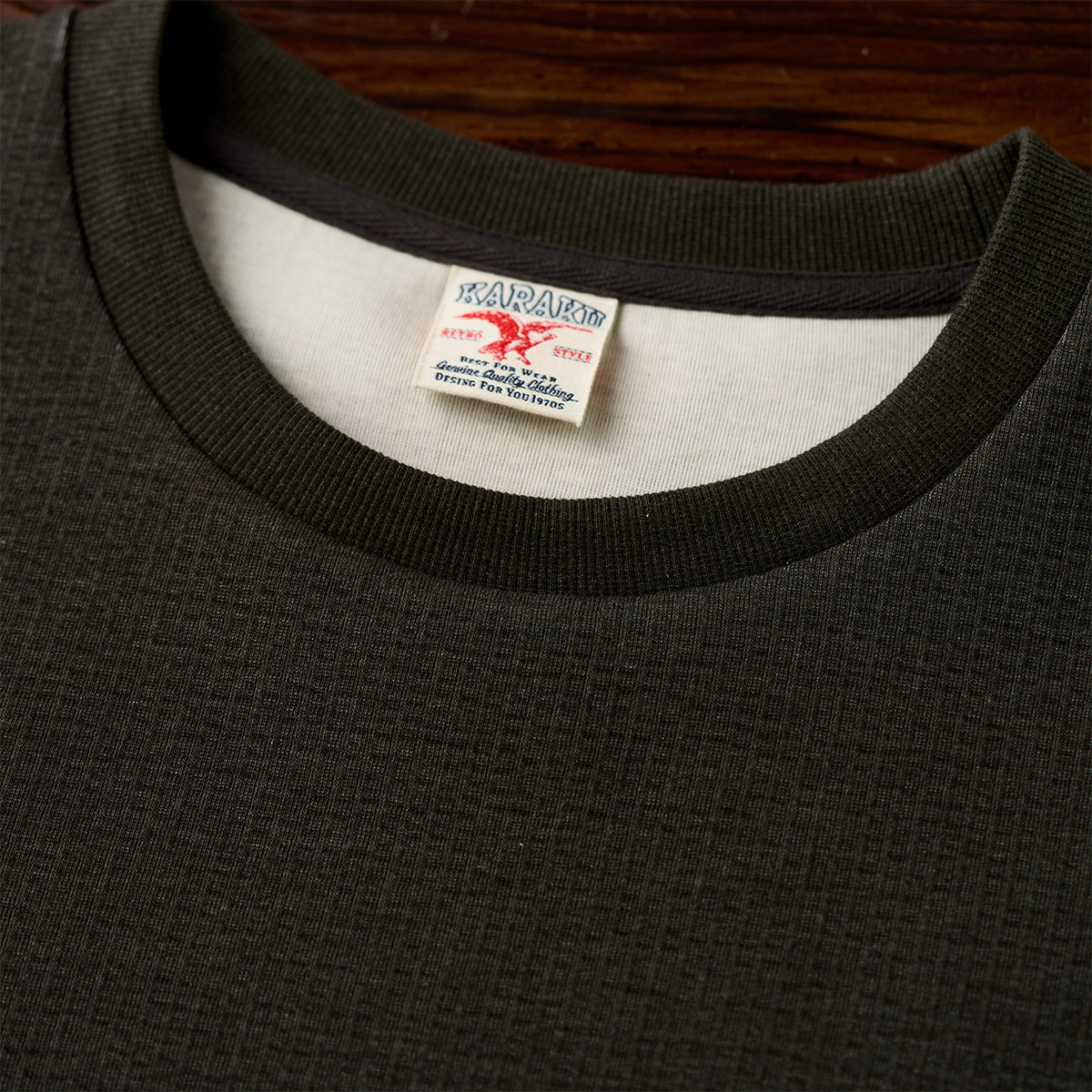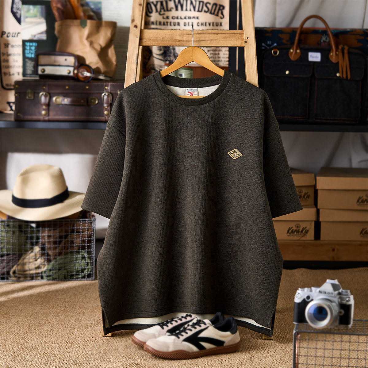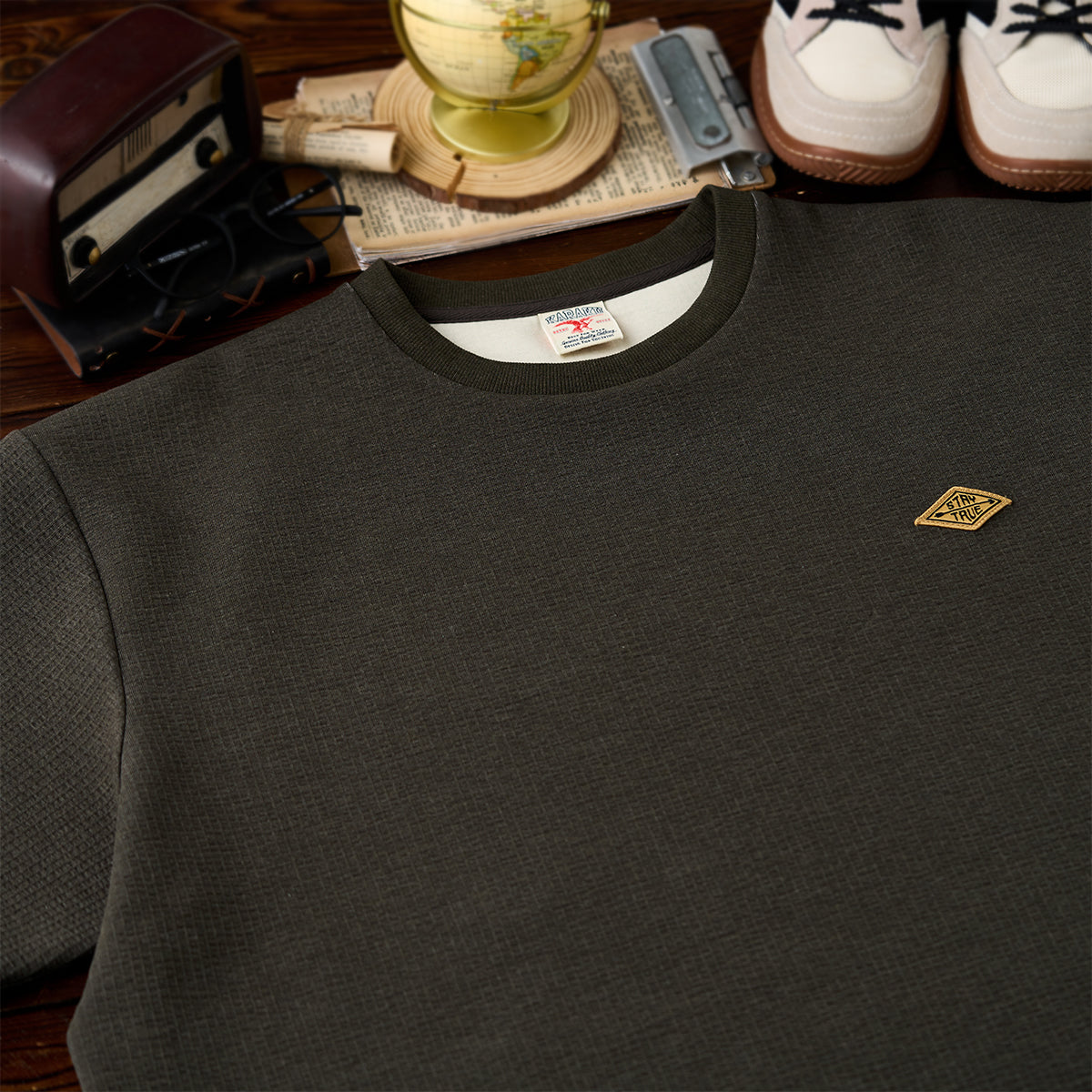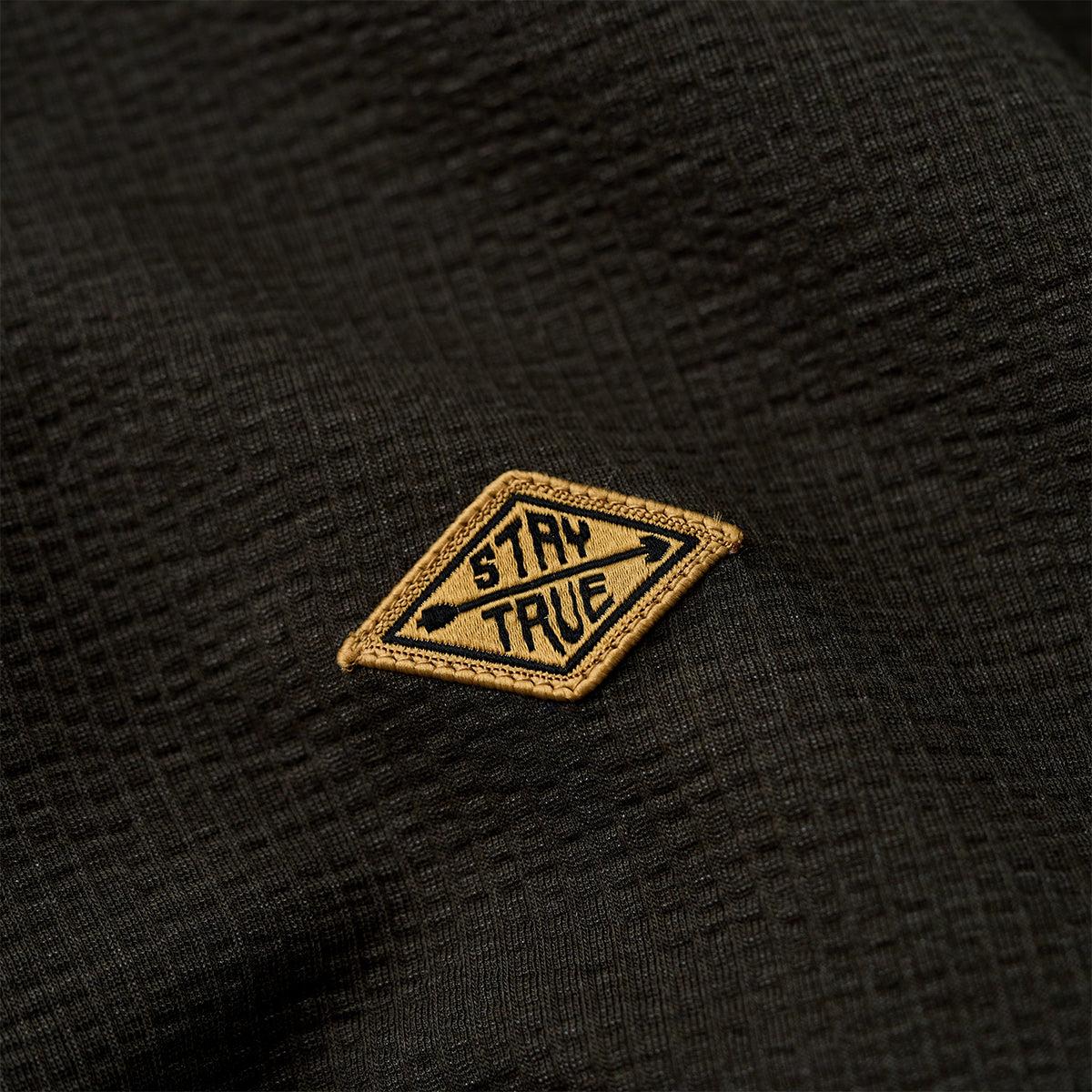 存在感を放つ「STAY TRUE」刺繍ワッペンが左胸に配置されたデザイン。