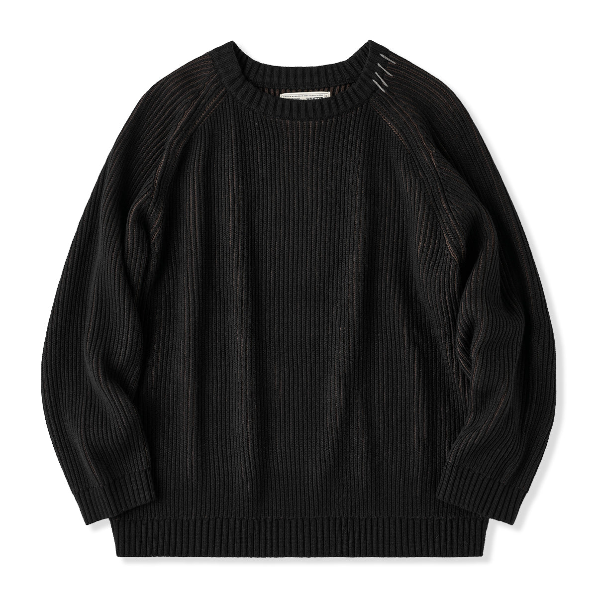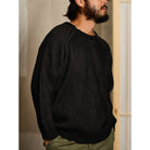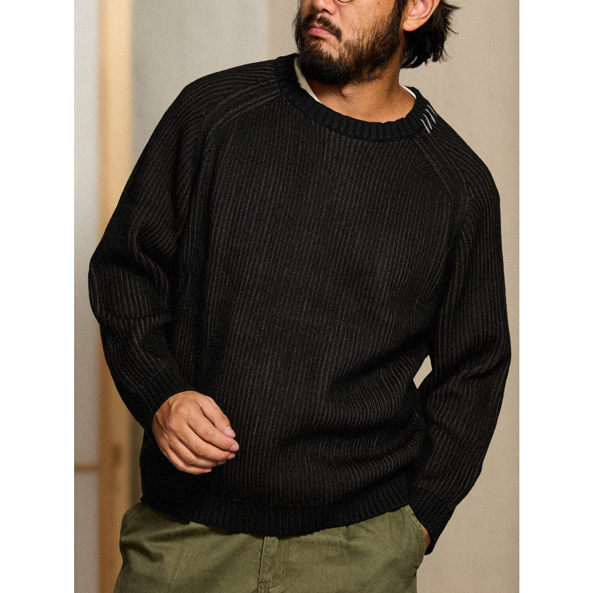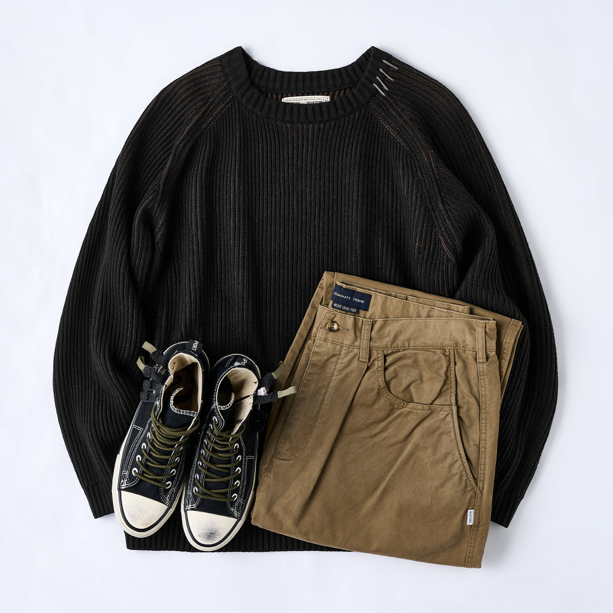 シンプルなクルーネックは、様々なスタイルに合わせやすく、着回しが良い。ラグランスリーブは、肩のラインが自然で動きやすく、リラックスした着心地をさらに高めている。