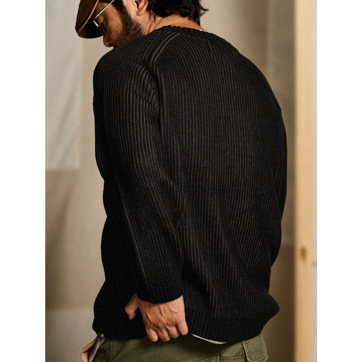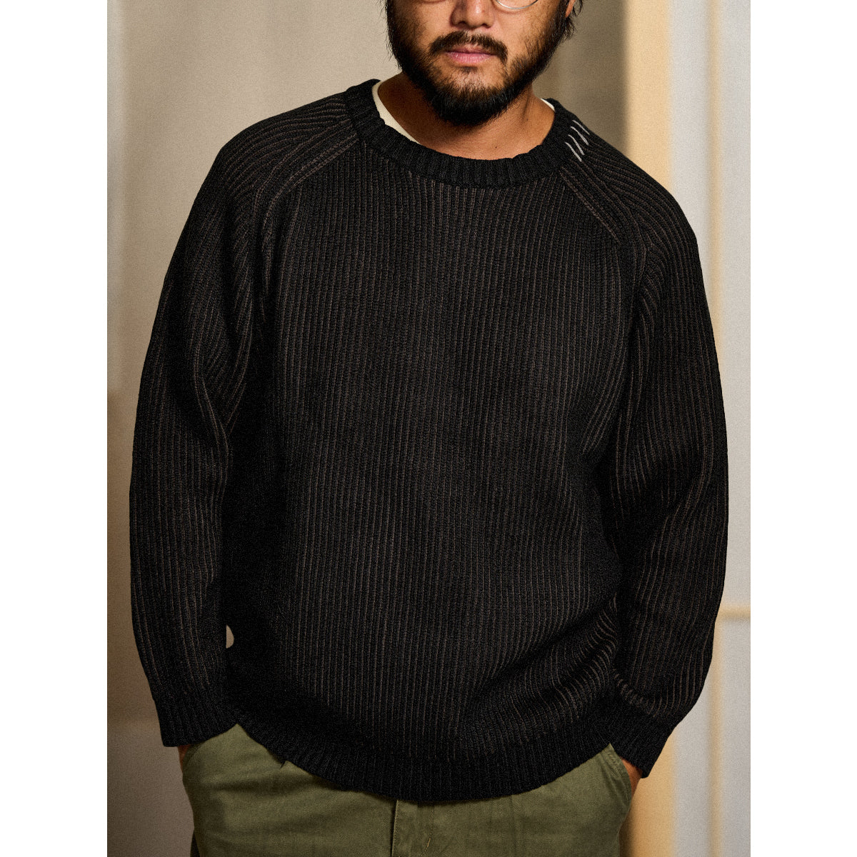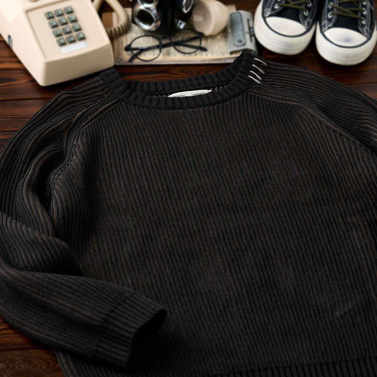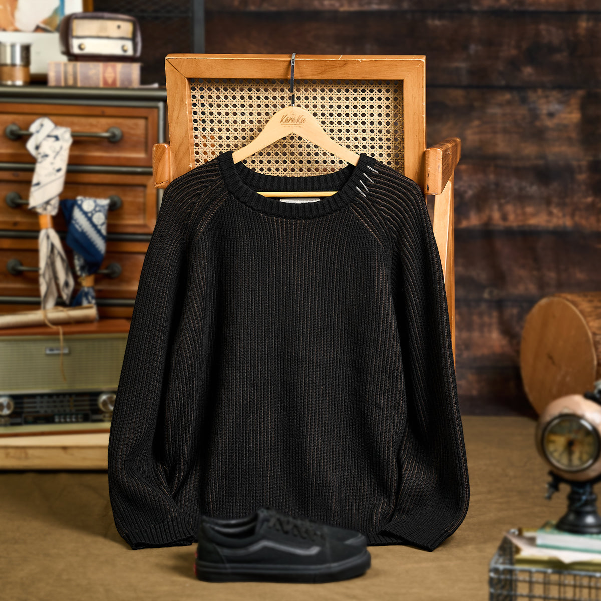 シンプルなクルーネックは、様々なスタイルに合わせやすく、着回しが良い。ラグランスリーブは、肩のラインが自然で動きやすく、リラックスした着心地をさらに高めている。