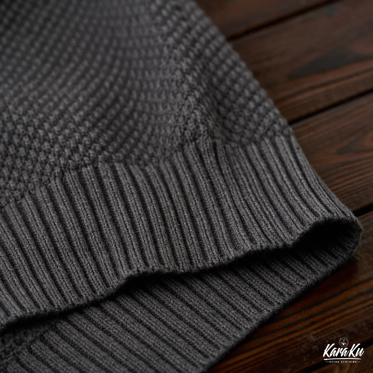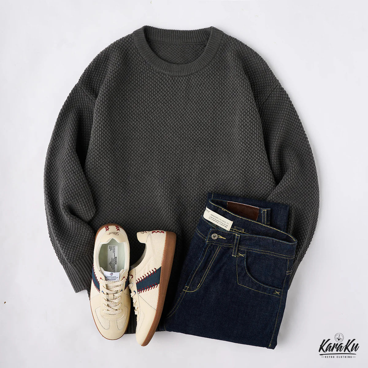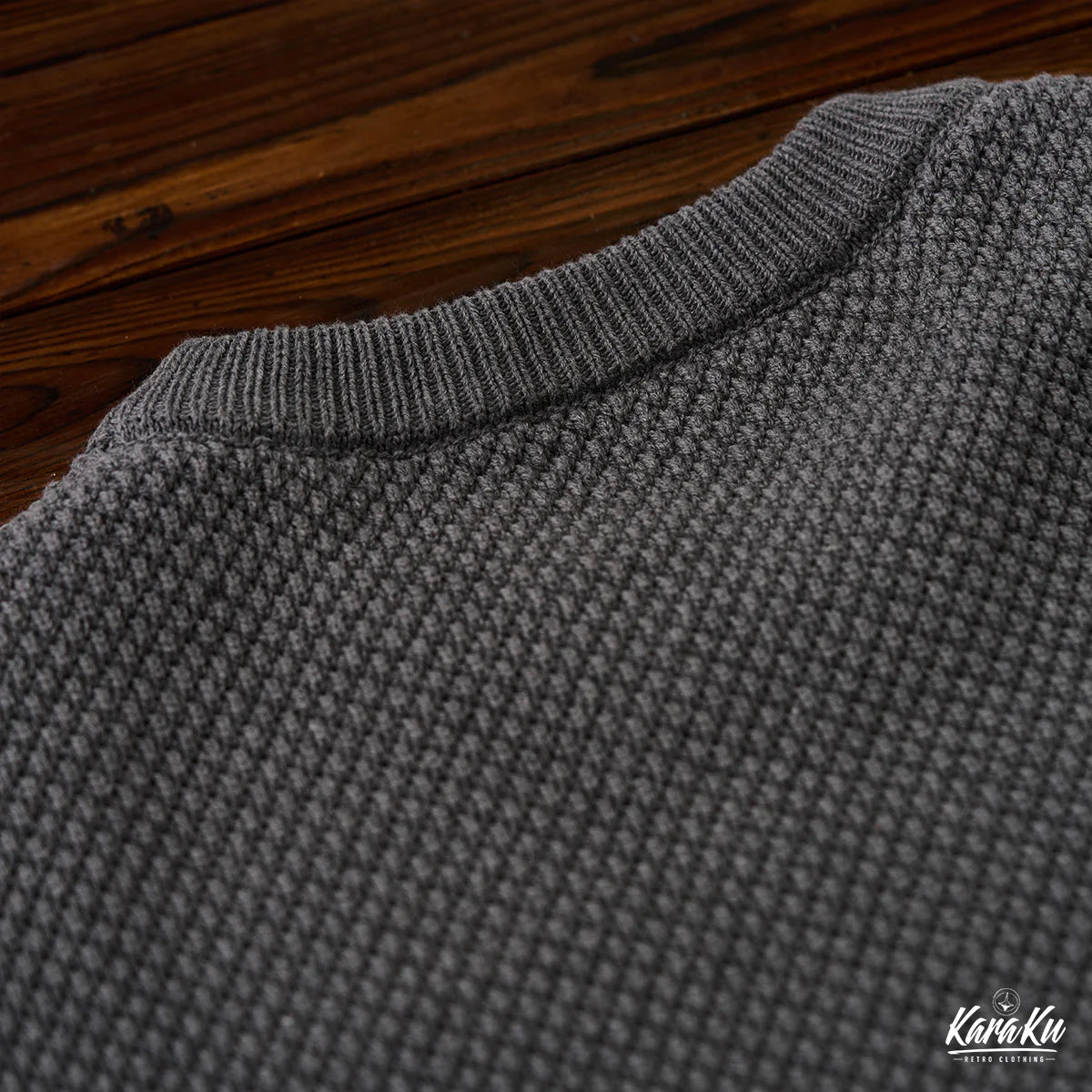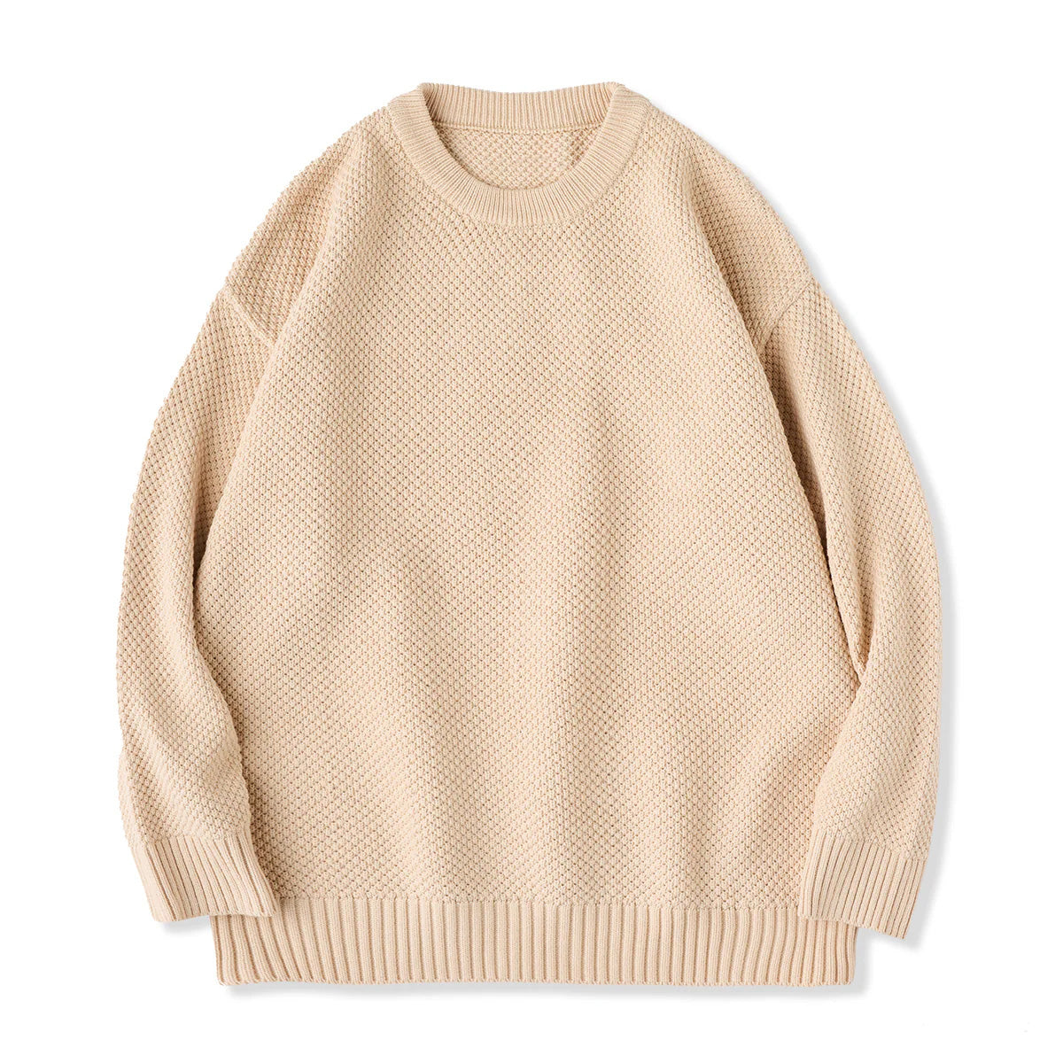 パイナップルパイルの凹凸のある編地が、デザインの大きな特徴で、見た目にも暖かみがあり、素材の質感を際立たせている。袖口と裾は、リブ編みのデザインになって、伸縮性があり、着心地の良さを高めている。