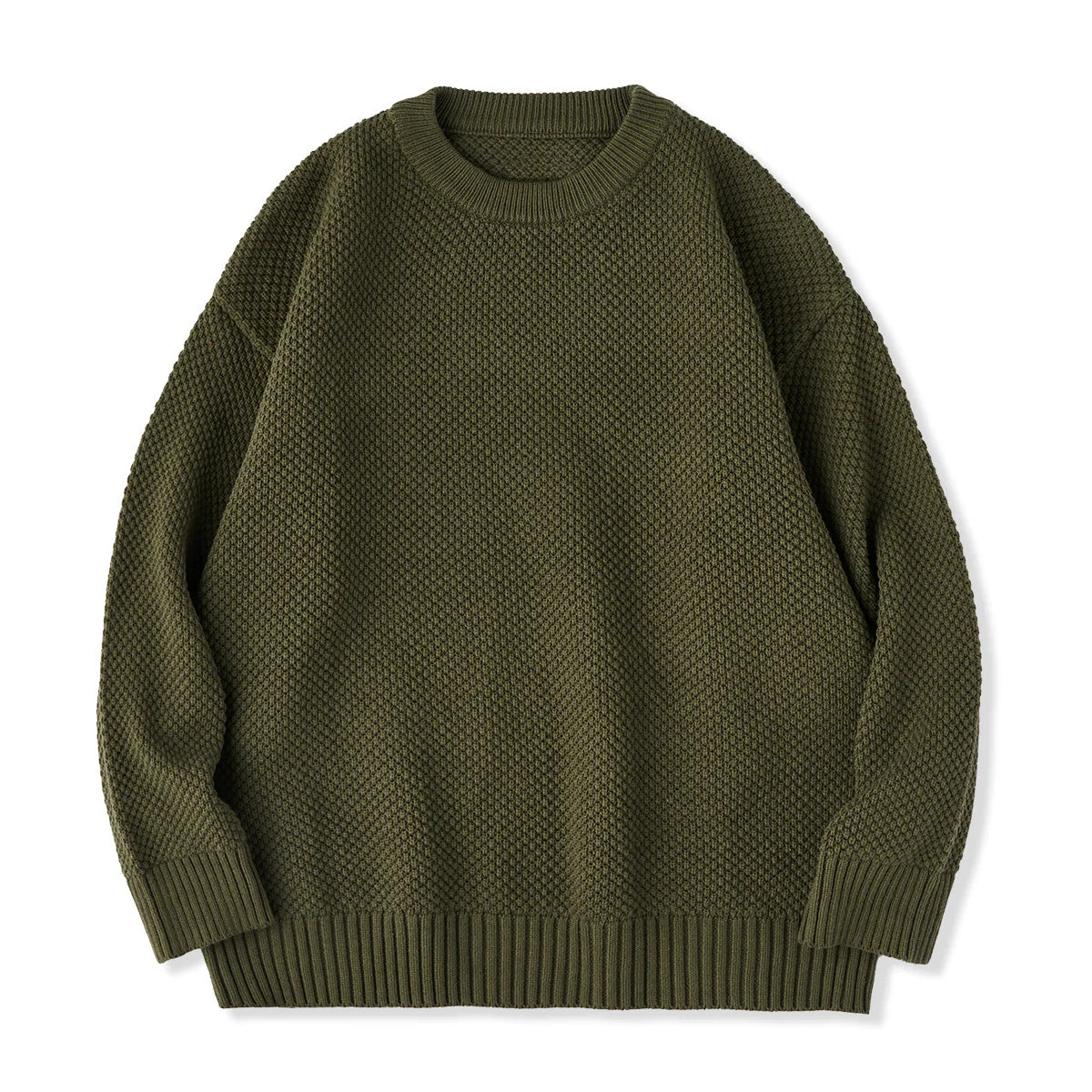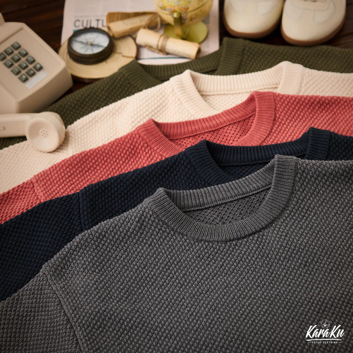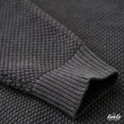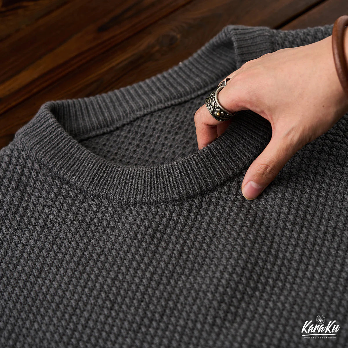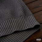パイナップルパイルの凹凸のある編地が、デザインの大きな特徴で、見た目にも暖かみがあり、素材の質感を際立たせている。袖口と裾は、リブ編みのデザインになって、伸縮性があり、着心地の良さを高めている。