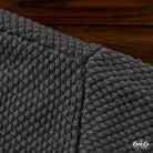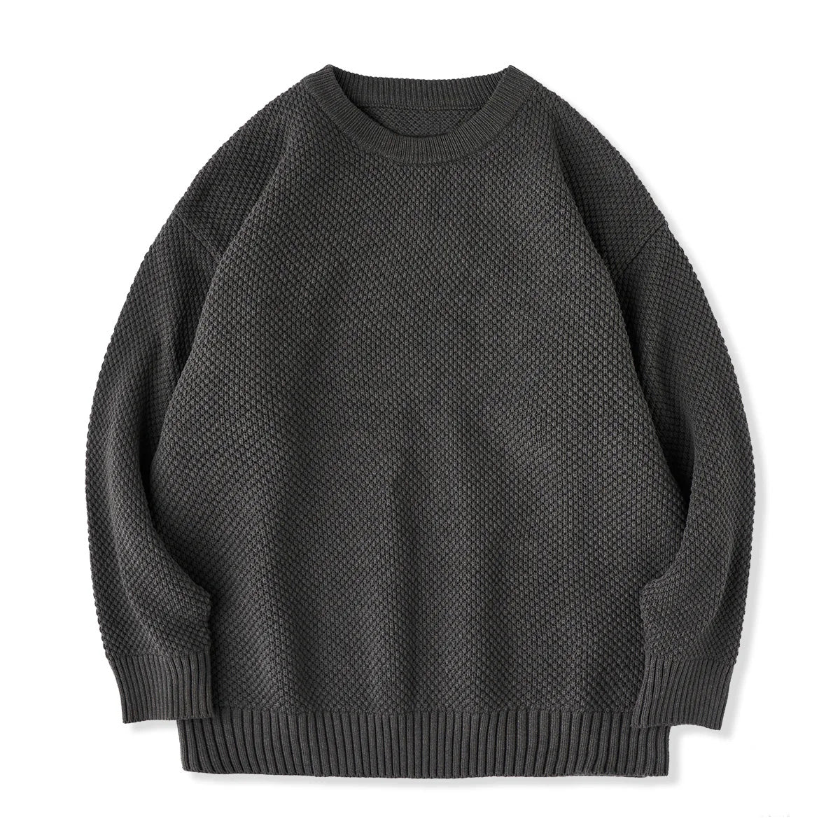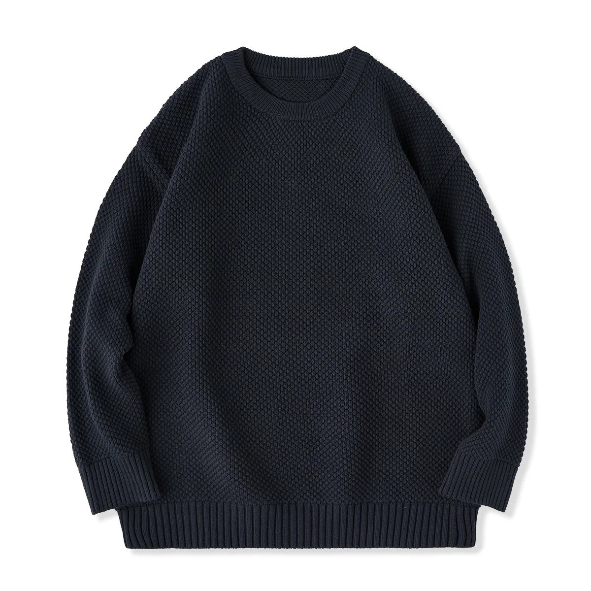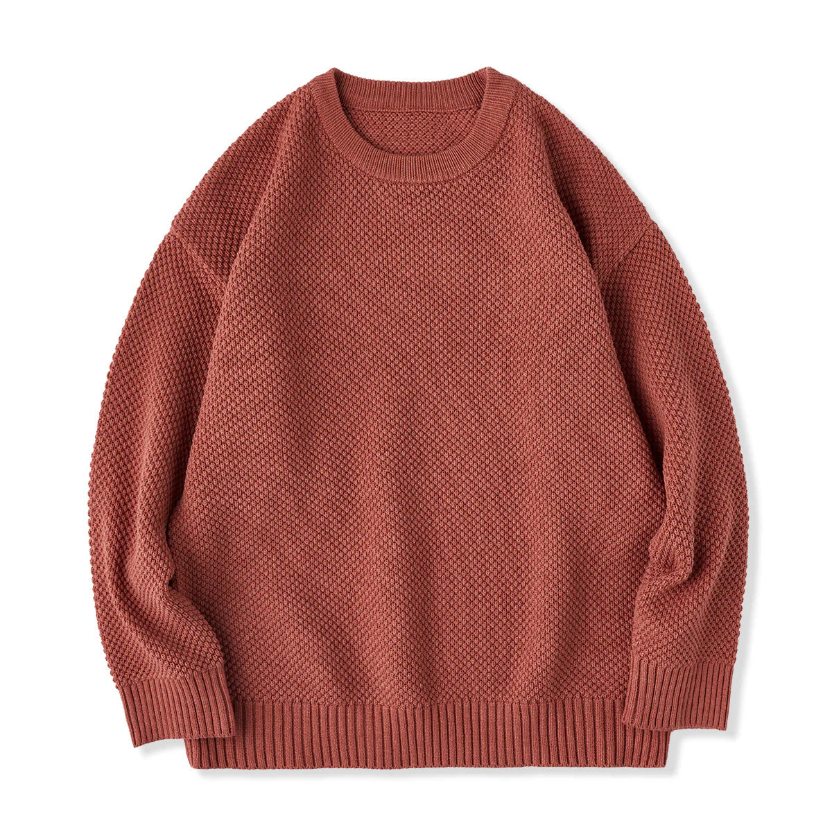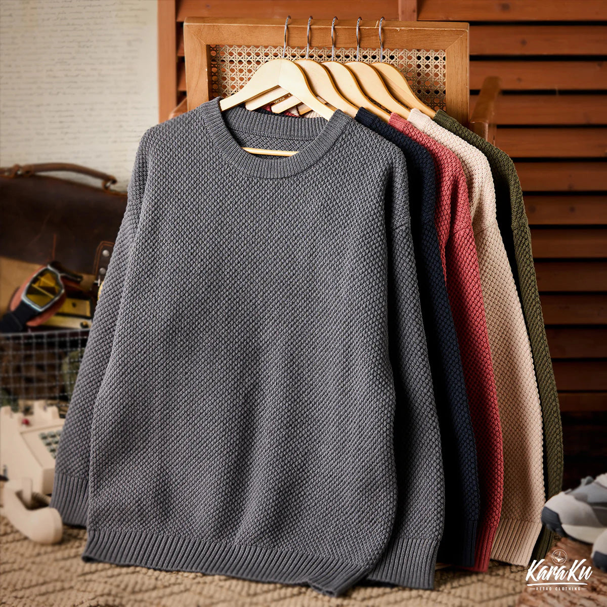 パイナップルパイルの凹凸のある編地が、デザインの大きな特徴で、見た目にも暖かみがあり、素材の質感を際立たせている。袖口と裾は、リブ編みのデザインになって、伸縮性があり、着心地の良さを高めている。