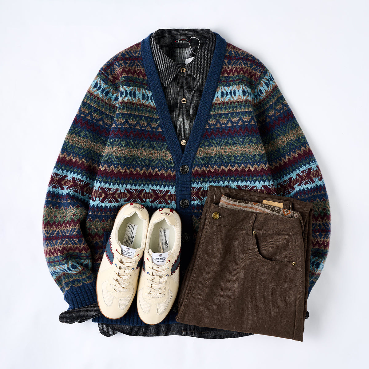 シンプルなトップスと合わせることで、エスニック柄が引き立つコーディネートが可能です。アウトドアやリラックスしたカジュアルなシーンで活躍する一着といえます。