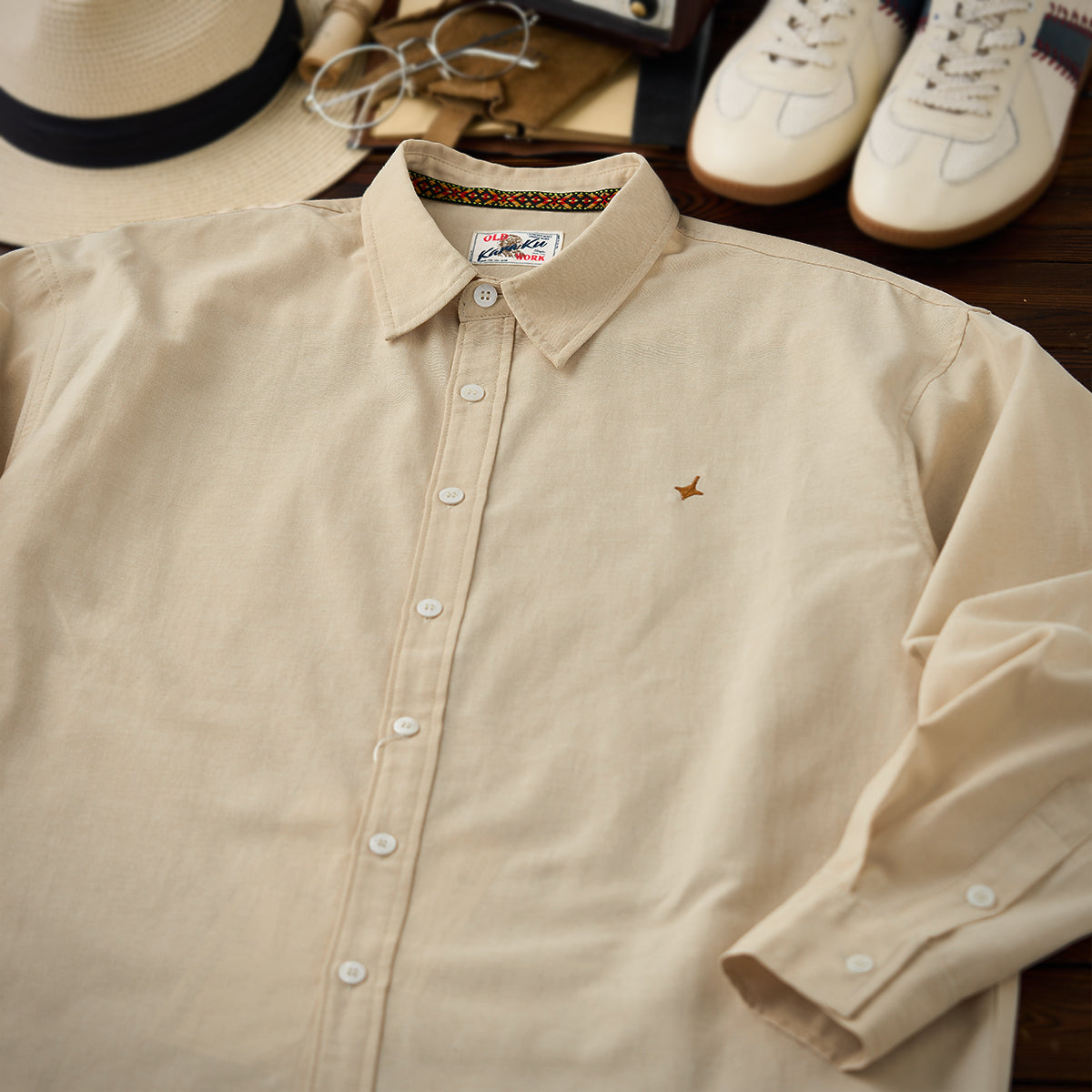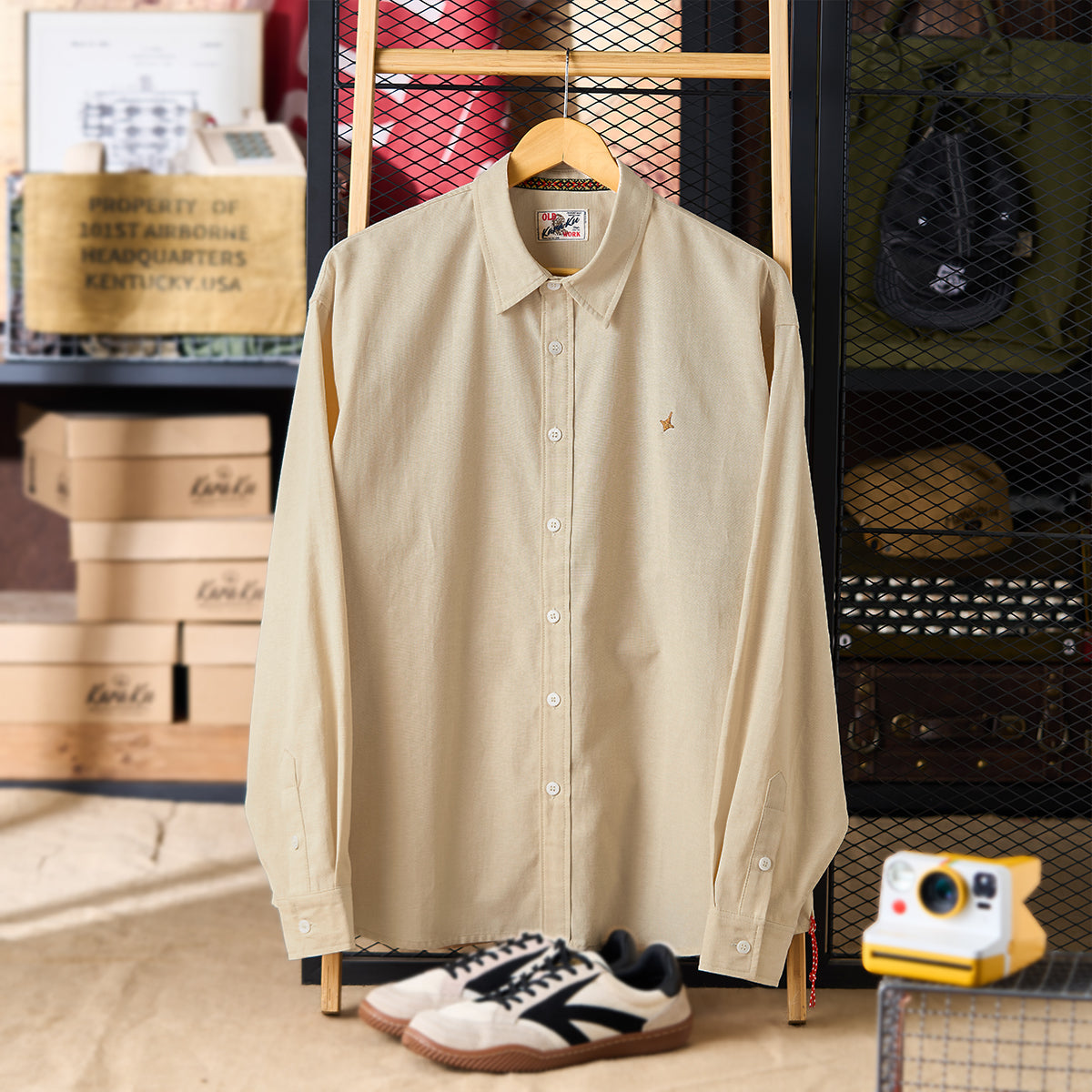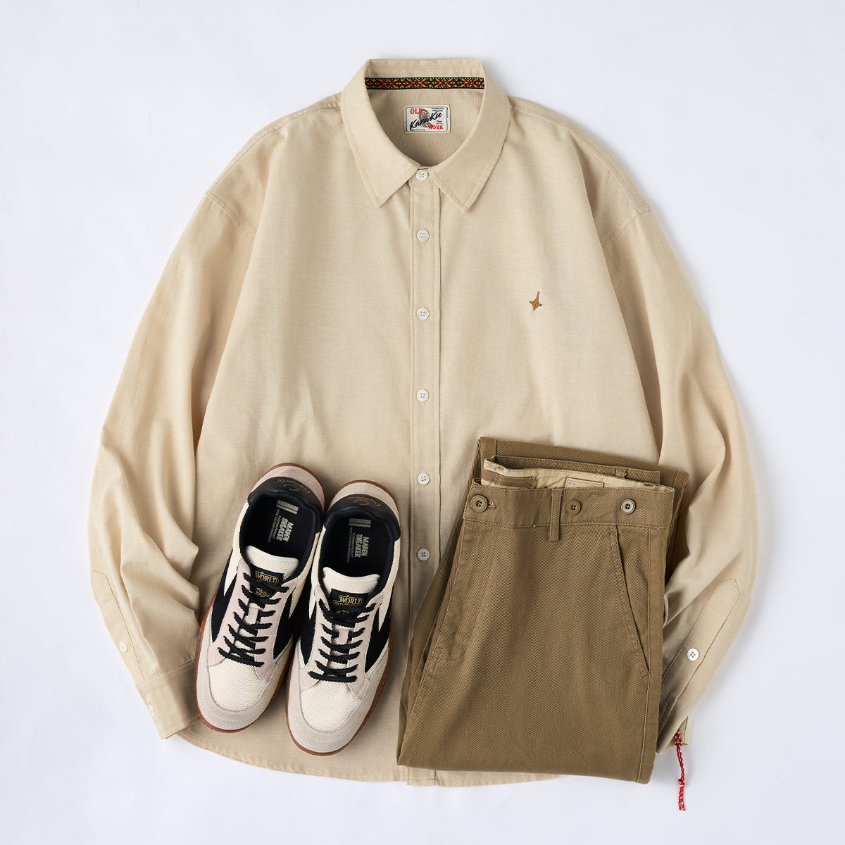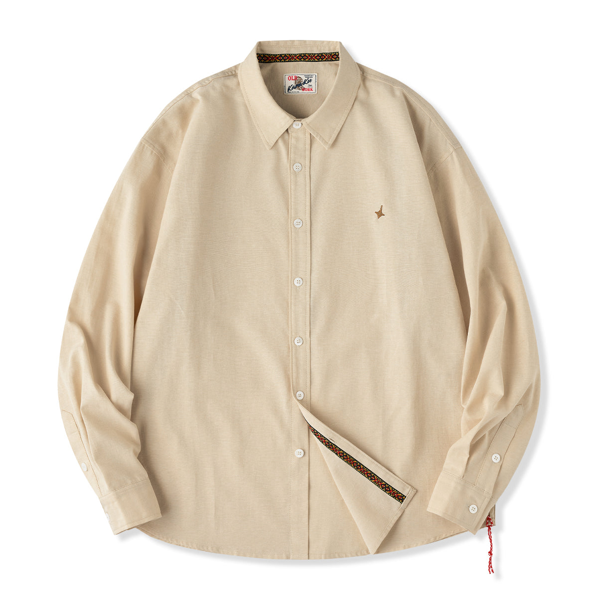 ベーシックなオックスフォードシャツに、Karakuらしい遊び心を加えた長袖シャツ。胸元には、ブランドアイコンである「コマ」ロゴの刺繍をさりげなく施し、シンプルな中に確かな存在感を添えています。着込むほどに柔らかく馴染み、日常使いに最適な一枚です。裾には印象的な赤ヒモをアクセントとしてプラス。前立て内側には、民族調の織りジャカードテープをさりげなく配し、見えない部分にまでこだわったディテールが、ボタンを開けた際に上質感を演出します。一枚着としてはもちろん、ジャケットやアウターのインナーとしても活躍。デニムやチノパン、ワークパンツまで幅広いスタイルに対応する、Karakuならではのデザインシャツです。
