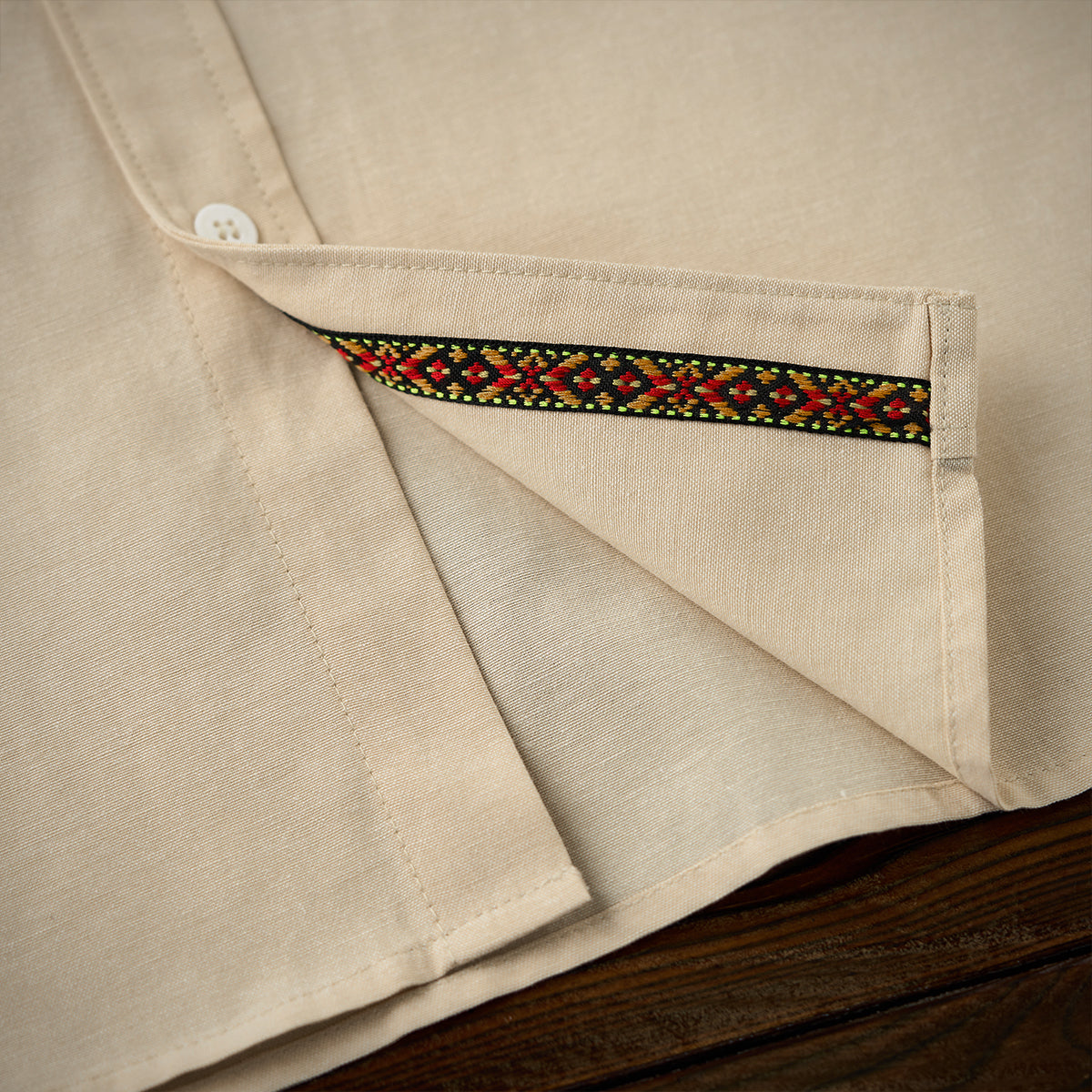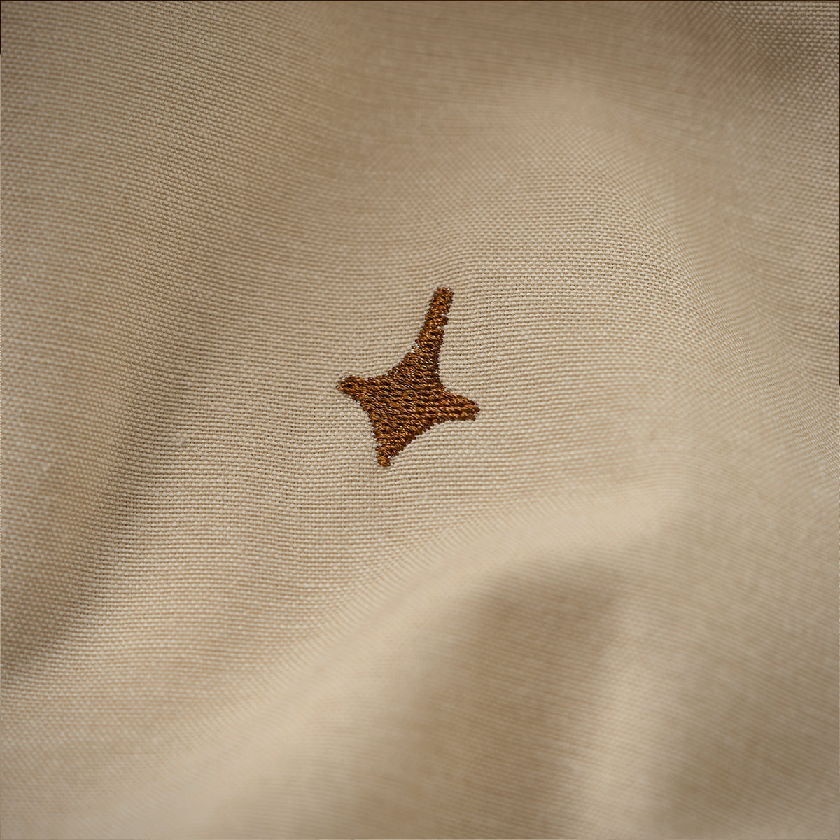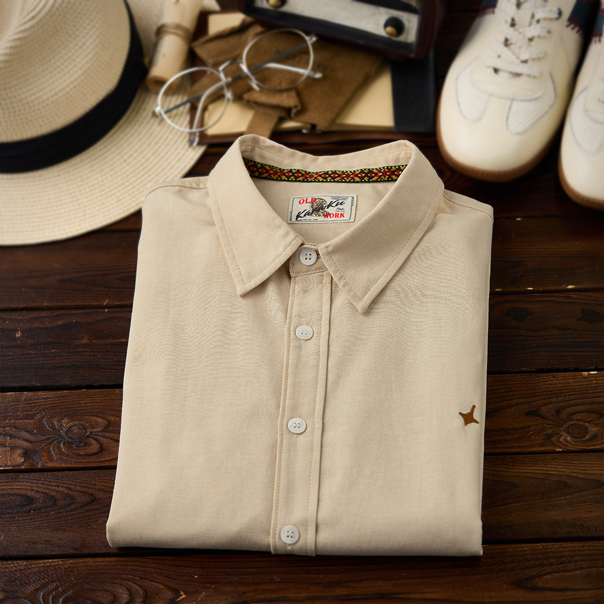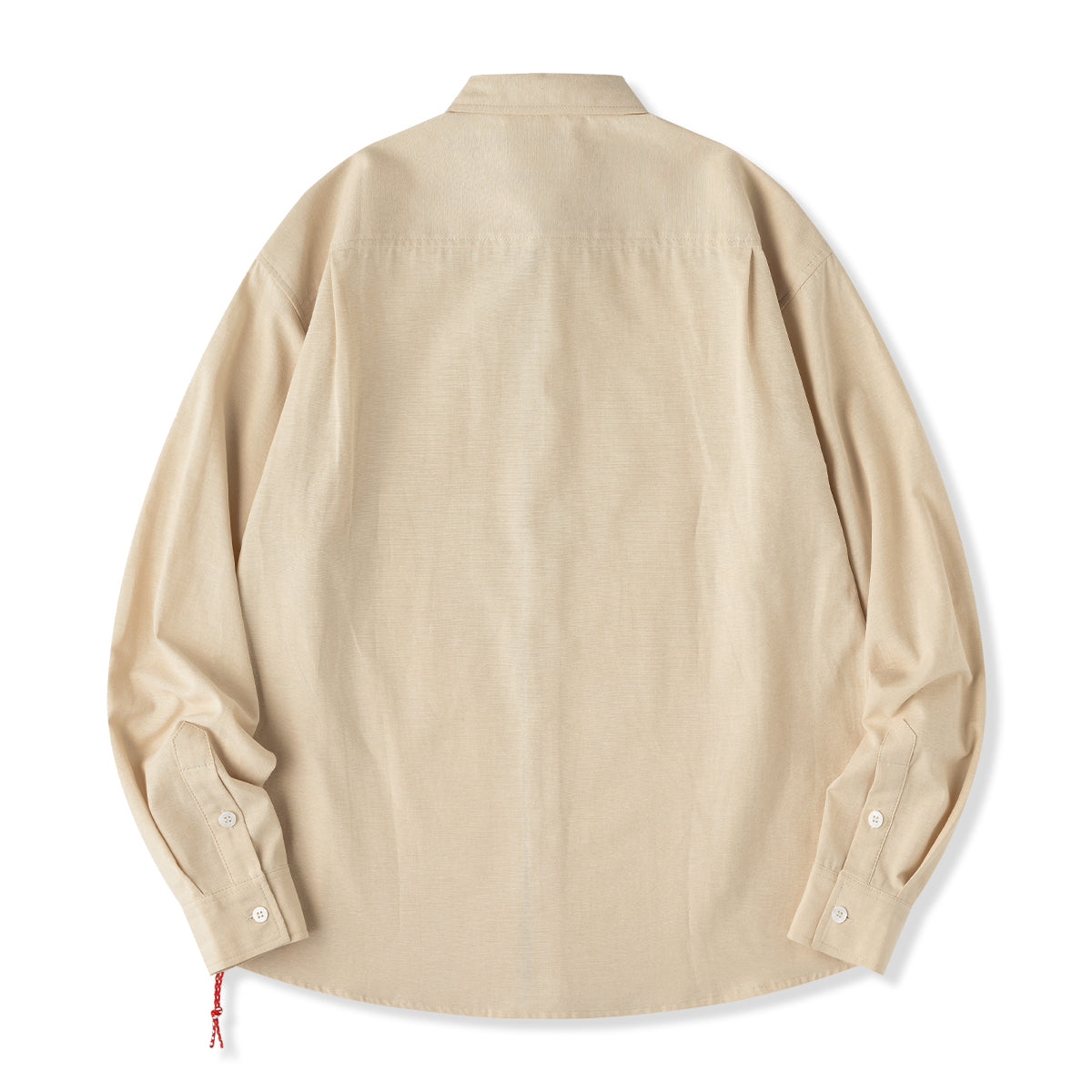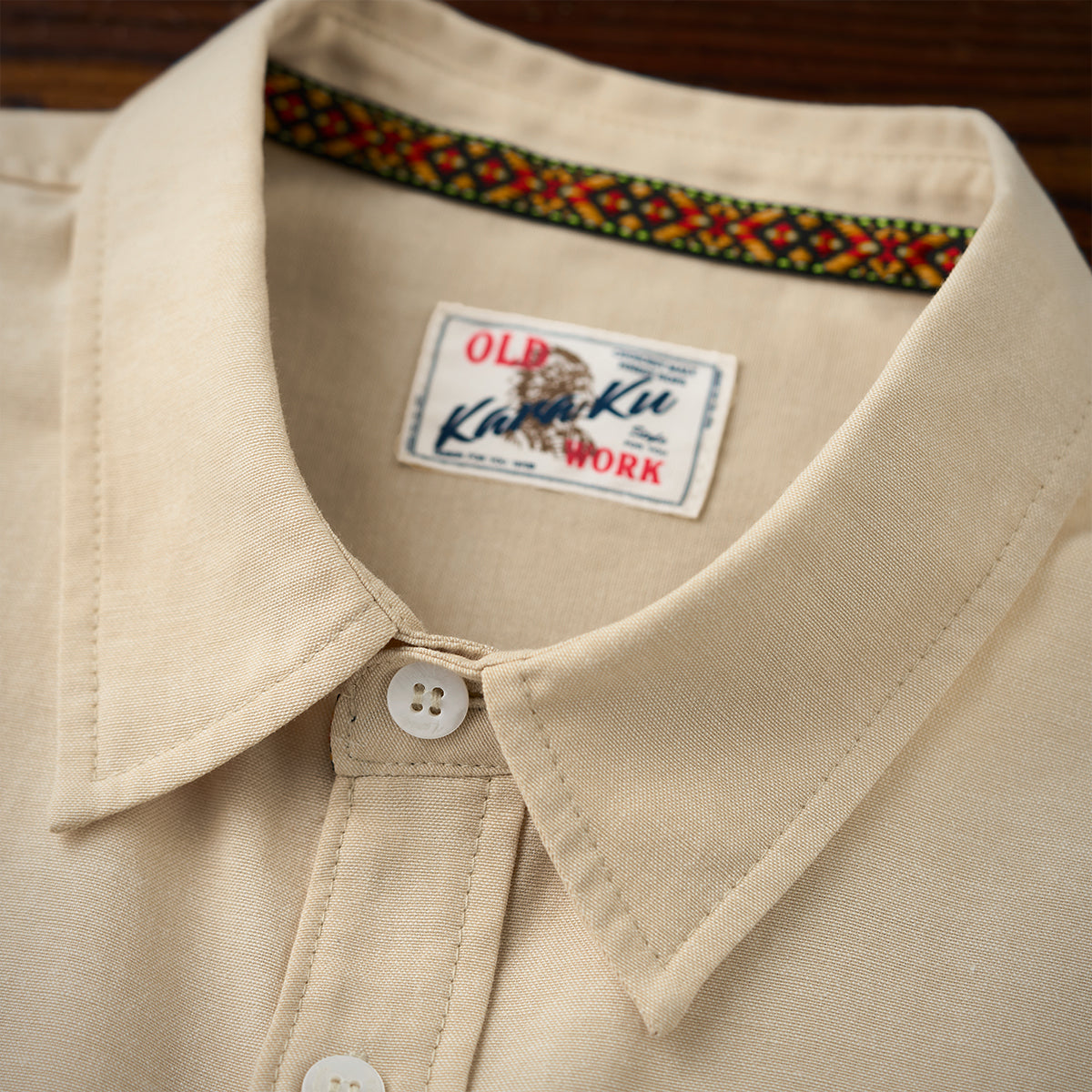 ベーシックなオックスフォードシャツに、Karakuらしい遊び心を加えた長袖シャツ。胸元には、ブランドアイコンである「コマ」ロゴの刺繍をさりげなく施し、シンプルな中に確かな存在感を添えています。着込むほどに柔らかく馴染み、日常使いに最適な一枚です。裾には印象的な赤ヒモをアクセントとしてプラス。前立て内側には、民族調の織りジャカードテープをさりげなく配し、見えない部分にまでこだわったディテールが、ボタンを開けた際に上質感を演出します。一枚着としてはもちろん、ジャケットやアウターのインナーとしても活躍。デニムやチノパン、ワークパンツまで幅広いスタイルに対応する、Karakuならではのデザインシャツです。