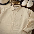 【予約】Karaku「コマ」ロゴ刺繍入り 赤ヒモ付きオックスフォード長袖シャツ