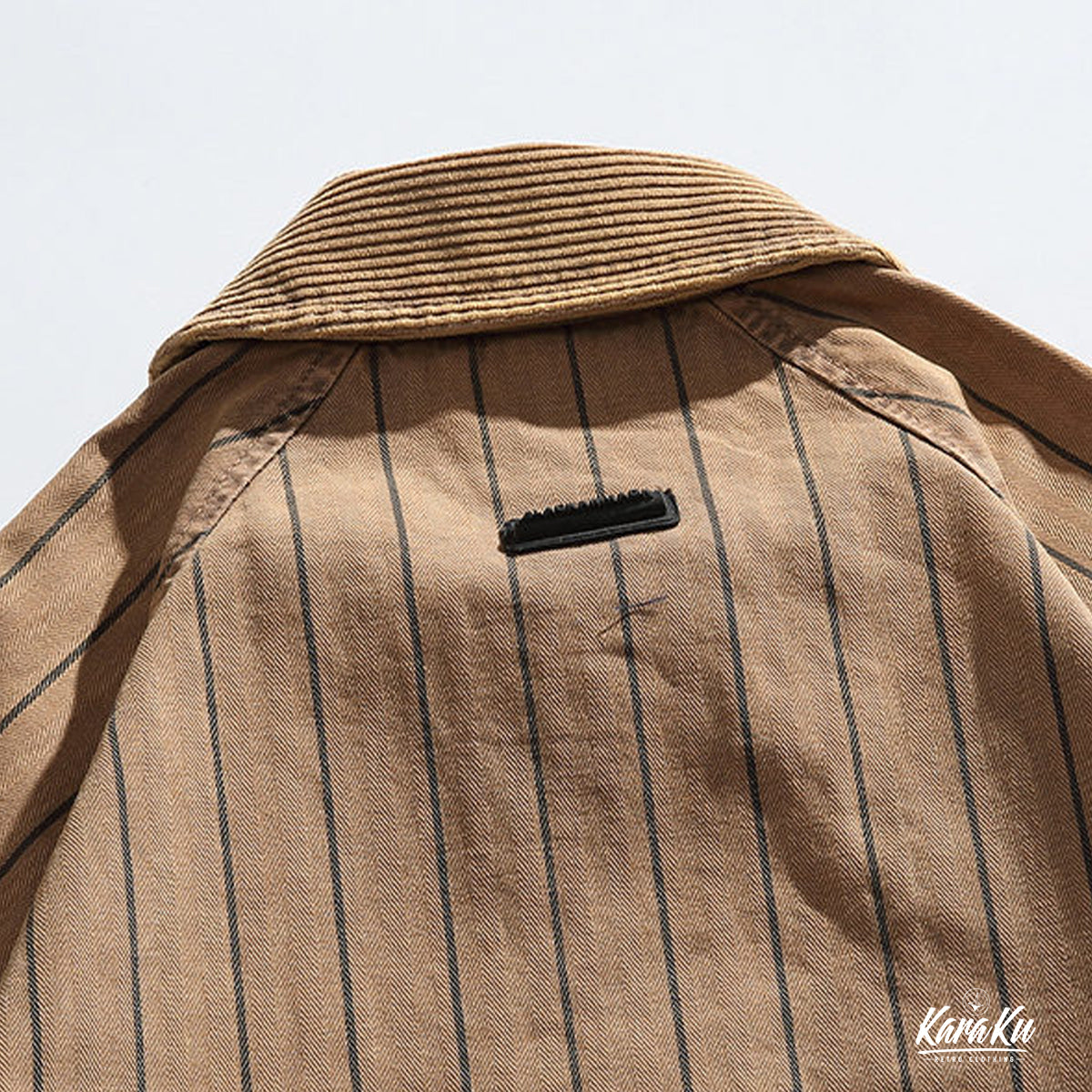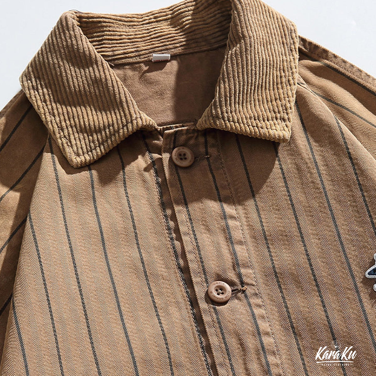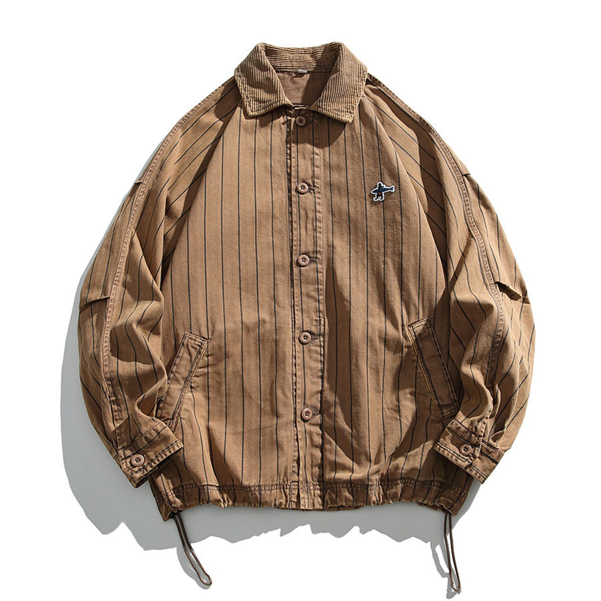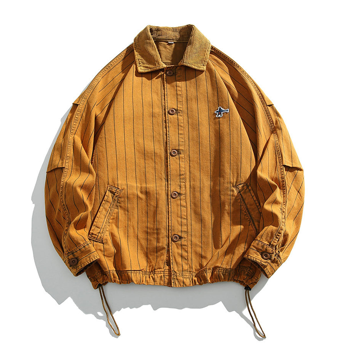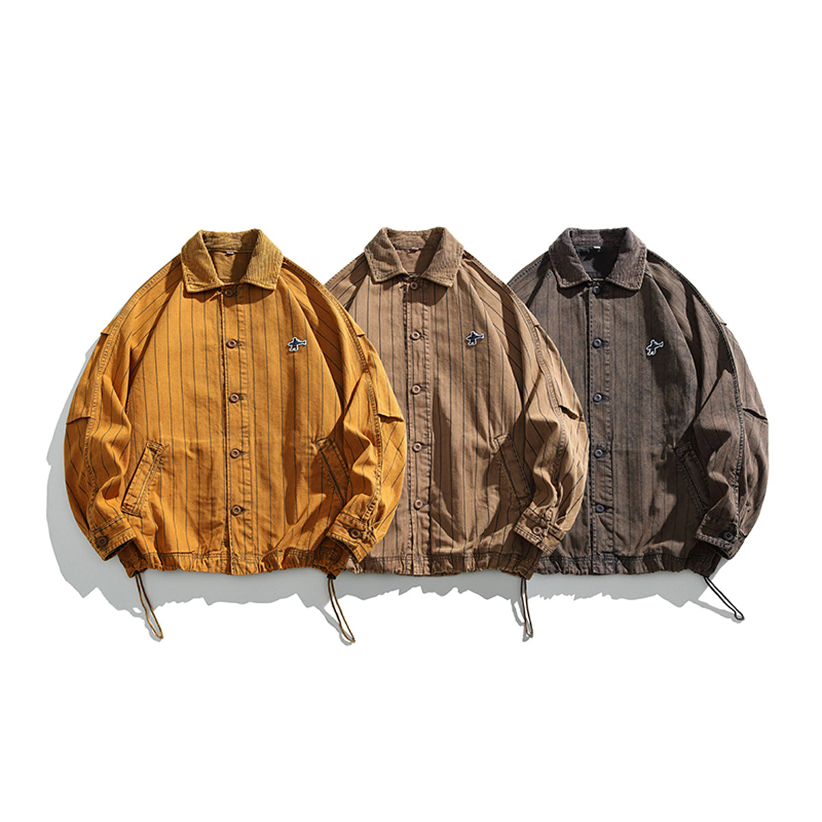 襟・コーデュロイ 刺繍バッジ入りストライプ柄ラグランジャケット