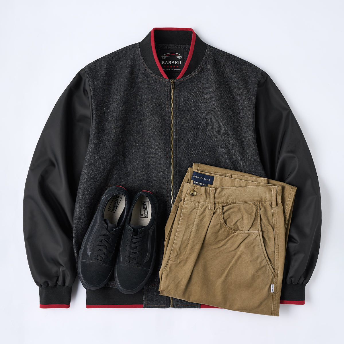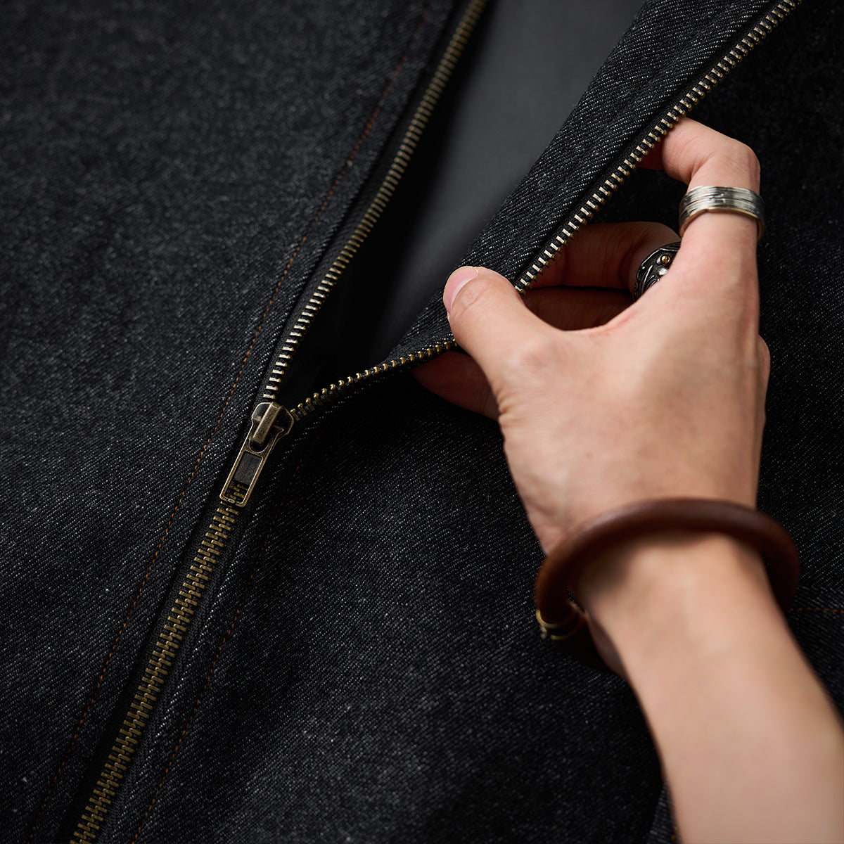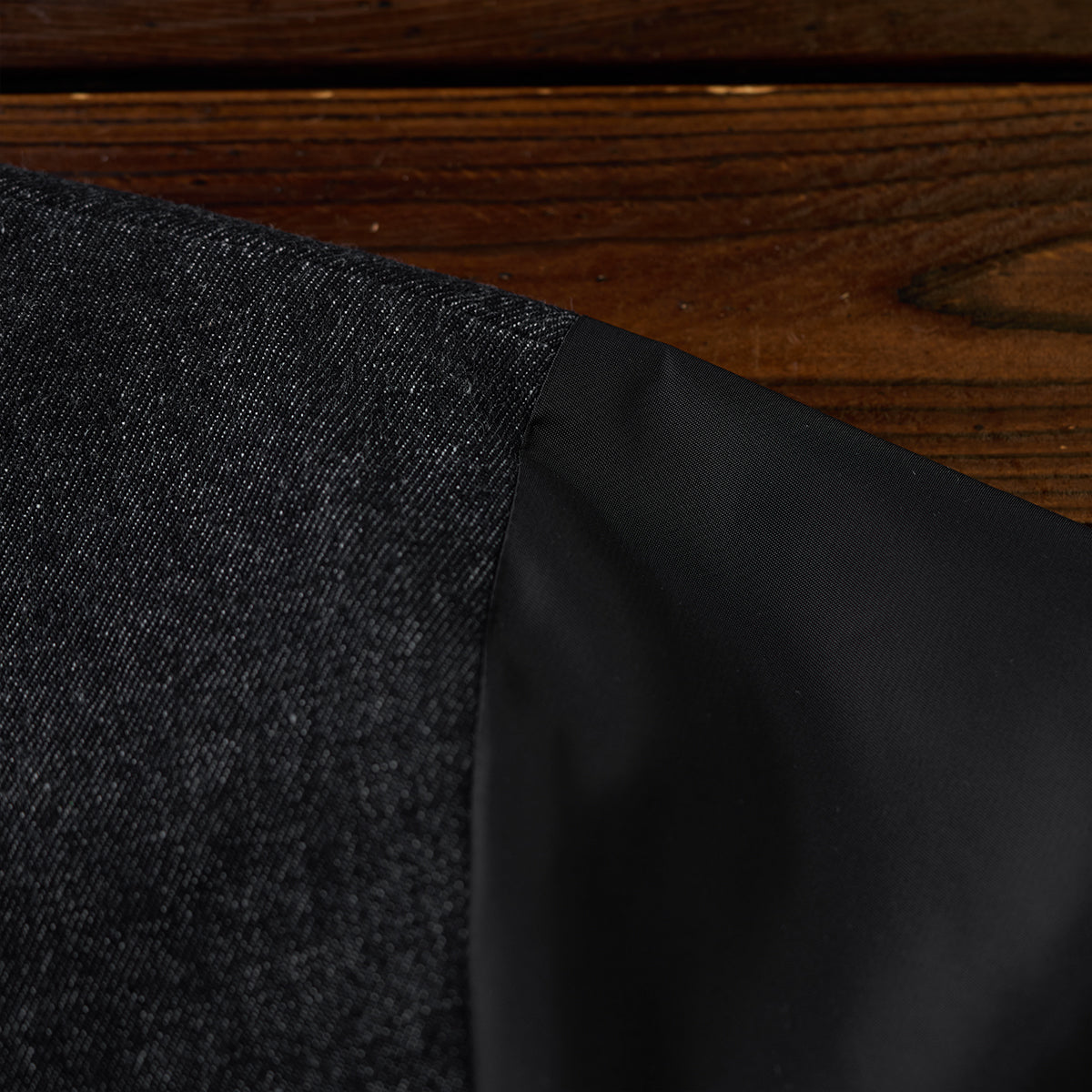 タフな表情を持つデニム素材と、軽量で機能的なナイロン素材を組み合わせた、異素材コンビ仕様のフライトジャケット。身頃には程よい厚みのデニムを採用し、ワークウェア由来の無骨さと経年変化の楽しみを表現。一方で、袖にはナイロン素材を配し、ミリタリーウェアらしい軽快さと実用性をプラスしました。異なる質感が生み出すコントラストが、シンプルなスタイリングの中でも存在感を放ちます。シルエットは程よくゆとりを持たせ、インナーを選ばず着用可能。デニムの重厚感とナイロンの軽さを併せ持ち、秋冬から春先までロングシーズン活躍します。