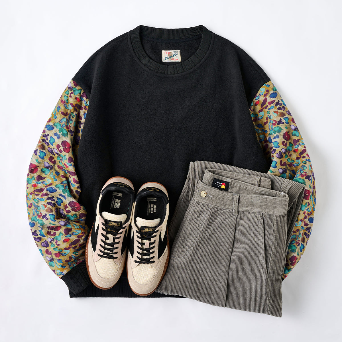 日本画家・川又聡とのコラボレーションによる、アートシリーズ「夢豹」をモチーフにしたプルオーバースウェット。幻想的な表情を見せる豹を大胆に描いたグラフィックが、静寂と野性を共存させた独特の世界観を放ちます。袖部分には豹柄プリントキルト生地を切り替え、左右のコントラストが際立つデザインに。力強さと繊細さを併せ持つ川又聡氏の筆致を、karakuらしいモダンストリートの感性で再構築しました。ゆったりとしたシルエットでリラックス感のある着心地ながら、1枚で主役になる存在感。アートとファッションが融合した、他にはない一着です。
