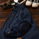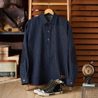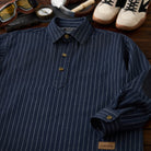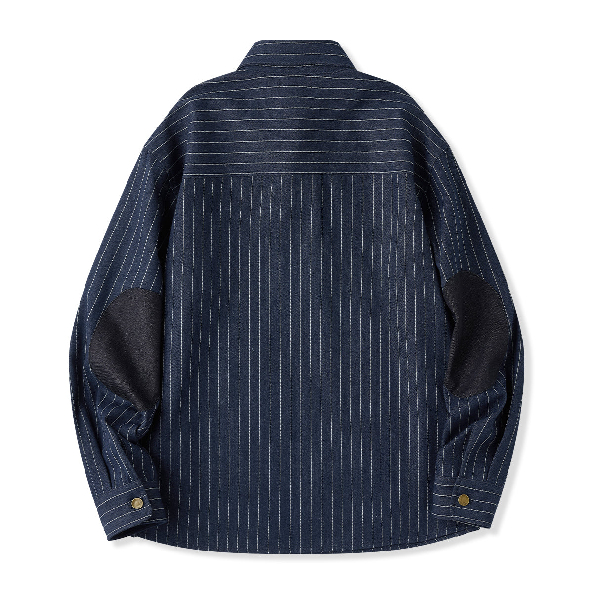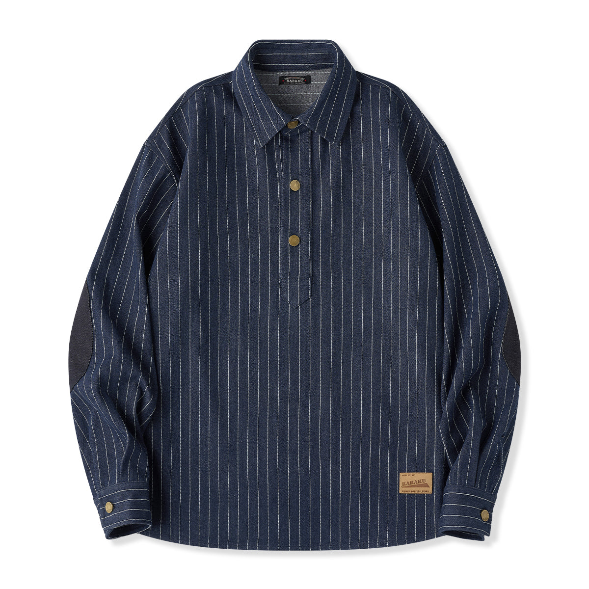 【予約】肘パッチ入り ハーフボタン付きストライプ柄デニムプルオーバーシャツ