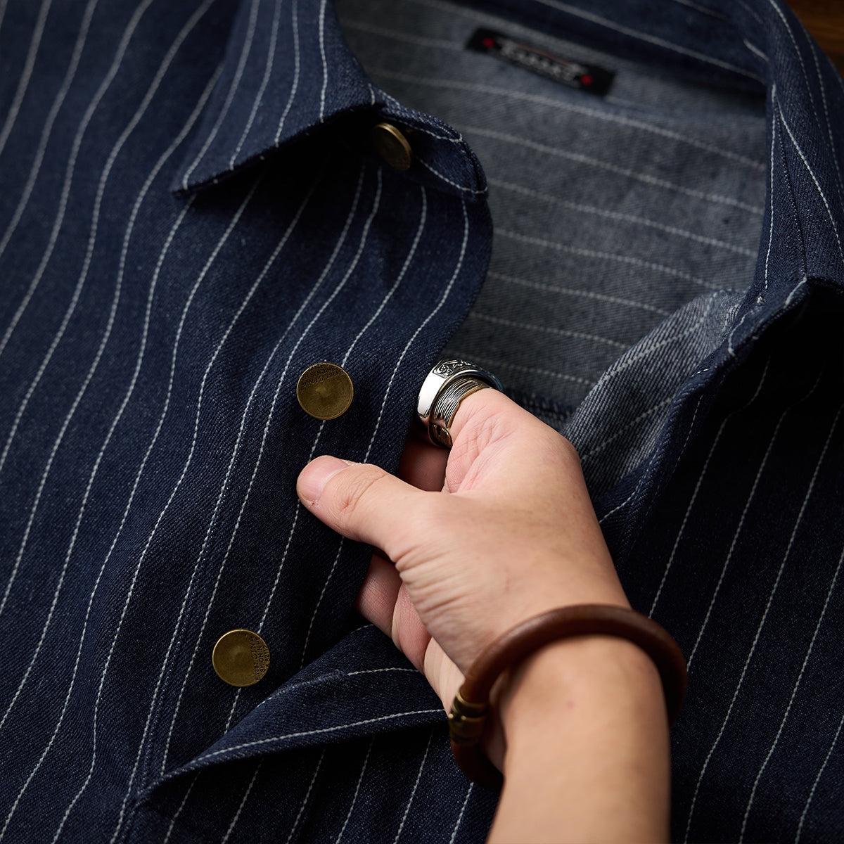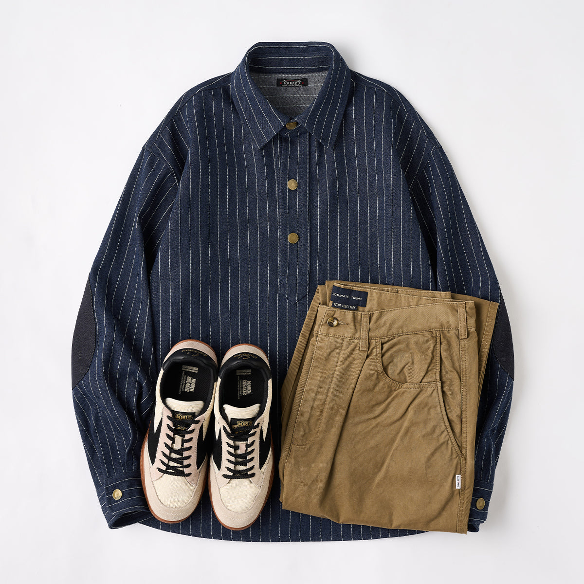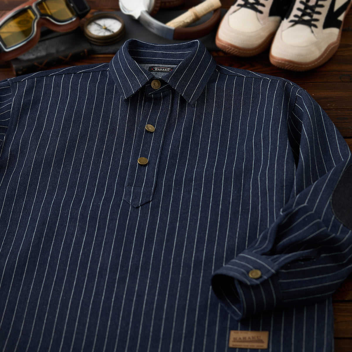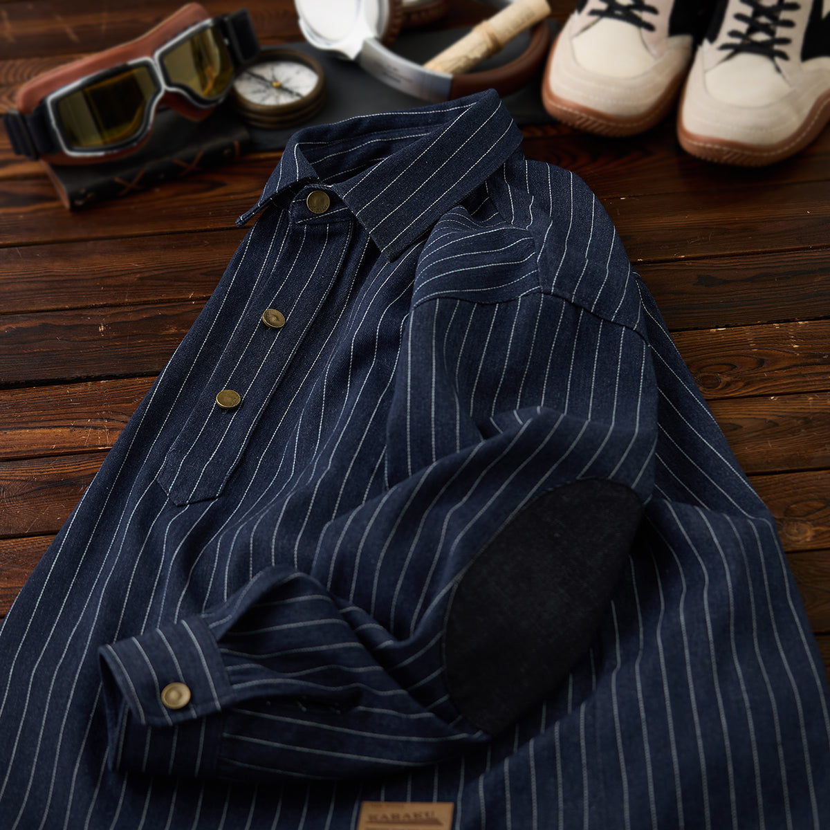 程よくハリのあるデニム生地に、細かなストライプ柄を乗せたプルオーバーシャツ。カジュアルながらもどこか上品さを感じさせる一本です。胸元にはハーフアンティーク調のボタンを採用し、デザインのアクセントに。丸い肘パッチが両袖に配置されて、デザイン性だけでなく機能性も考慮されています。軽い着心地ながらもしっかりとした耐久性があり、季節の変わり目にも使いやすい仕様です。一枚で着ても、インナーとして重ねてもサマになる万能デザイン。デニムの風合いとストライプの清潔感を兼ね備えた、大人のためのプルオーバーシャツです。