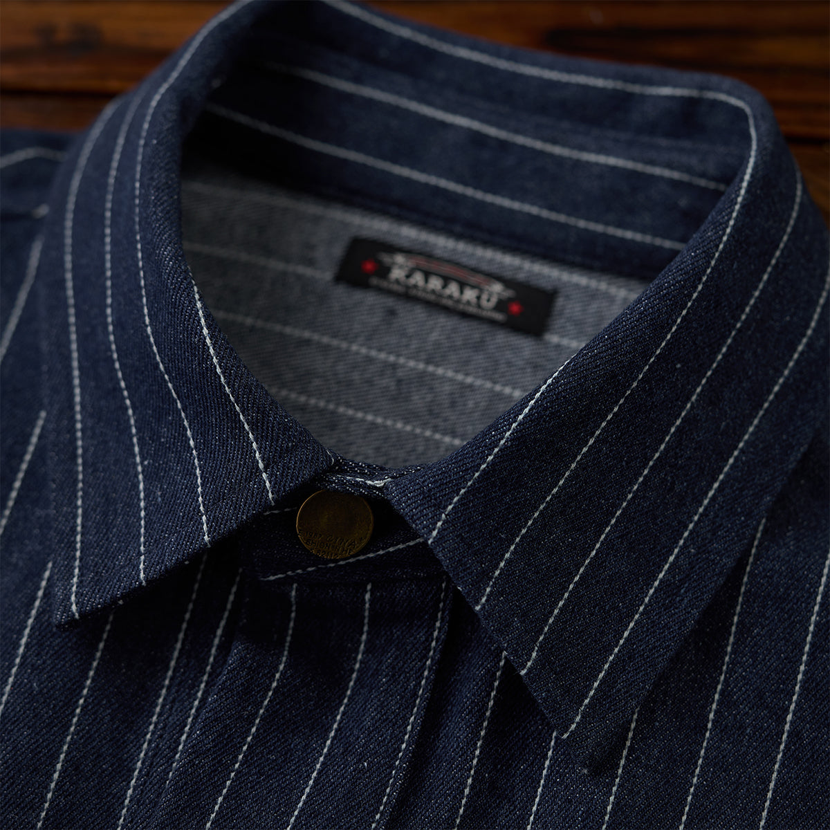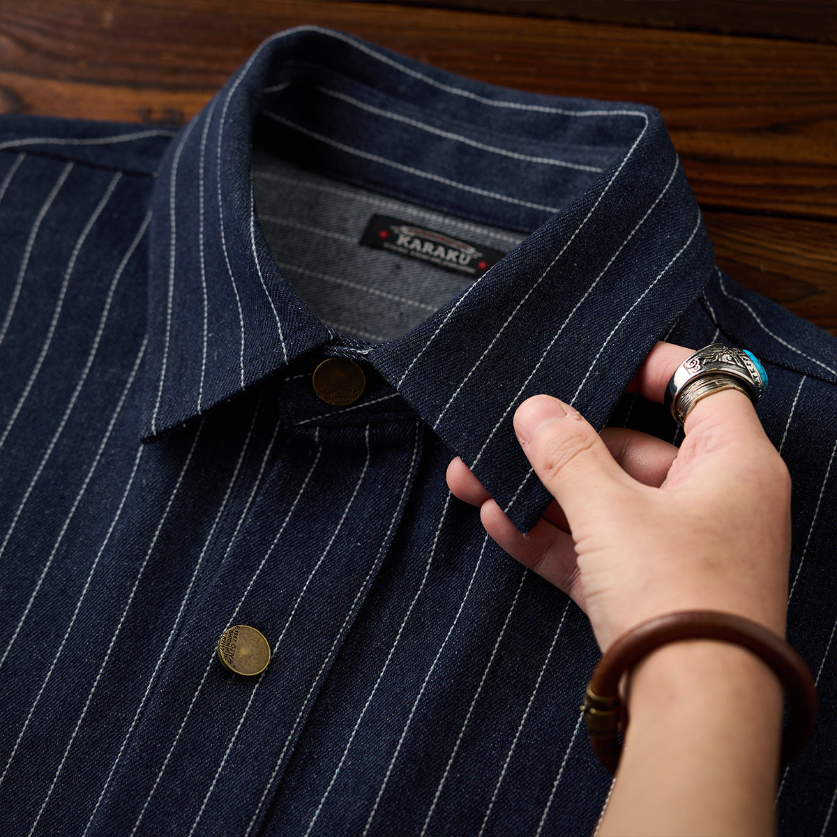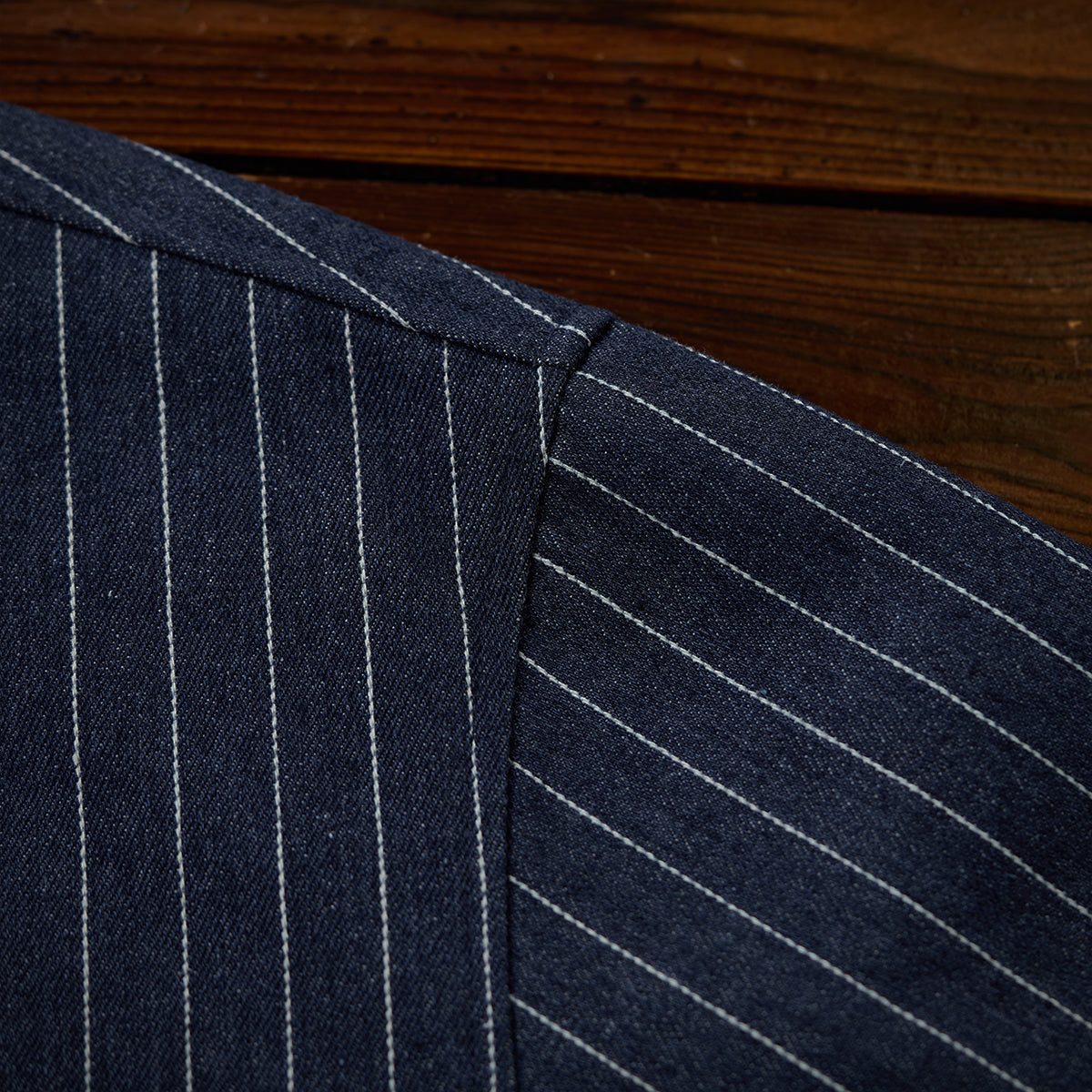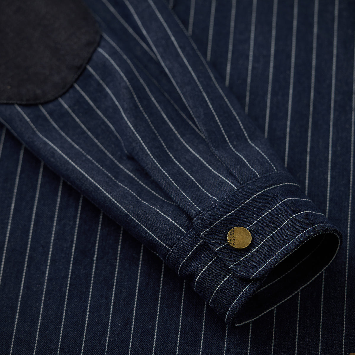 程よくハリのあるデニム生地に、細かなストライプ柄を乗せたプルオーバーシャツ。カジュアルながらもどこか上品さを感じさせる一本です。胸元にはハーフアンティーク調のボタンを採用し、デザインのアクセントに。丸い肘パッチが両袖に配置されて、デザイン性だけでなく機能性も考慮されています。軽い着心地ながらもしっかりとした耐久性があり、季節の変わり目にも使いやすい仕様です。一枚で着ても、インナーとして重ねてもサマになる万能デザイン。デニムの風合いとストライプの清潔感を兼ね備えた、大人のためのプルオーバーシャツです。