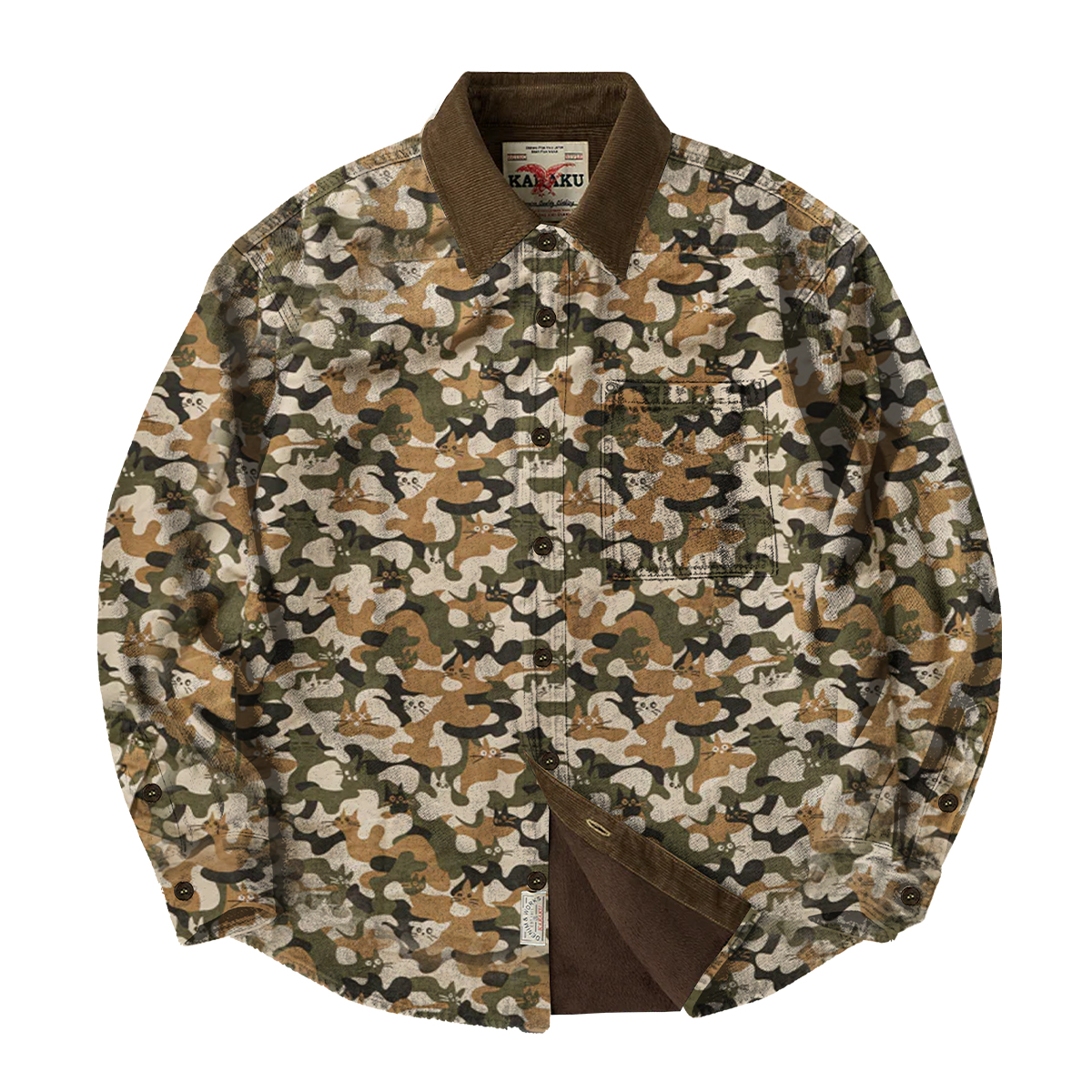 【予約】「猫が迷彩に溶け込む」総柄 コーデュロイ切替裏フリース長袖シャツ