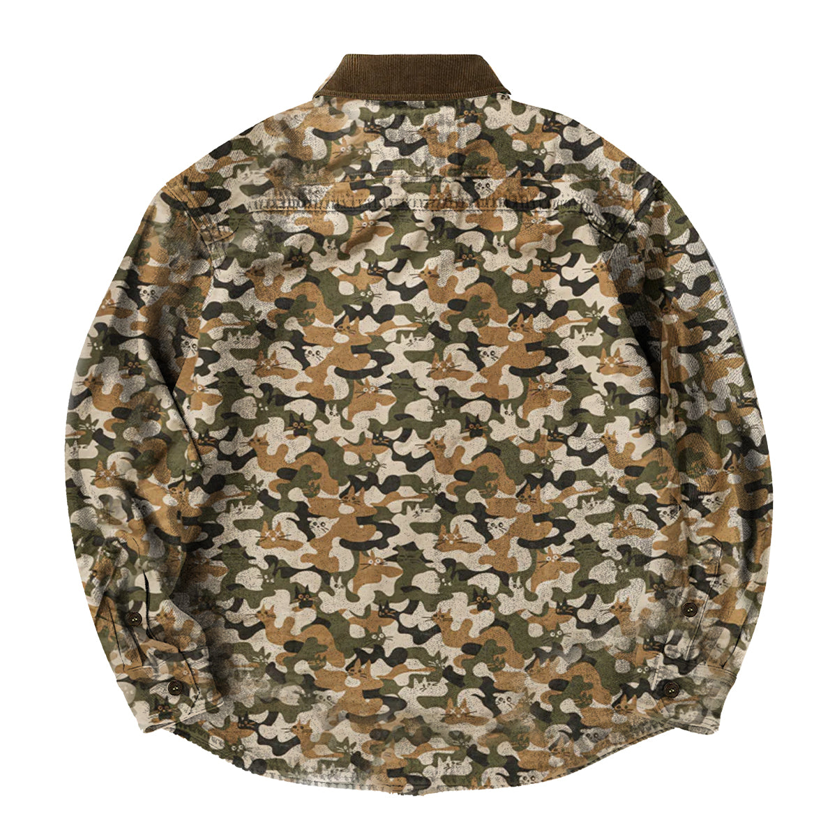 総柄でシャツ全体にデザインが施されており、前後どちらから見ても猫が隠れる迷彩パターンが楽しめます。ポケット部分にも柄が連続しており、デザインの一体感が保たれています。
