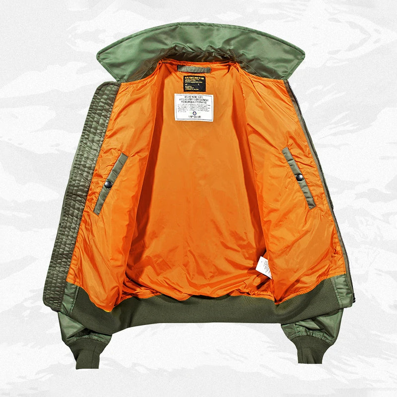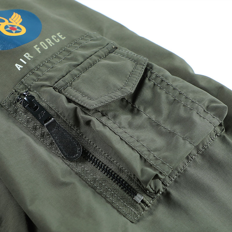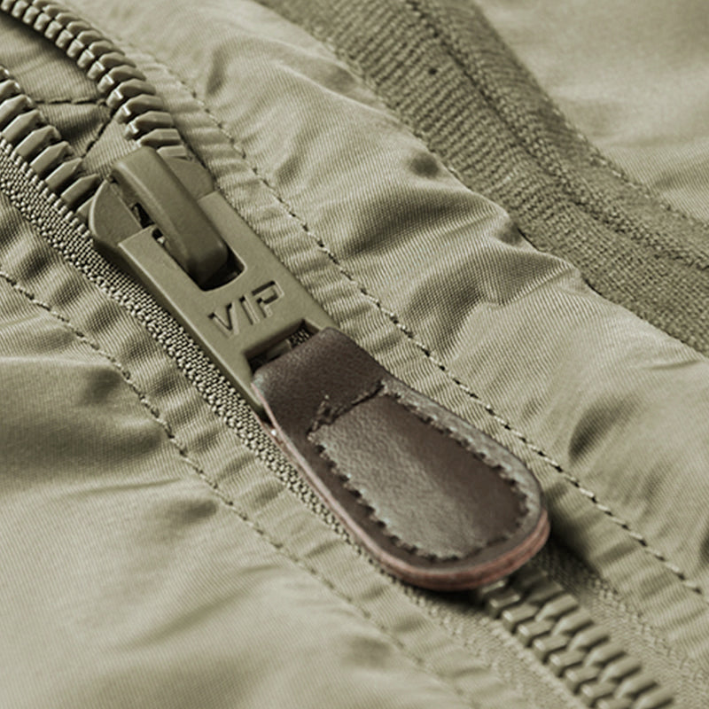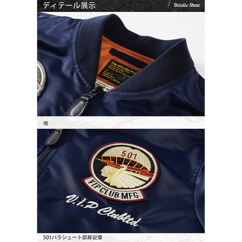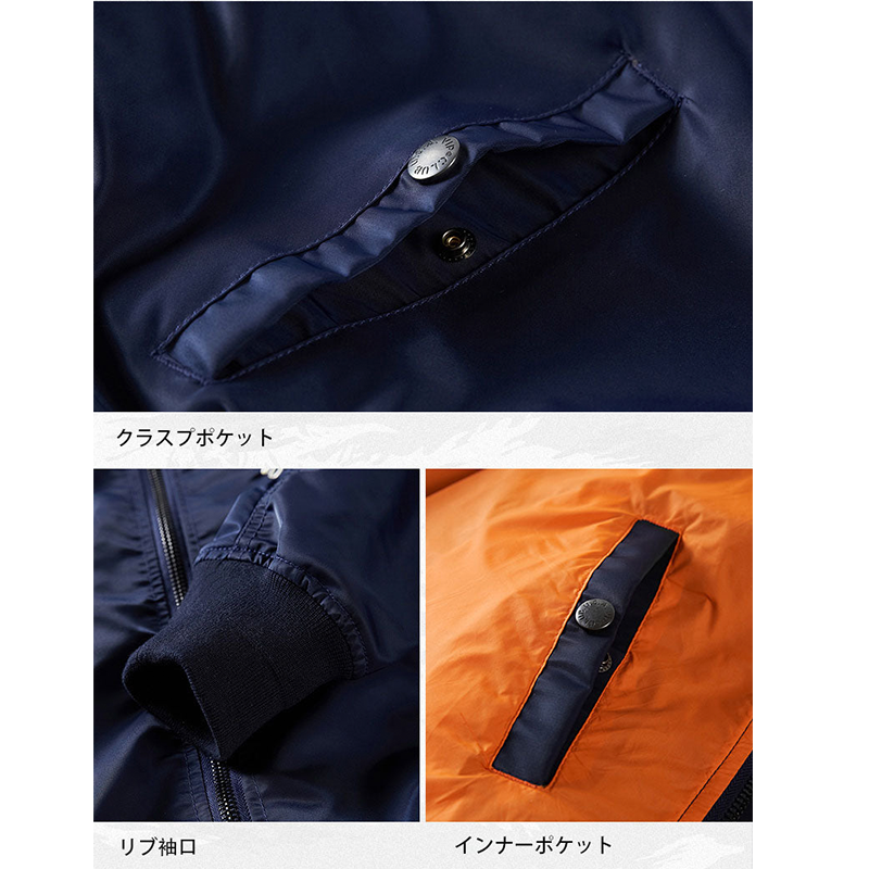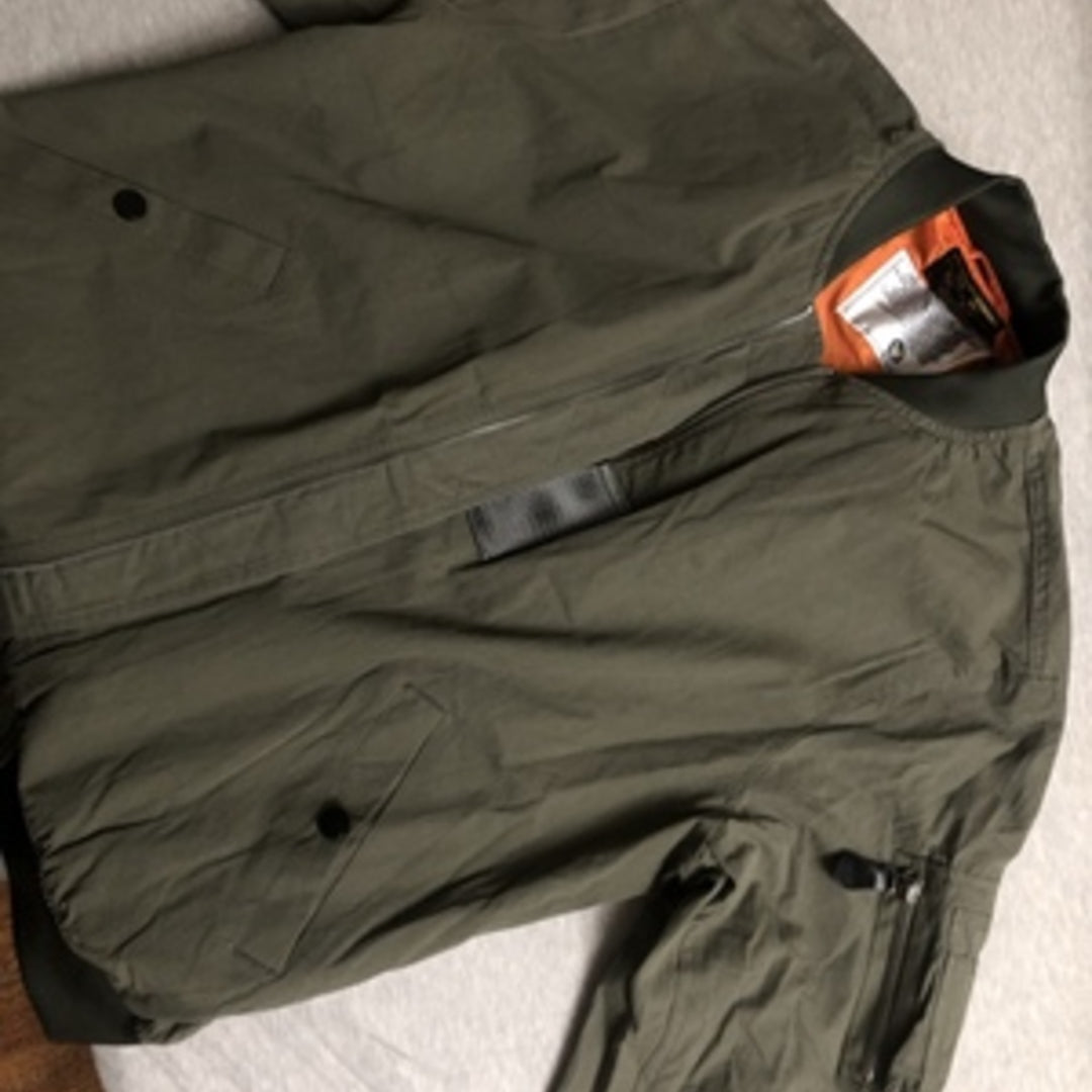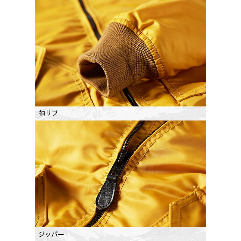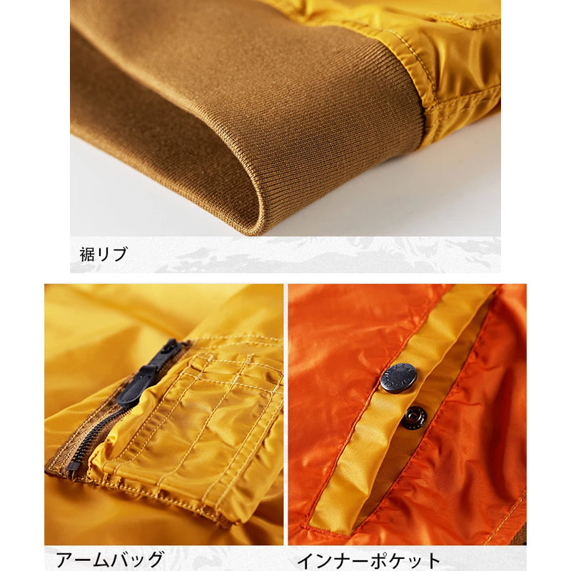 まずはそもそも論として、MA-1がどういうジャケットかについて軽く解説を。1944年に誕生したフライトジャケットB-15の後継モデルとして、1950年代初頭にアメリカ空軍で採用されたのがその始まりです。“インターミディエイトゾーン”と呼ばれる20℃から-10℃の気温で着用され、カラーはくすんだ緑であるセージグリーンが基本。飛行機のシートに座った際に生地が挟み込まれないよう、後ろ身頃を短めに設定しているのも特徴です。また、本来のMA-1は裏地に視認性の高いオレンジカラーを用いていますが、これは万一の墜落・脱出を想定しての仕様。裏返しに着ることで救出部隊の発見率を上げる役割を果たします。