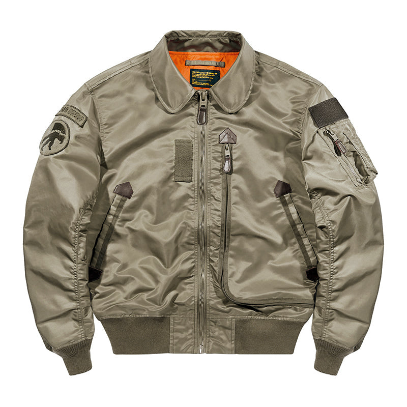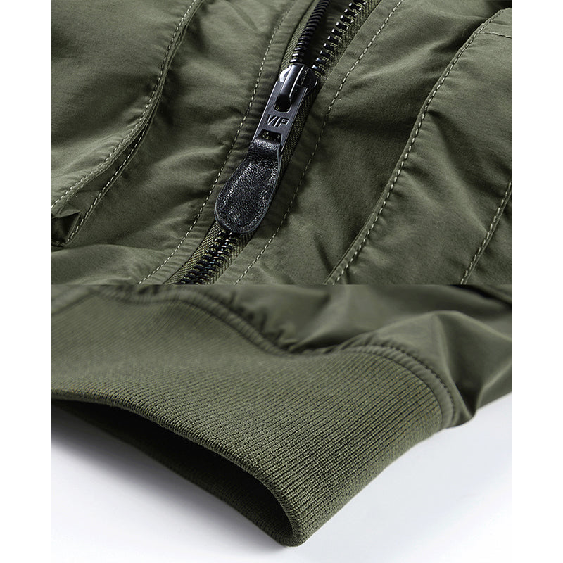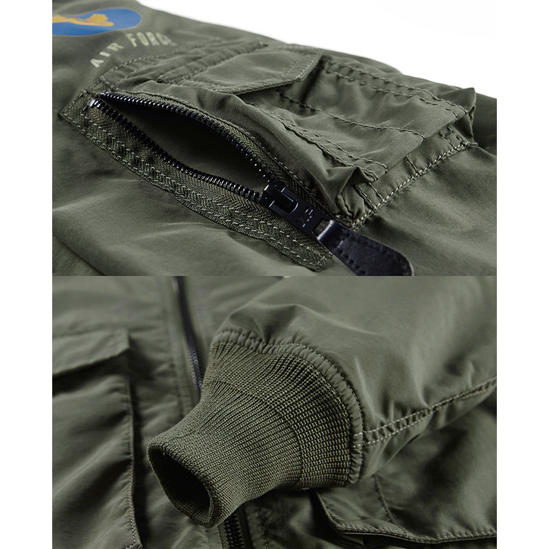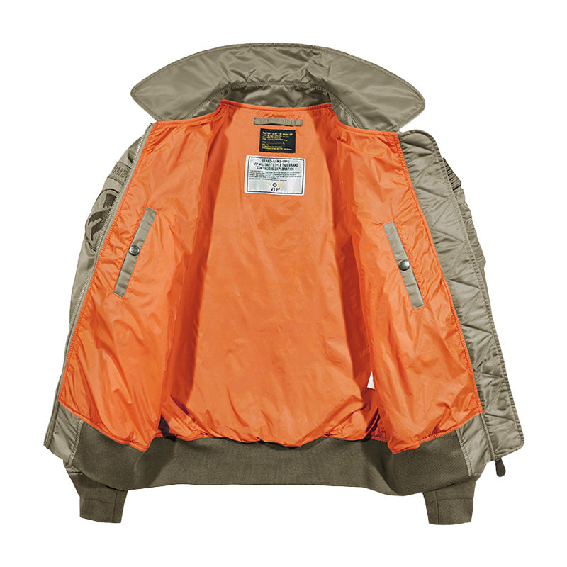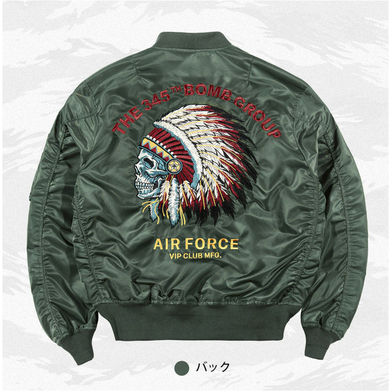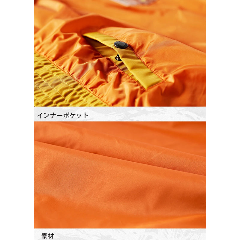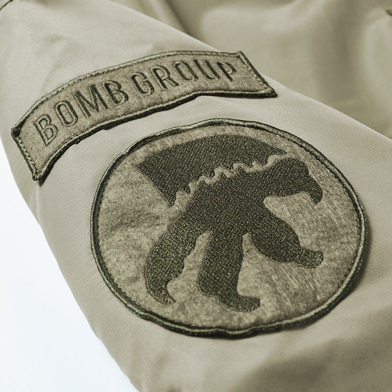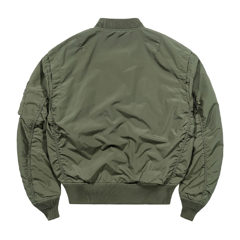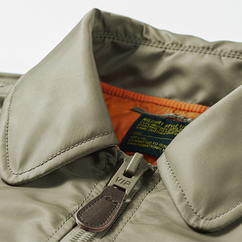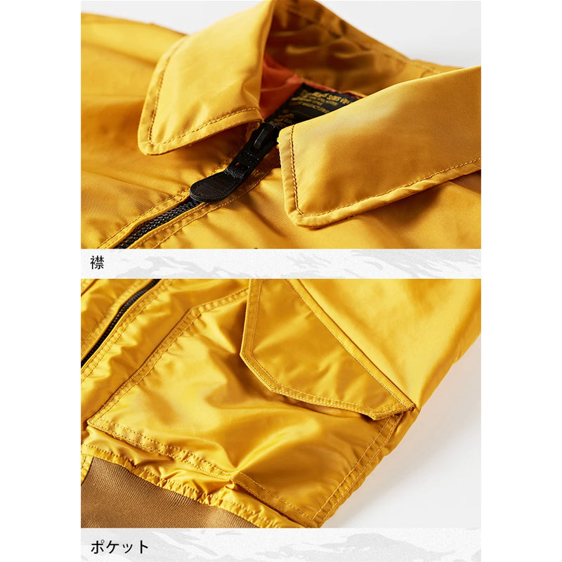 まずはそもそも論として、MA-1がどういうジャケットかについて軽く解説を。1944年に誕生したフライトジャケットB-15の後継モデルとして、1950年代初頭にアメリカ空軍で採用されたのがその始まりです。“インターミディエイトゾーン”と呼ばれる20℃から-10℃の気温で着用され、カラーはくすんだ緑であるセージグリーンが基本。飛行機のシートに座った際に生地が挟み込まれないよう、後ろ身頃を短めに設定しているのも特徴です。また、本来のMA-1は裏地に視認性の高いオレンジカラーを用いていますが、これは万一の墜落・脱出を想定しての仕様。裏返しに着ることで救出部隊の発見率を上げる役割を果たします。