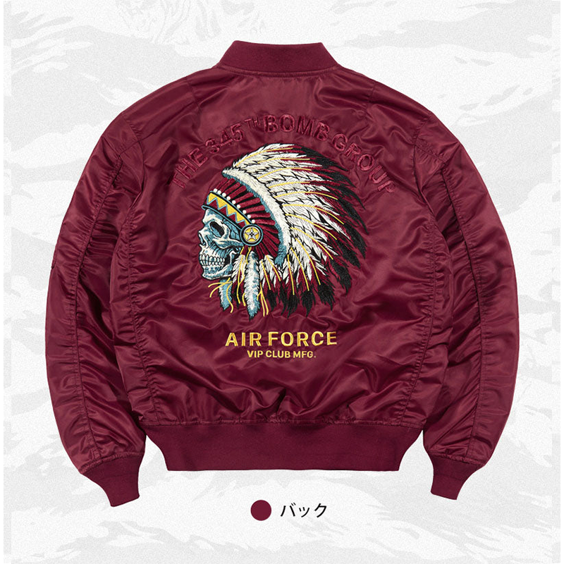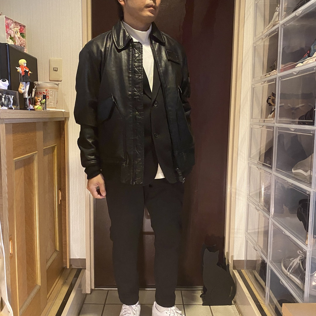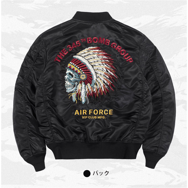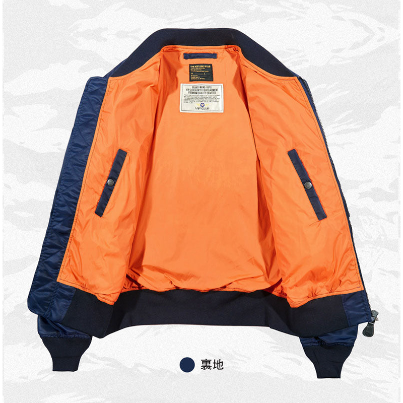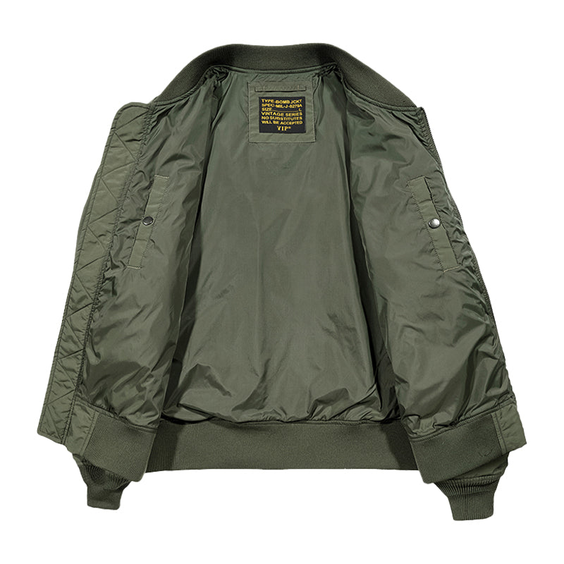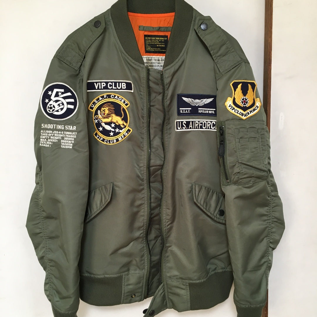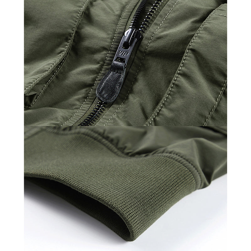 まずはそもそも論として、MA-1がどういうジャケットかについて軽く解説を。1944年に誕生したフライトジャケットB-15の後継モデルとして、1950年代初頭にアメリカ空軍で採用されたのがその始まりです。“インターミディエイトゾーン”と呼ばれる20℃から-10℃の気温で着用され、カラーはくすんだ緑であるセージグリーンが基本。飛行機のシートに座った際に生地が挟み込まれないよう、後ろ身頃を短めに設定しているのも特徴です。また、本来のMA-1は裏地に視認性の高いオレンジカラーを用いていますが、これは万一の墜落・脱出を想定しての仕様。裏返しに着ることで救出部隊の発見率を上げる役割を果たします。