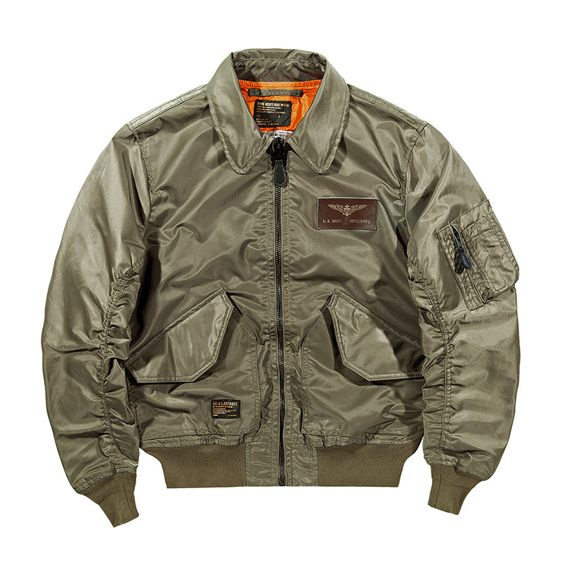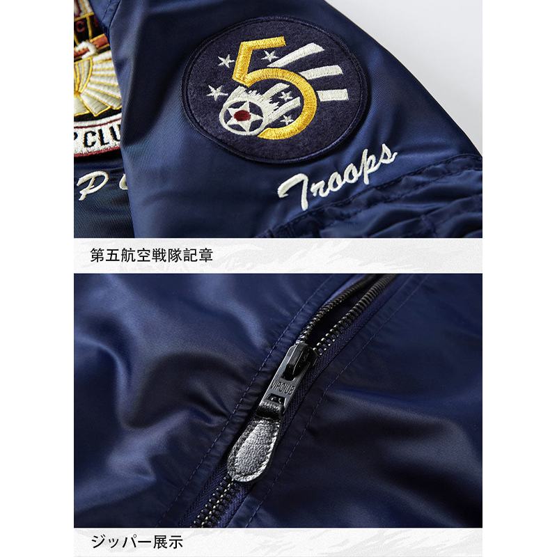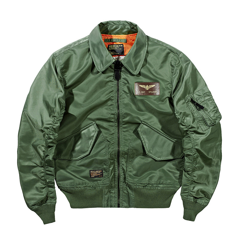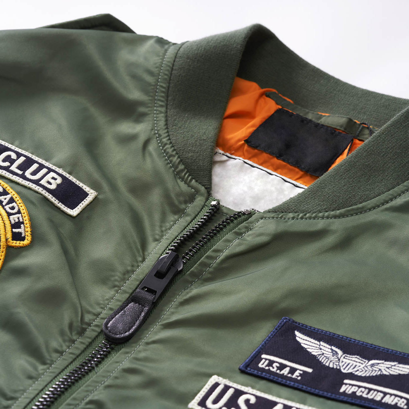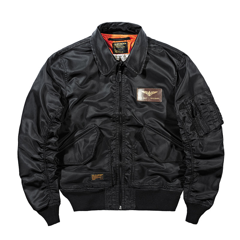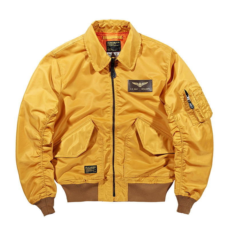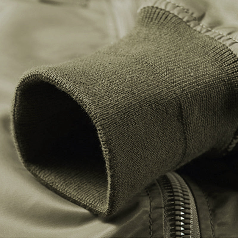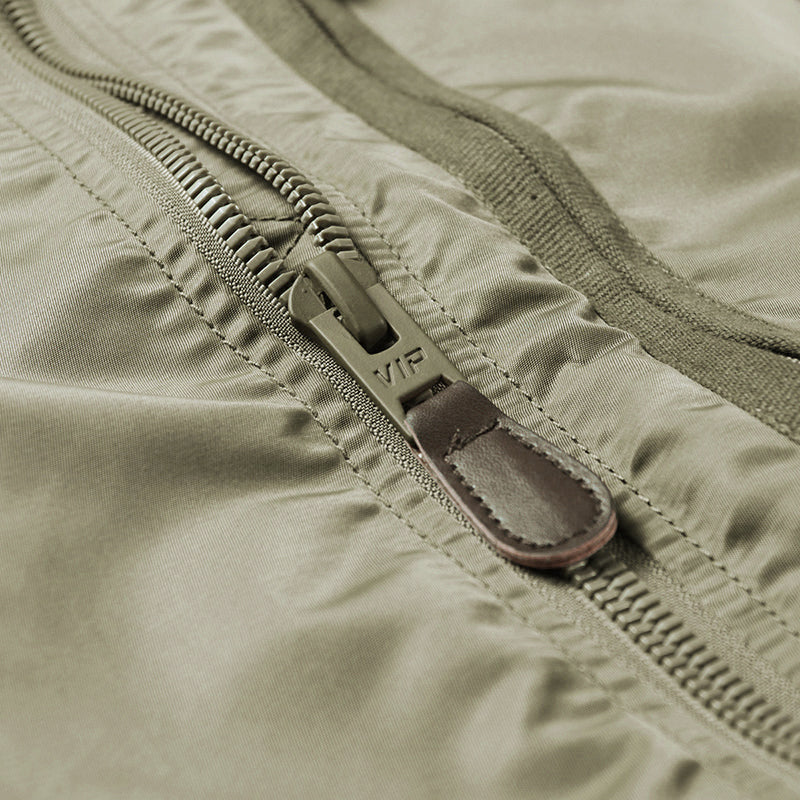 まずはそもそも論として、MA-1がどういうジャケットかについて軽く解説を。1944年に誕生したフライトジャケットB-15の後継モデルとして、1950年代初頭にアメリカ空軍で採用されたのがその始まりです。“インターミディエイトゾーン”と呼ばれる20℃から-10℃の気温で着用され、カラーはくすんだ緑であるセージグリーンが基本。飛行機のシートに座った際に生地が挟み込まれないよう、後ろ身頃を短めに設定しているのも特徴です。また、本来のMA-1は裏地に視認性の高いオレンジカラーを用いていますが、これは万一の墜落・脱出を想定しての仕様。裏返しに着ることで救出部隊の発見率を上げる役割を果たします。