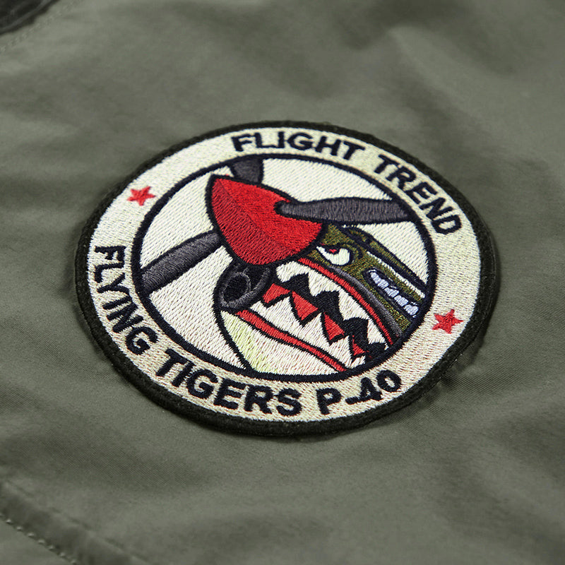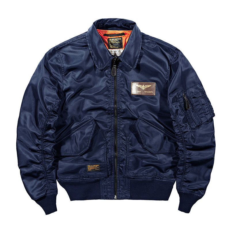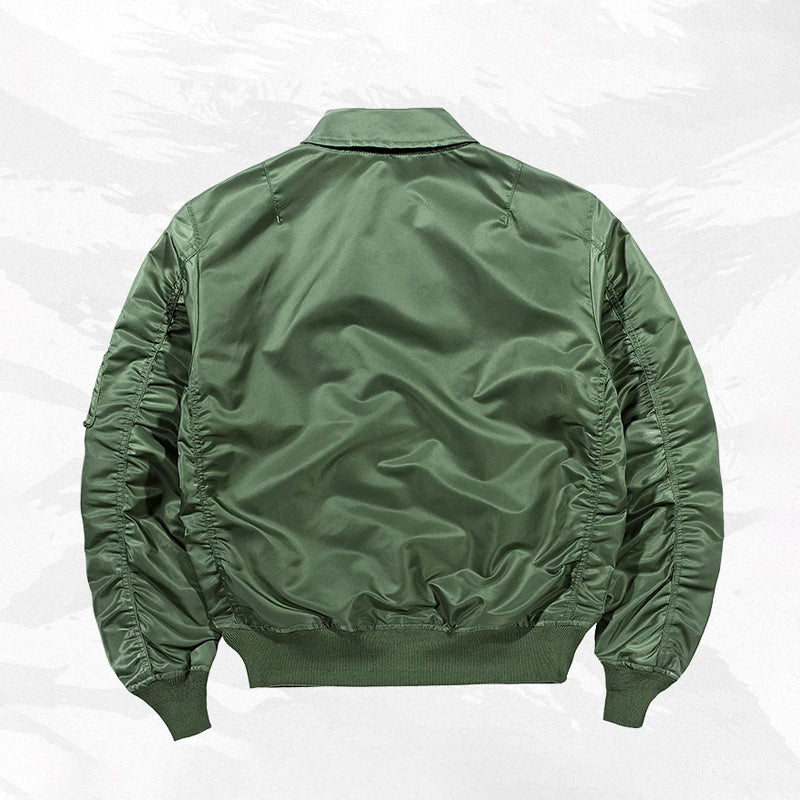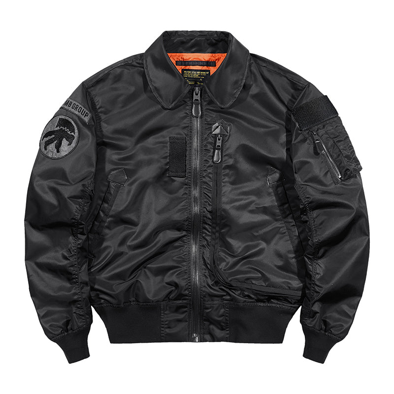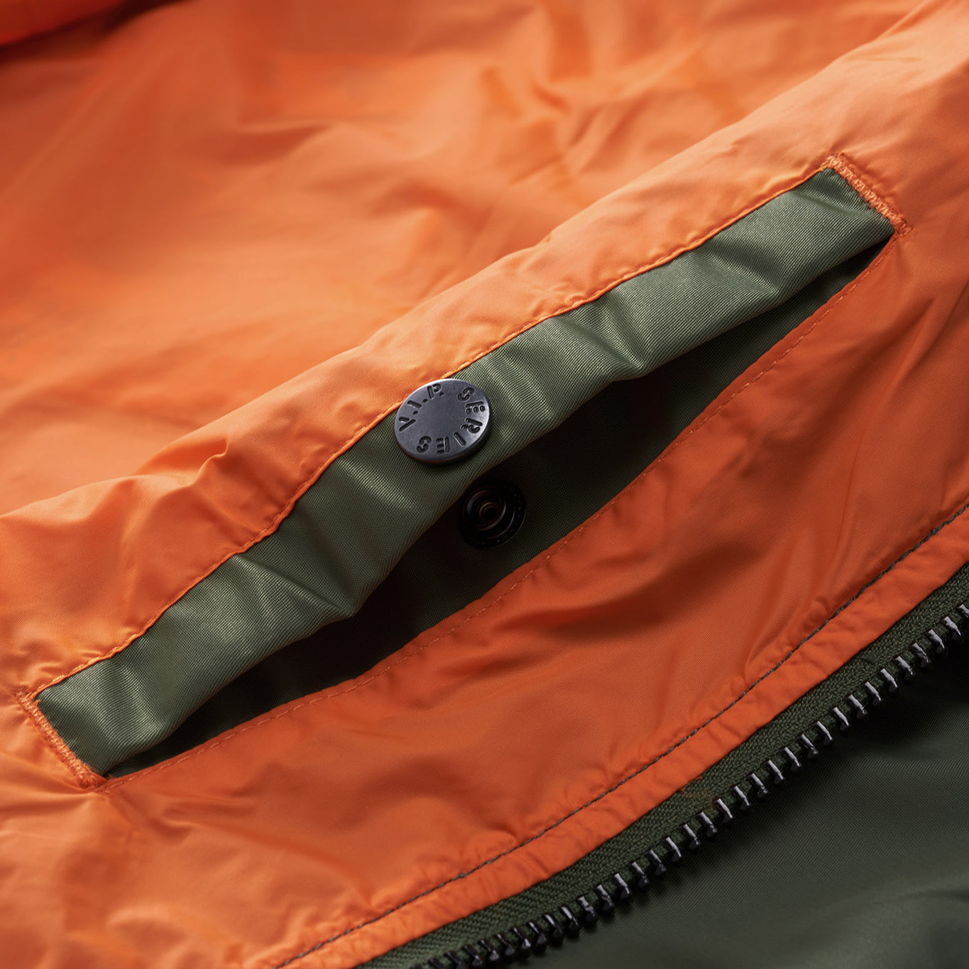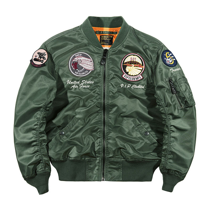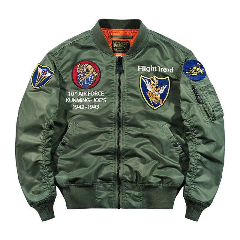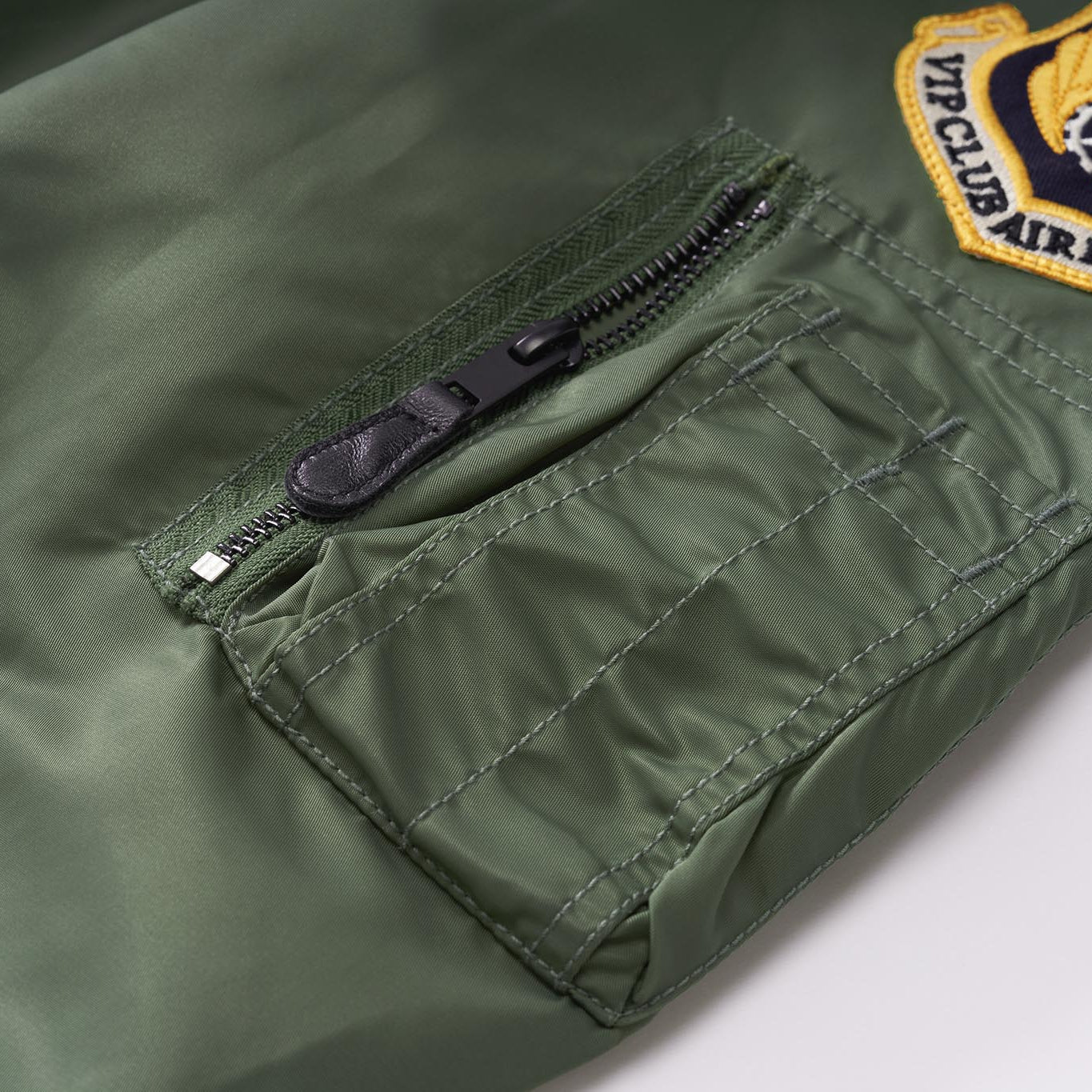 まずはそもそも論として、MA-1がどういうジャケットかについて軽く解説を。1944年に誕生したフライトジャケットB-15の後継モデルとして、1950年代初頭にアメリカ空軍で採用されたのがその始まりです。“インターミディエイトゾーン”と呼ばれる20℃から-10℃の気温で着用され、カラーはくすんだ緑であるセージグリーンが基本。飛行機のシートに座った際に生地が挟み込まれないよう、後ろ身頃を短めに設定しているのも特徴です。また、本来のMA-1は裏地に視認性の高いオレンジカラーを用いていますが、これは万一の墜落・脱出を想定しての仕様。裏返しに着ることで救出部隊の発見率を上げる役割を果たします。