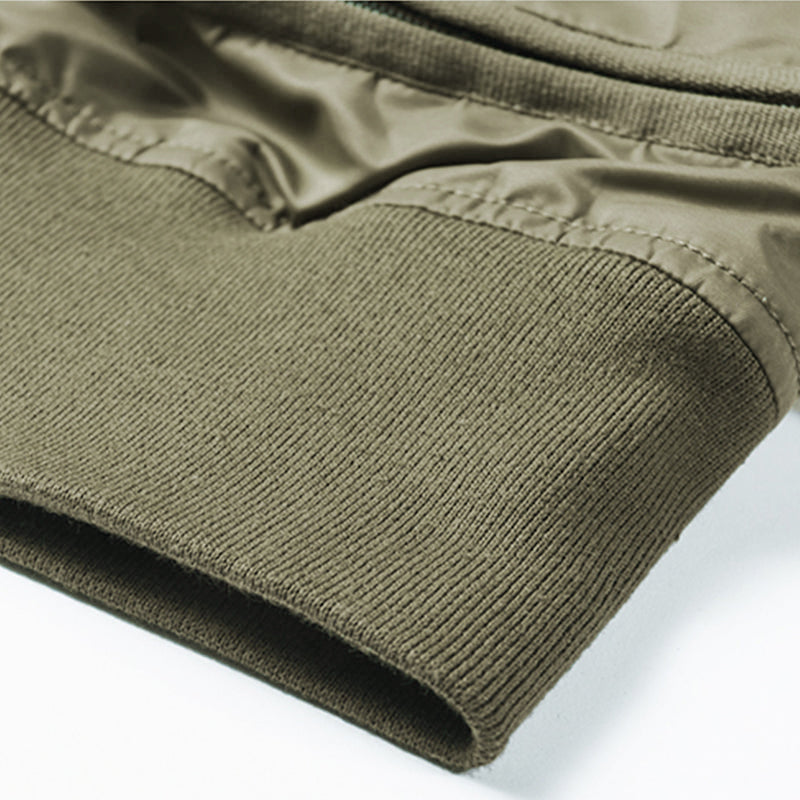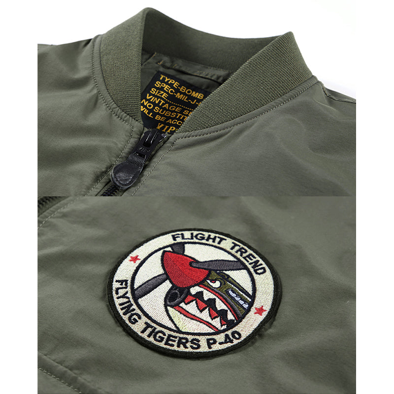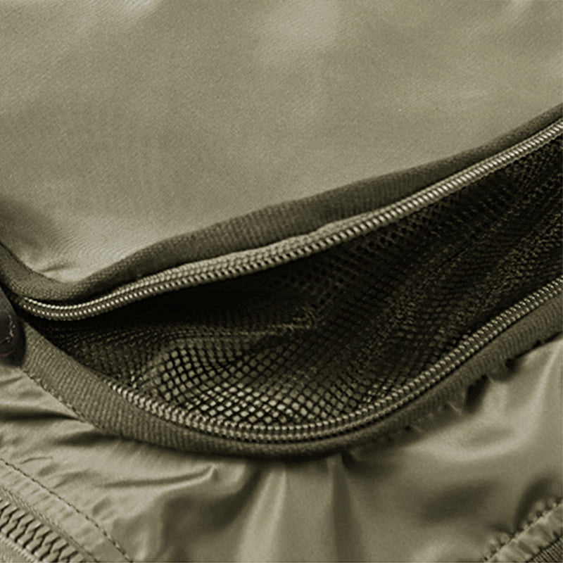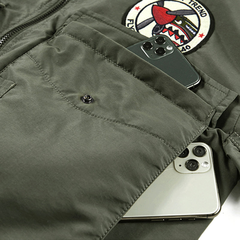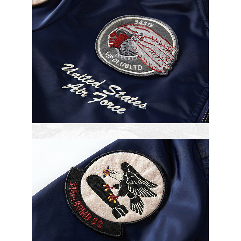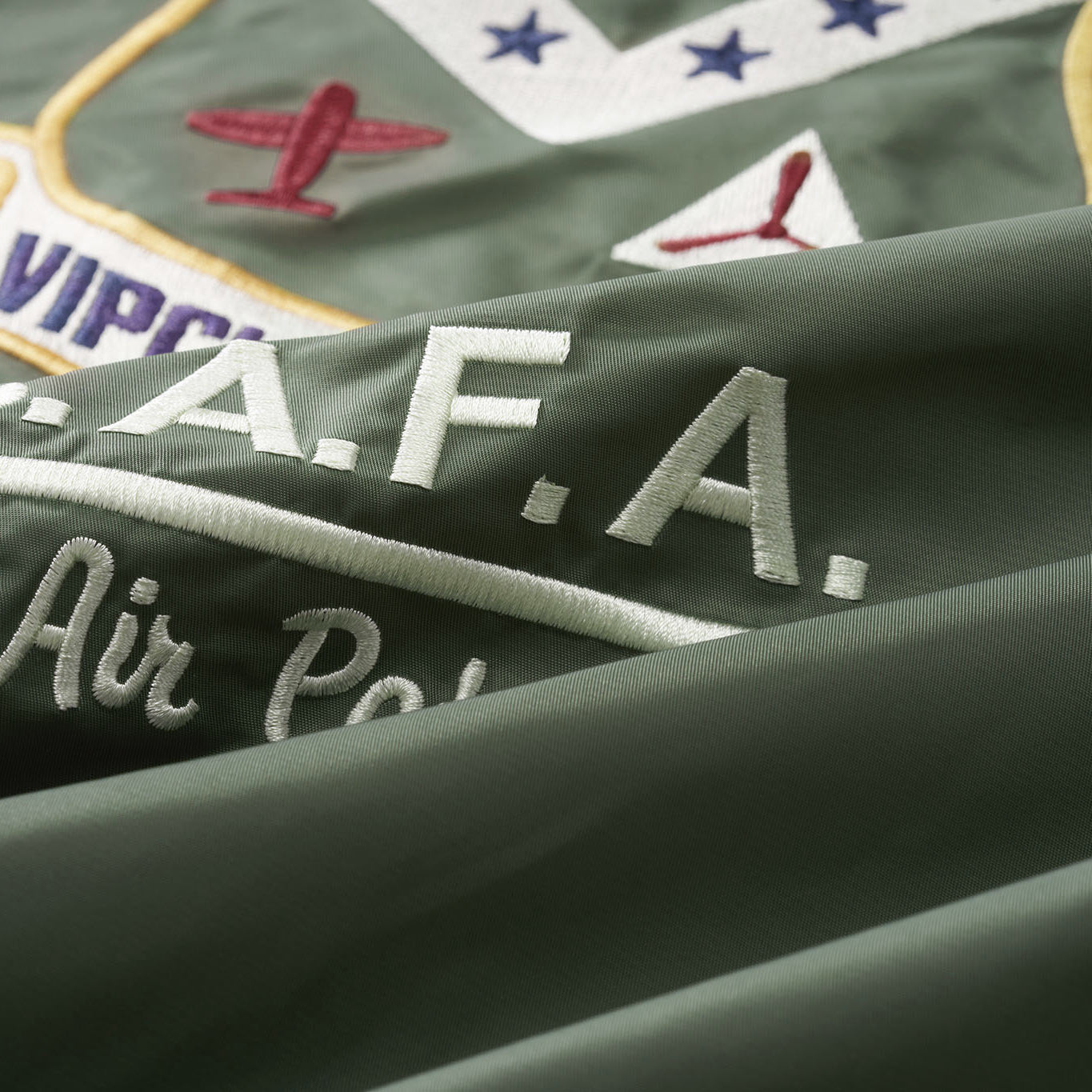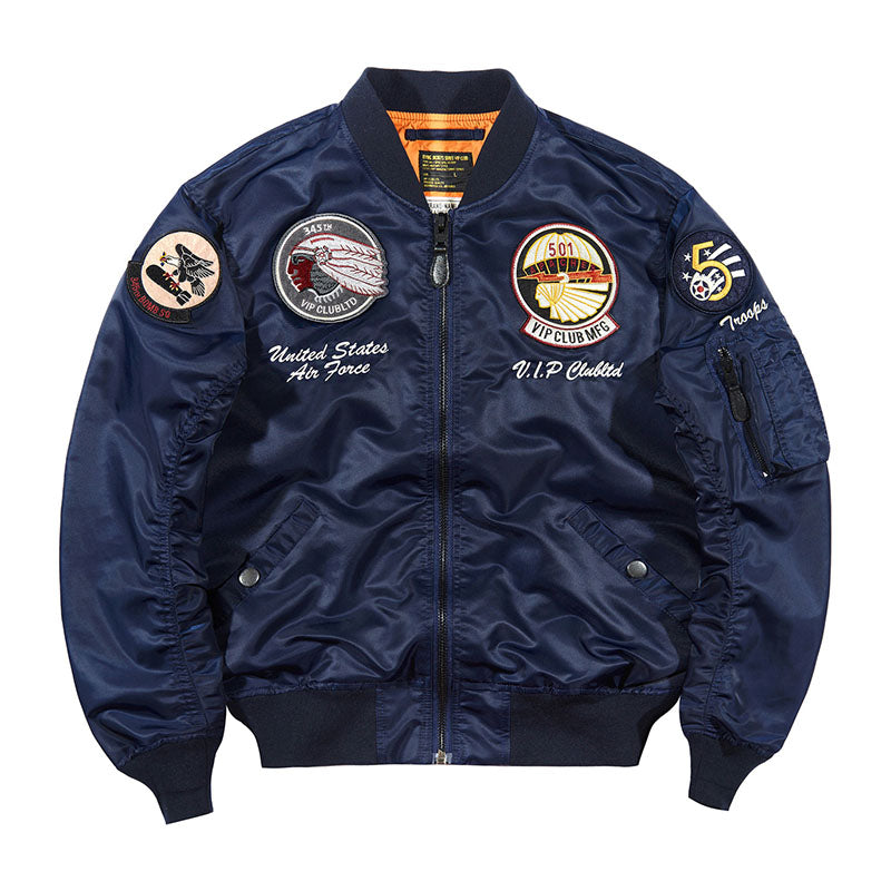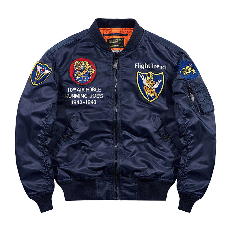まずはそもそも論として、MA-1がどういうジャケットかについて軽く解説を。1944年に誕生したフライトジャケットB-15の後継モデルとして、1950年代初頭にアメリカ空軍で採用されたのがその始まりです。“インターミディエイトゾーン”と呼ばれる20℃から-10℃の気温で着用され、カラーはくすんだ緑であるセージグリーンが基本。飛行機のシートに座った際に生地が挟み込まれないよう、後ろ身頃を短めに設定しているのも特徴です。また、本来のMA-1は裏地に視認性の高いオレンジカラーを用いていますが、これは万一の墜落・脱出を想定しての仕様。裏返しに着ることで救出部隊の発見率を上げる役割を果たします。