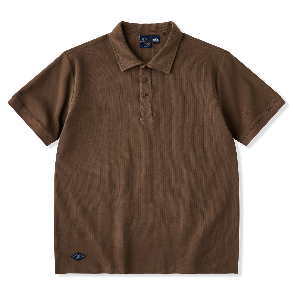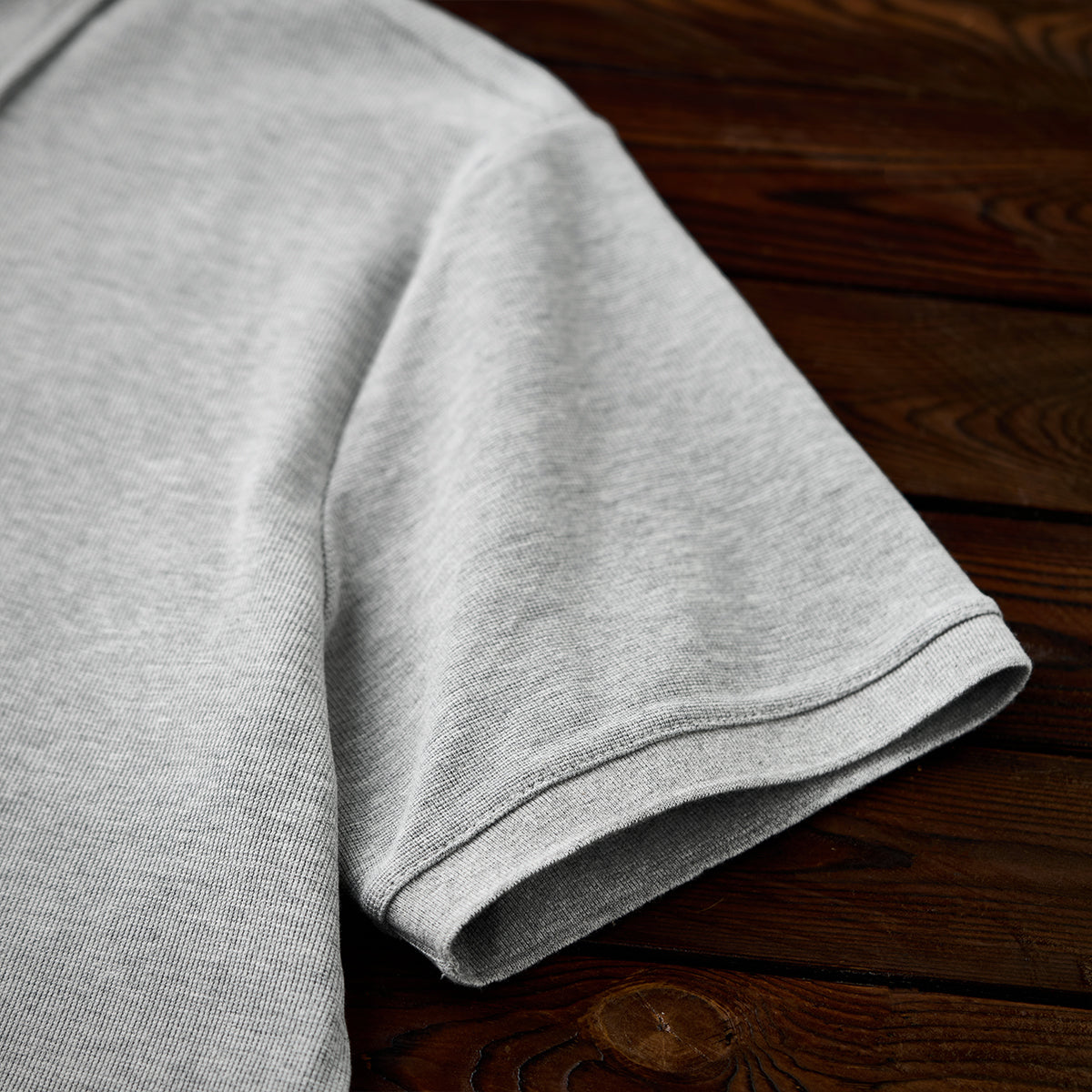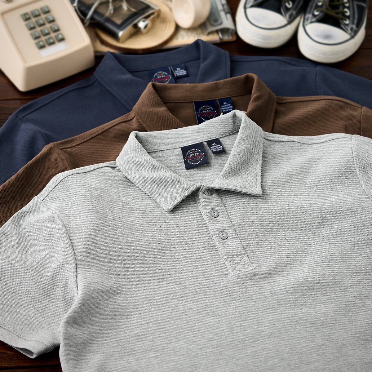 ポロのクラシックな襟元とボタンが特徴で、カジュアルながらも少しフォーマルな印象を与え、特に襟が強調されて、スタイル感をアップさせている。