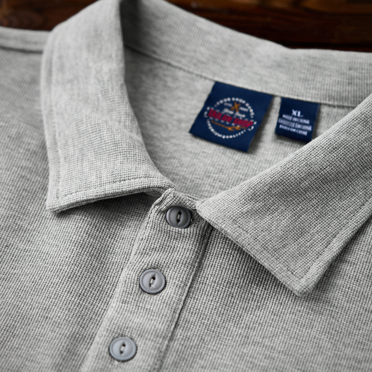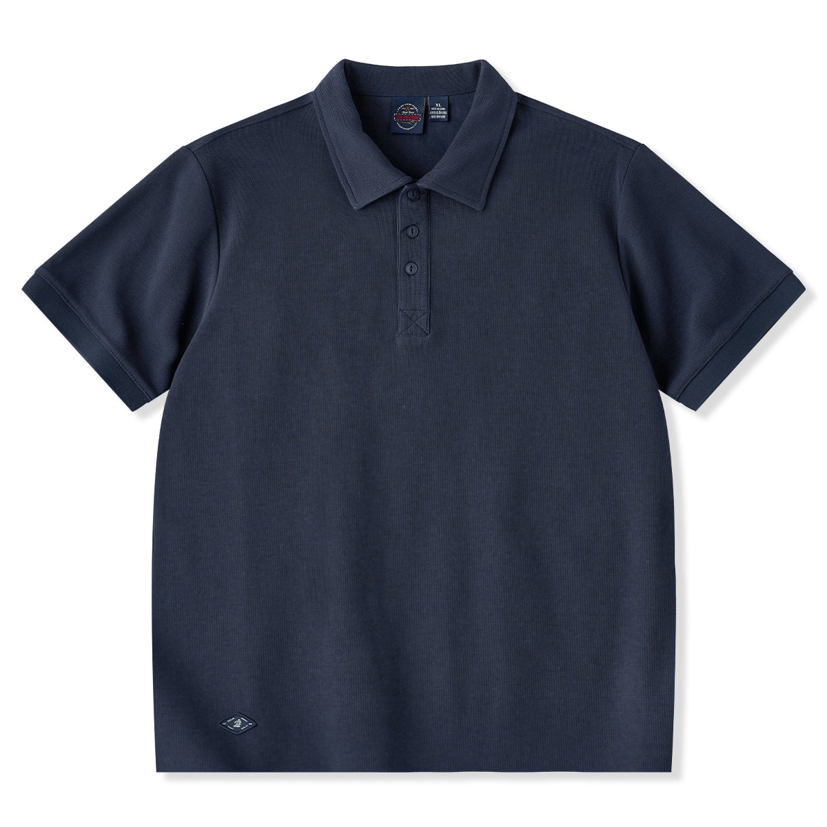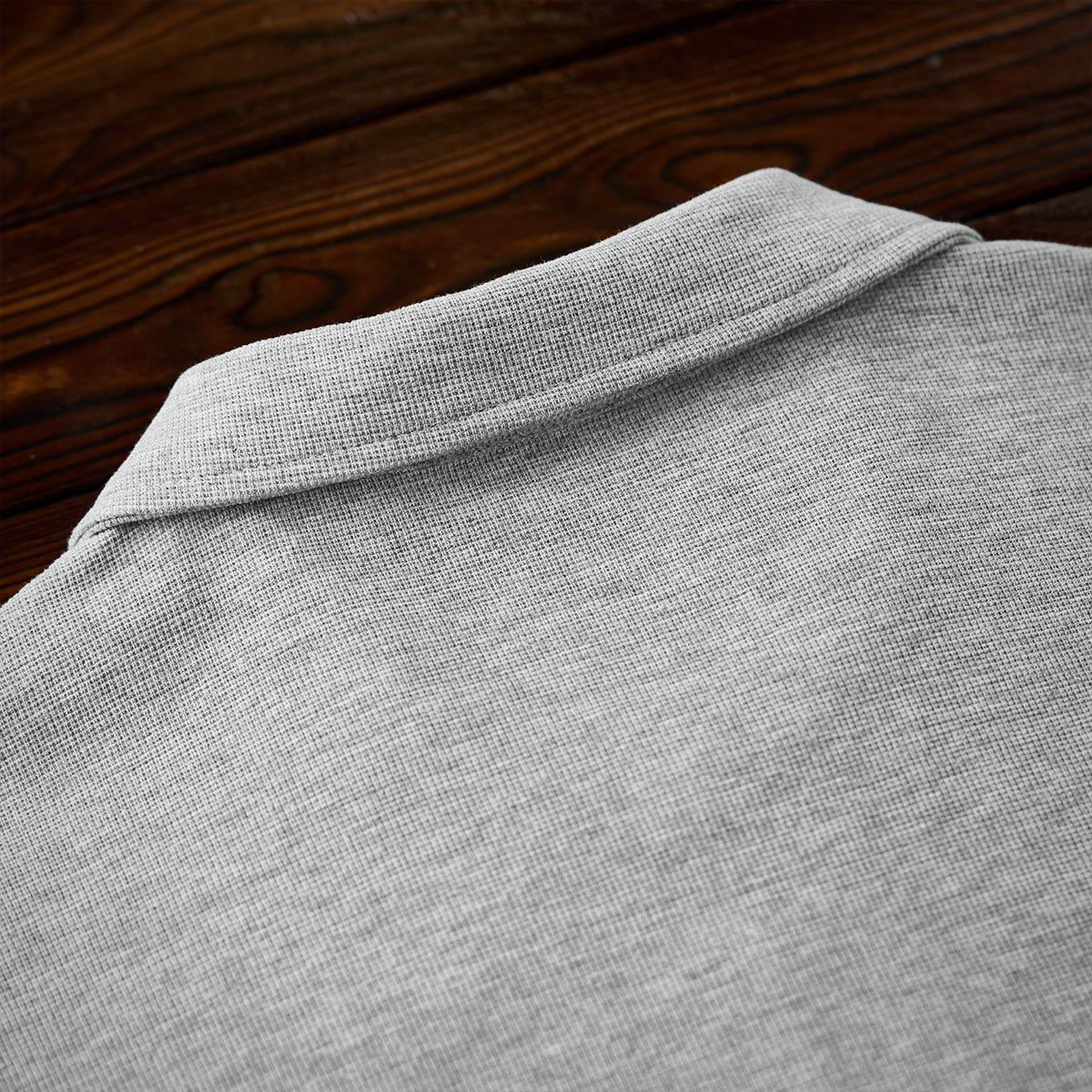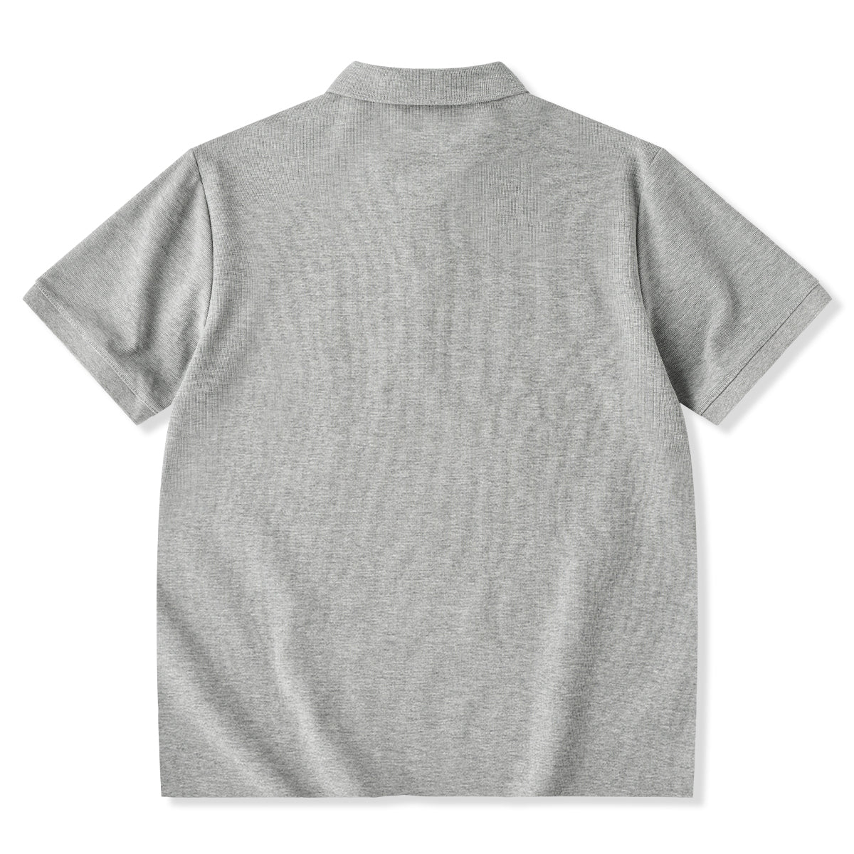 ポロのクラシックな襟元とボタンが特徴で、カジュアルながらも少しフォーマルな印象を与え、特に襟が強調されて、スタイル感をアップさせている。