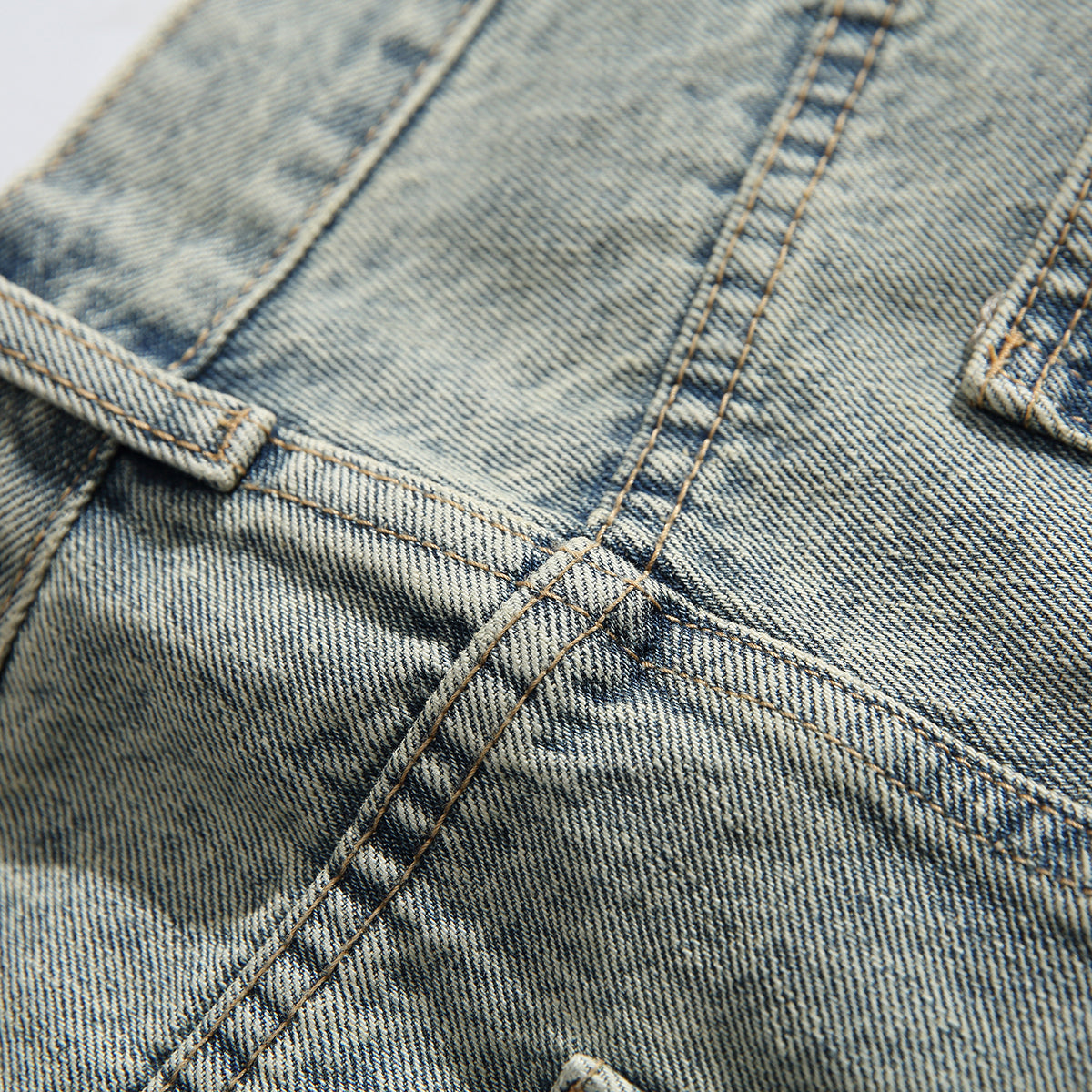 デニム素材を使用、耐久性が高く、使い込むほどに独特の風合いが増していく特性がある。ヴィンテージ感を引き立てるウォッシュ加工が全体に施されて、色落ちが自然で、リアルな経年変化を再現している。