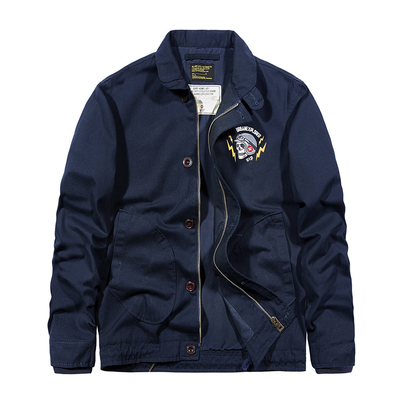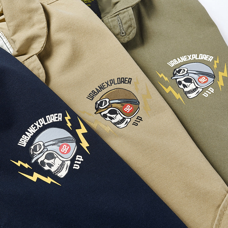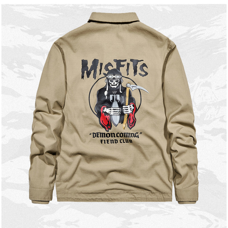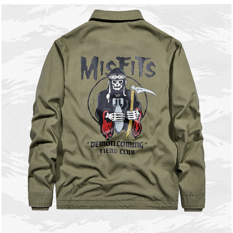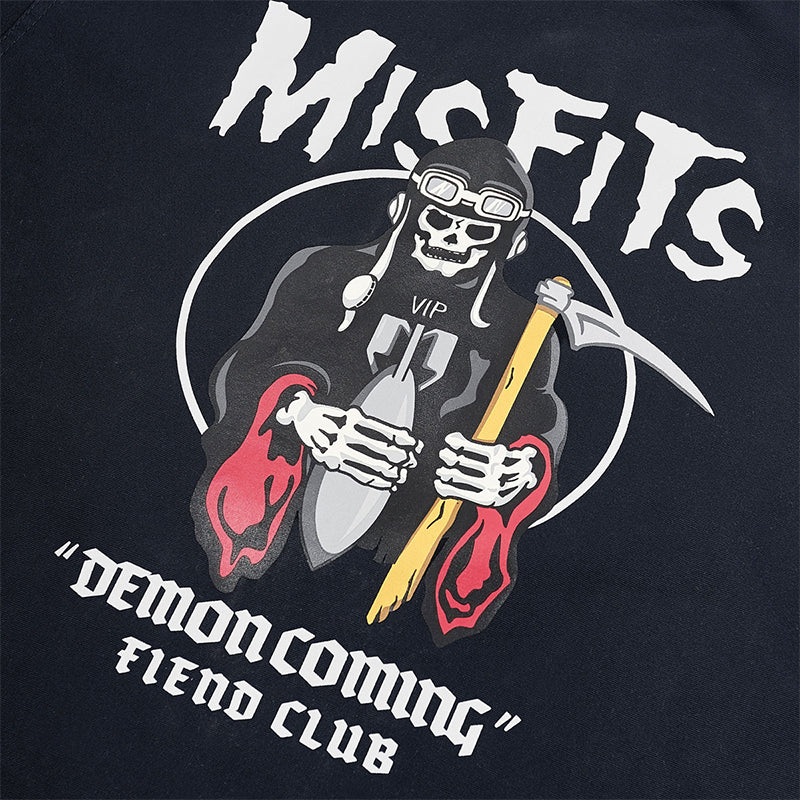 左胸元には「ガイコツで遊ぶいたずらな猫」の刺繡デザインが施されている。