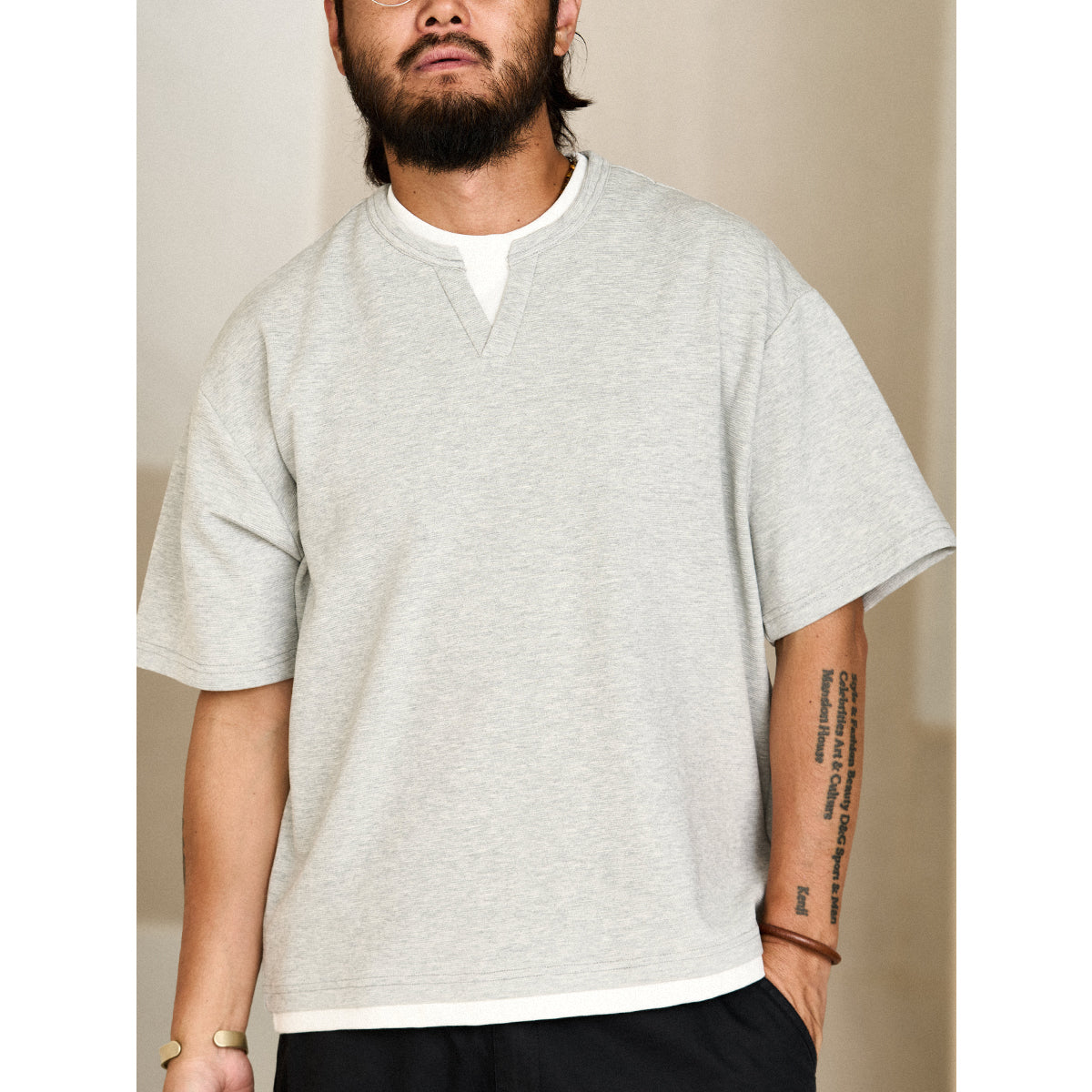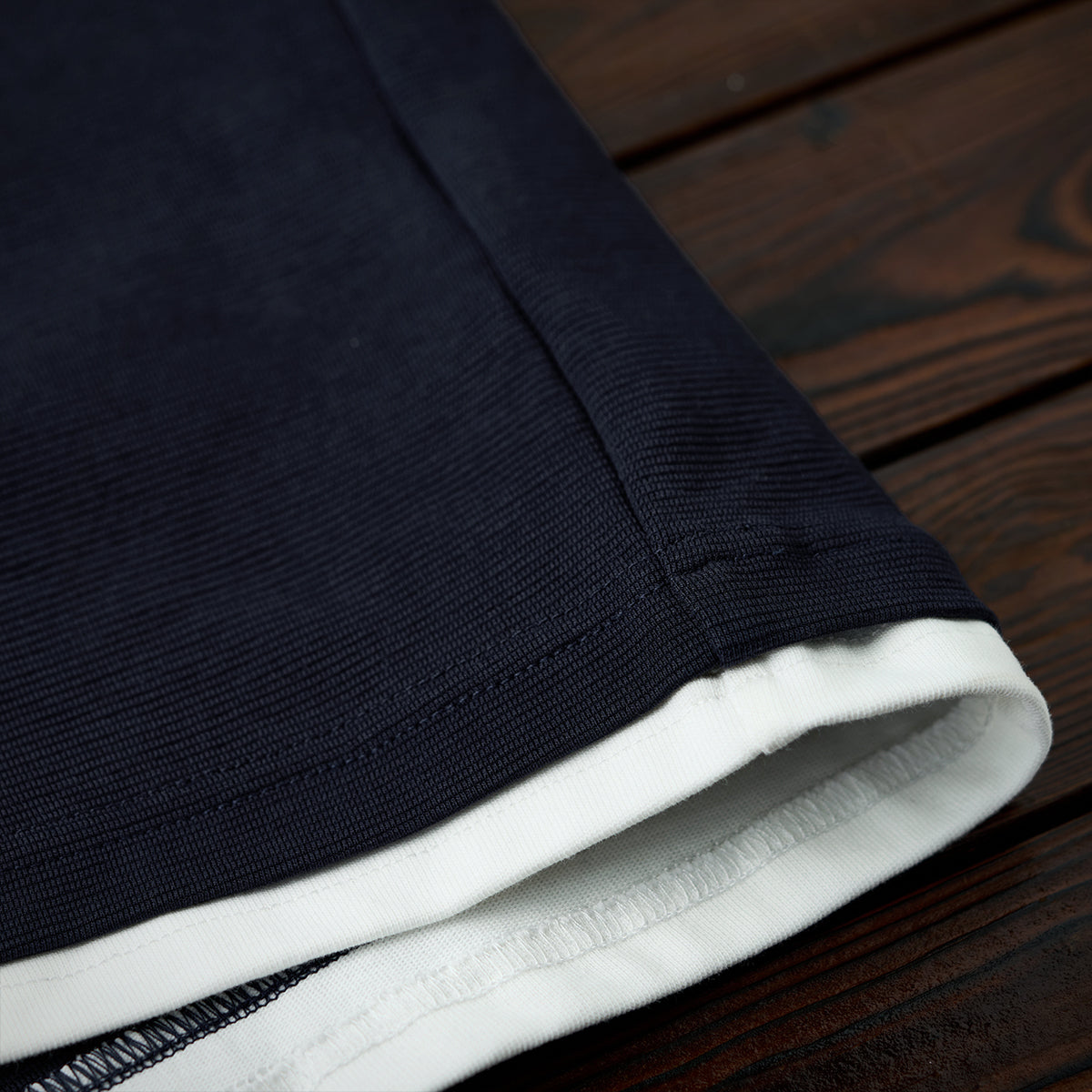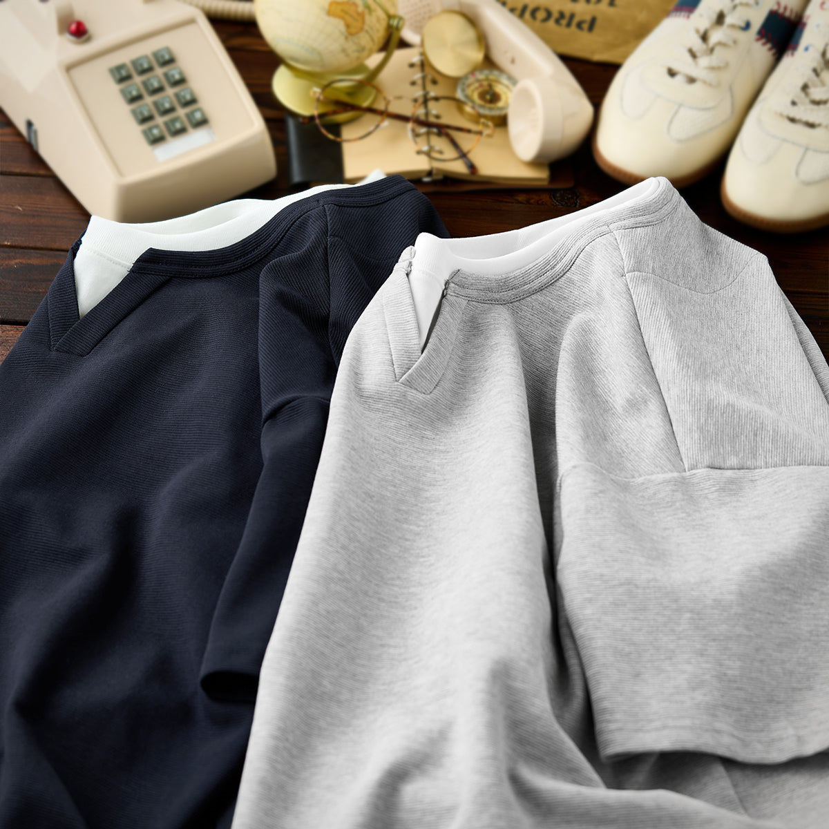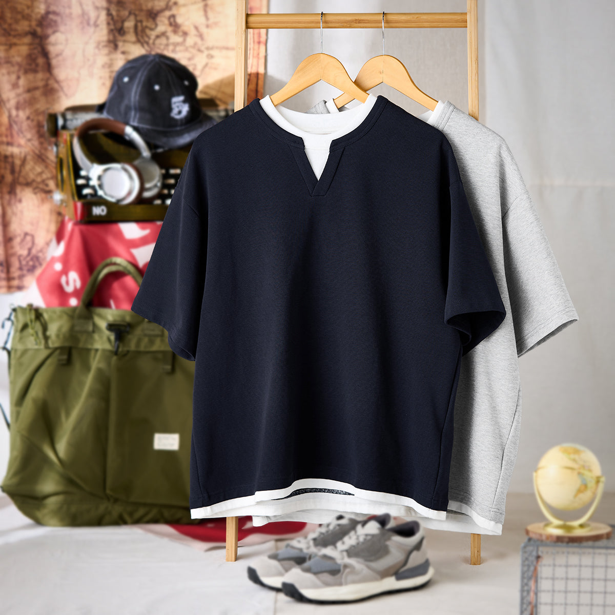 首元に浅いV字の切り込みを加えることで、アクセントをプラス。首元と裾部分に、インナーシャツを重ね着したように見えるデザインを採用。実際には1枚のTeeであり、重ね着による不快感を軽減しつつ、スタイリッシュなレイヤード効果を楽しめる。